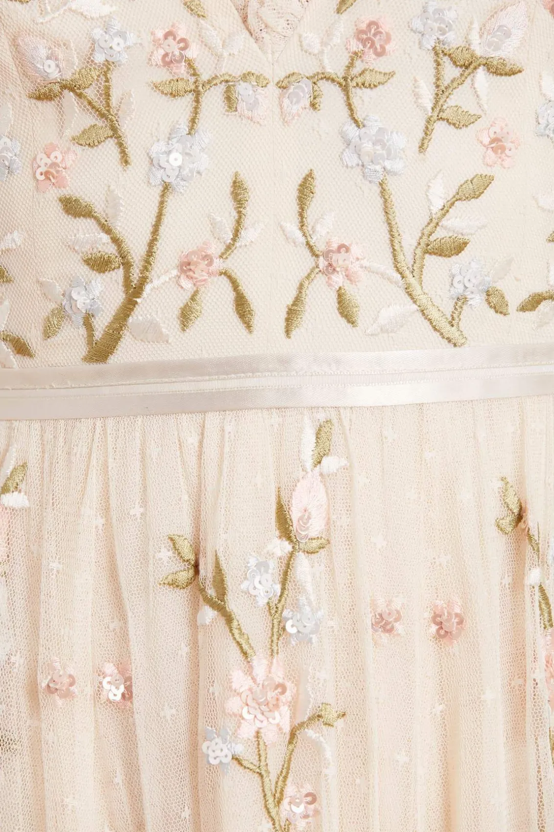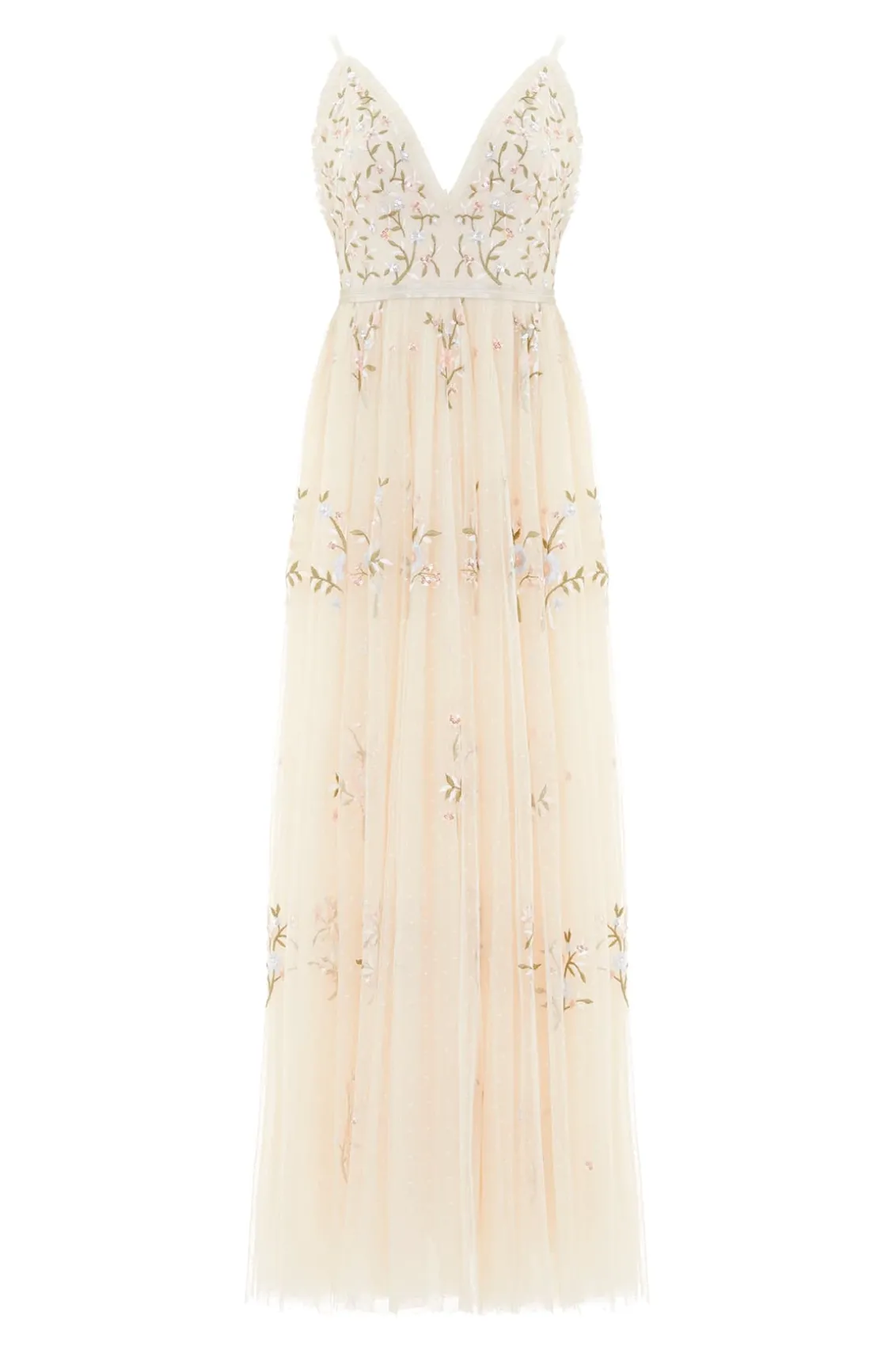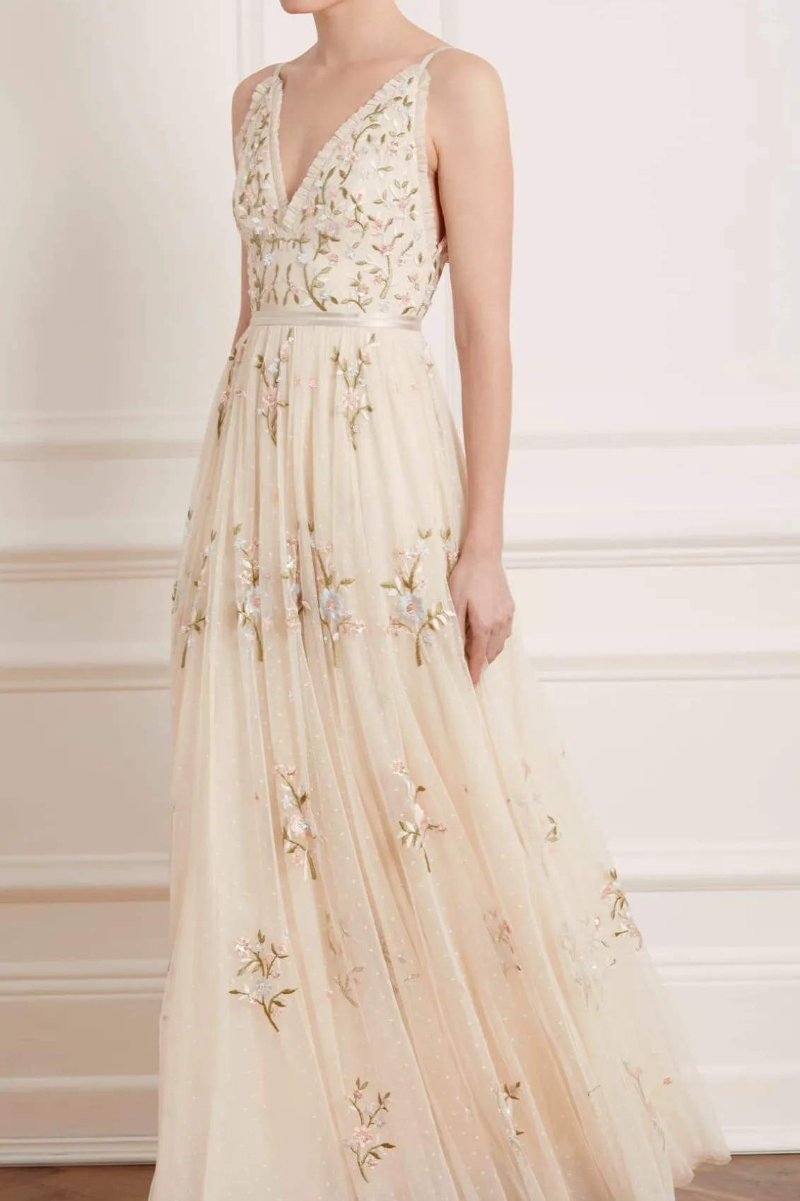 – Form fitted bodice with a plunging neckline and a multi-layered full skirt- Delicate dry clean only
