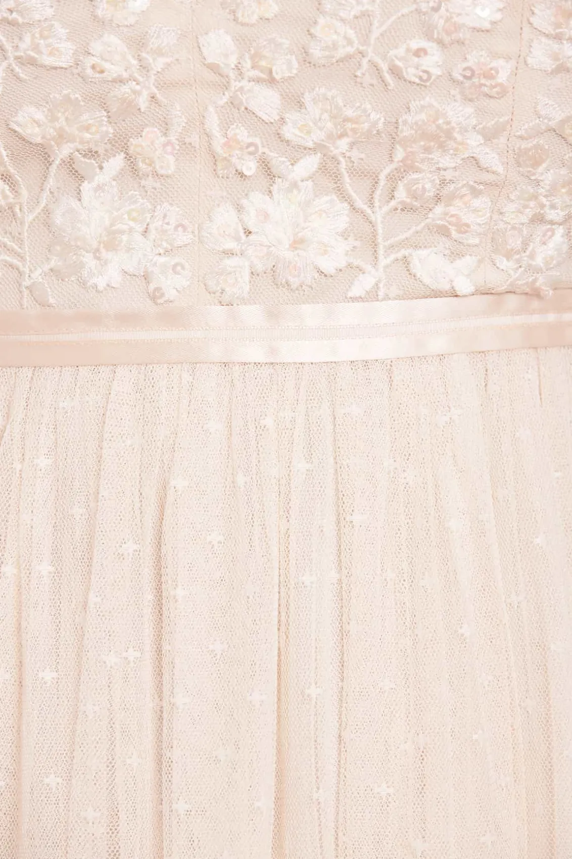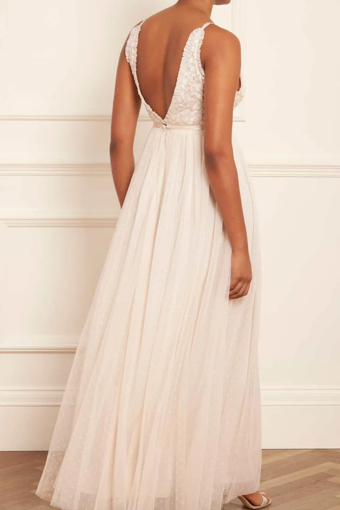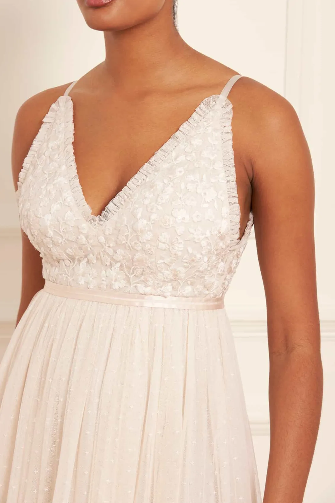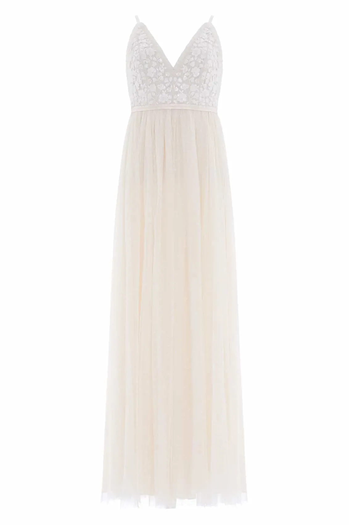 The Posy Cami Gown in Cream. This gown is adorned beautifully with clusters of intricate floral bouquets and shimmering sequins for a sparkling effect. The skirt is developed with layers of signature Needle & Thread soft tulle for a romantic look. A simple but yet striking gown you’ll forever treasure.