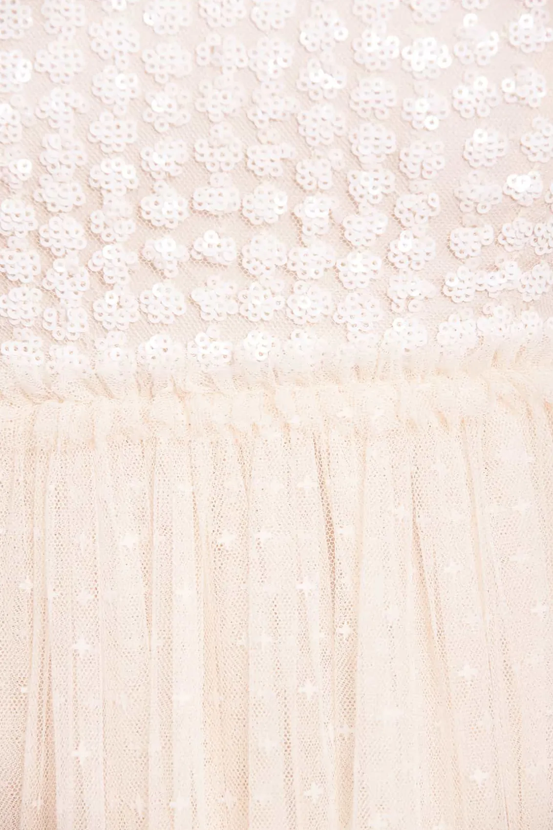 The Raindrop Bodice One Shoulder Ankle Gown in Cream / Cream. The bodice of this gown is adorned with an enchanting sequin artwork. The artwork is designed with delicate shimmering polka dot sequins in a linear formation capturing the essence of glistening raindrops. Designed with an off-the-shoulder style for elegant detailing. The skirt is made from layers of frothy tulle featuring statement frill details, creating a signature romantic look. The gown is perfect for an upcoming special event.