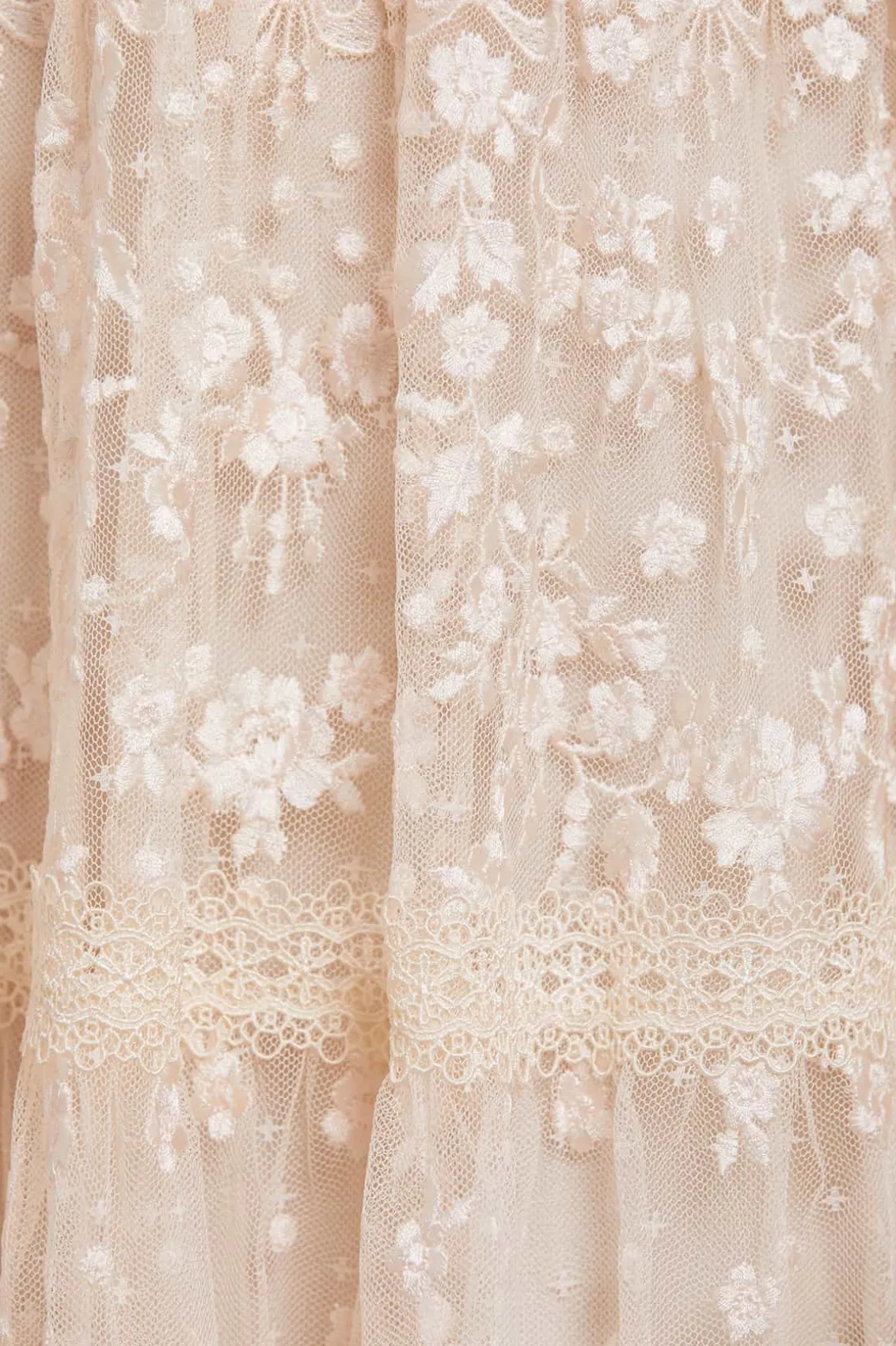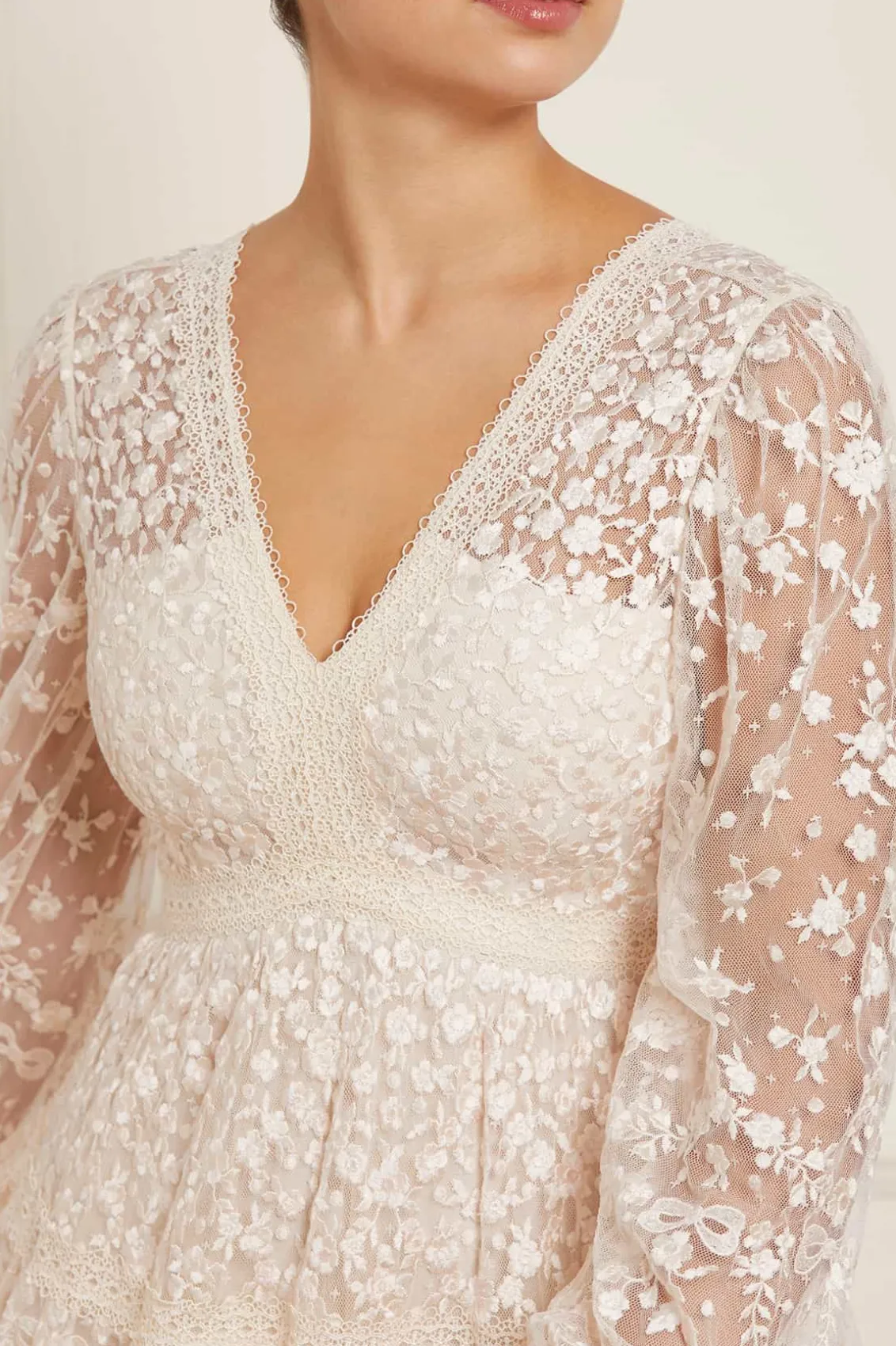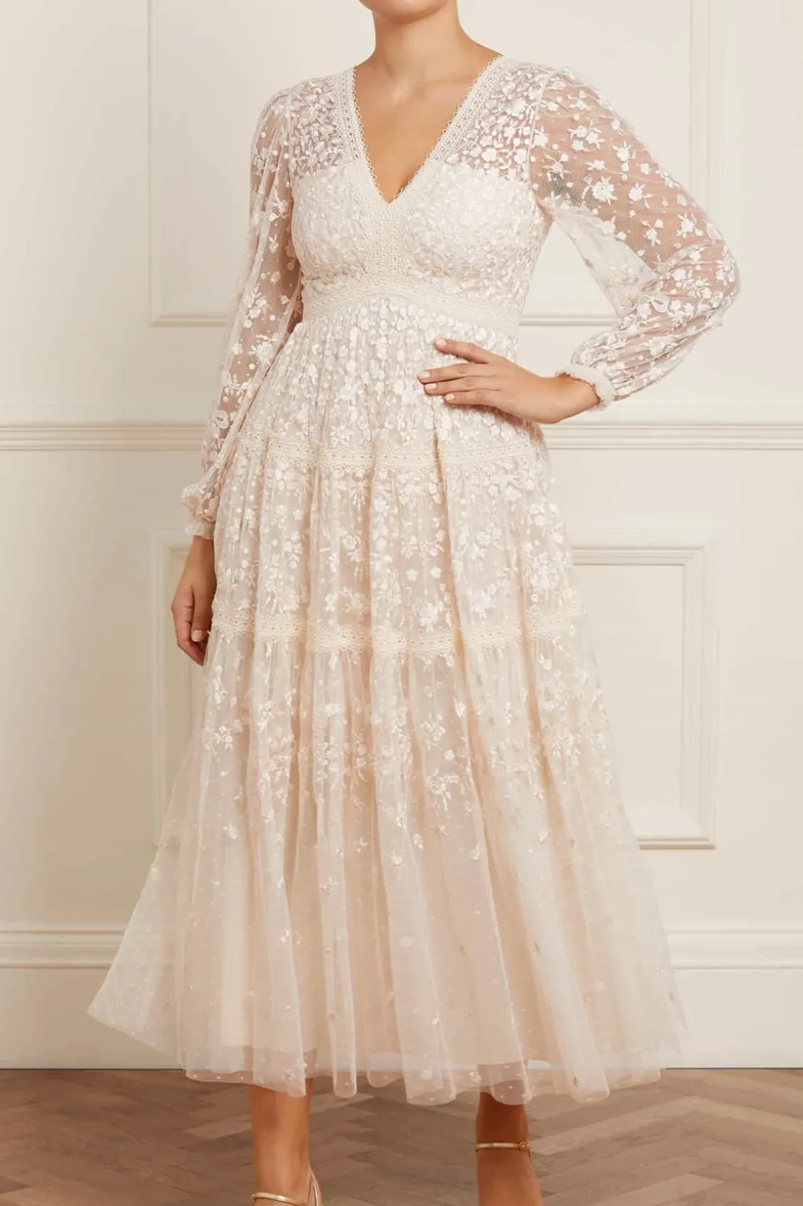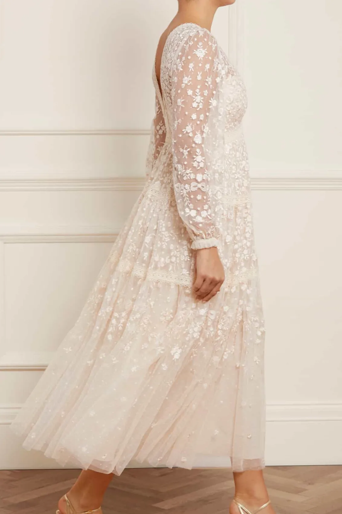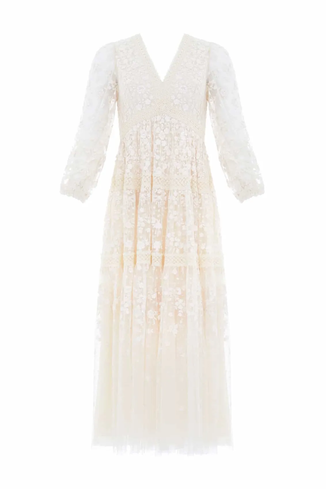 The Celestia Ribbon Gown in Champagne. This gown has been intricately designed with rich embroidery inspired by vintage lace, featuring delicate floral motifs and ribbon bows throughout. Crafted with pretty lace trims for signature Needle & Thread detailing, and delicately constructed with a textured tulle fabric base. Featuring a V-shaped neckline and a new, ultra-flattering silhouette. Make the ultimate statement in the Celestia.