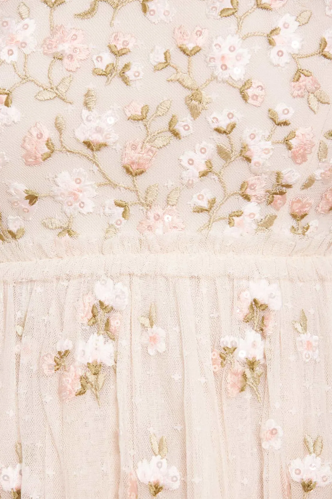 The Posy Round Neck Gown in Cream. This statement dress is adorned beautifully with intricate embroidered floral bouquet motifs and shimmering sequins, creating an all-over glistening effect. The skirt is developed with layers of soft, delicate tulle and net for a romantic texture. Make this style your new wardrobe staple.
