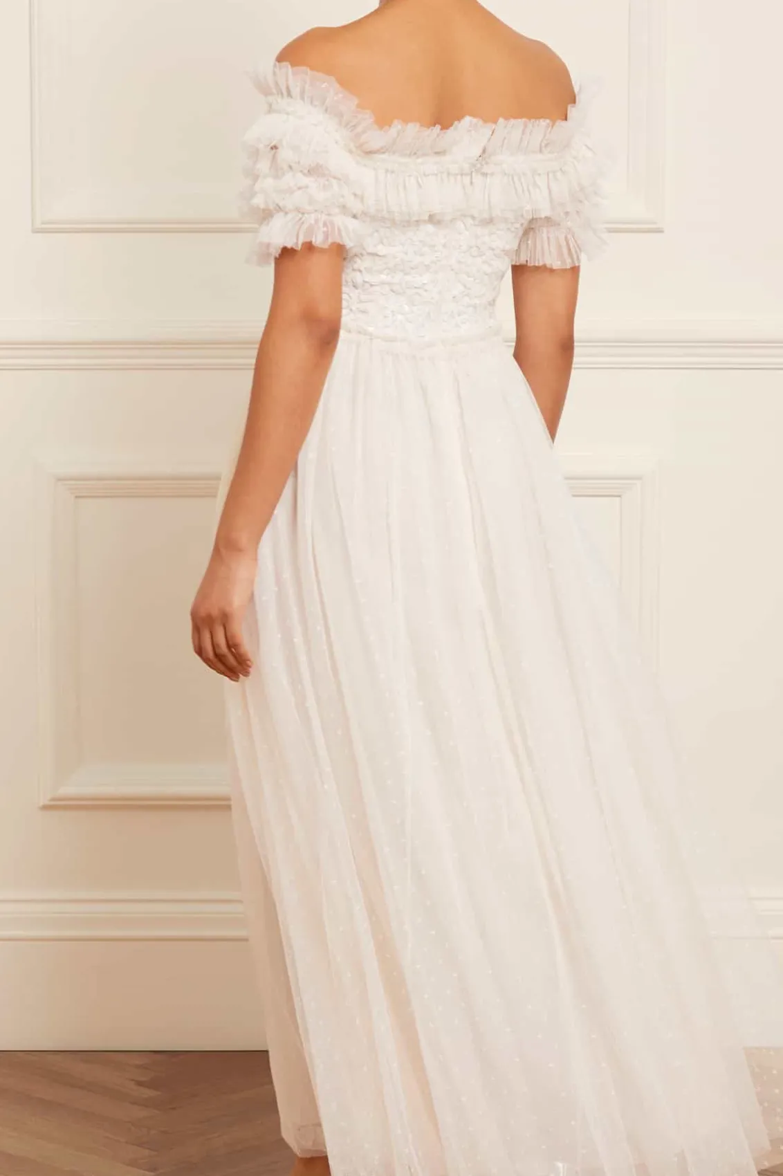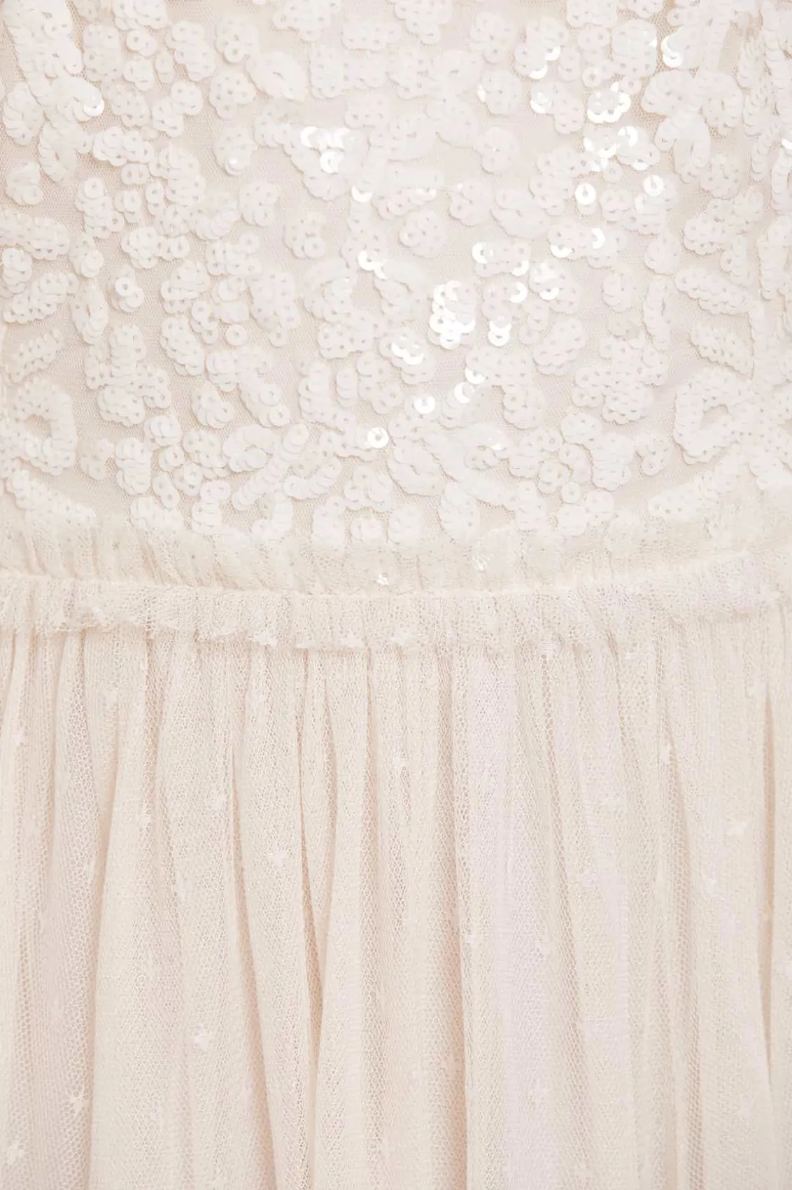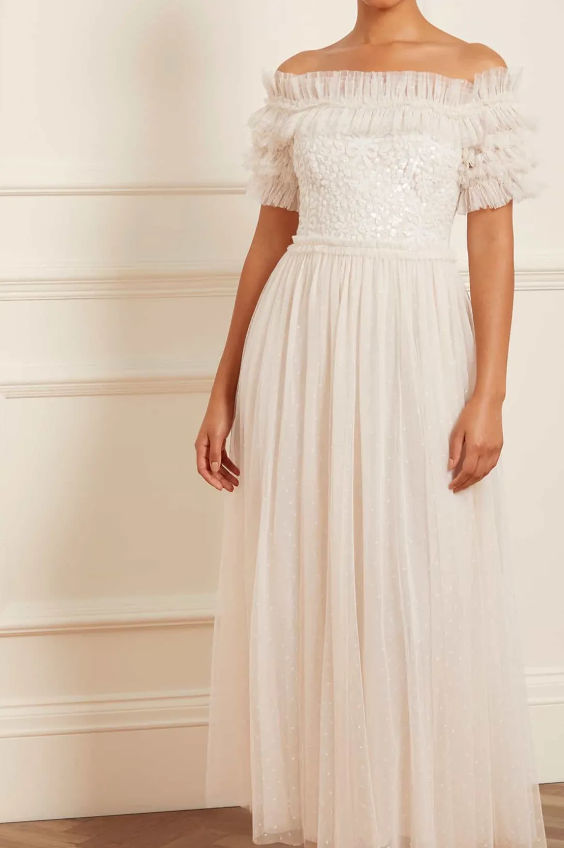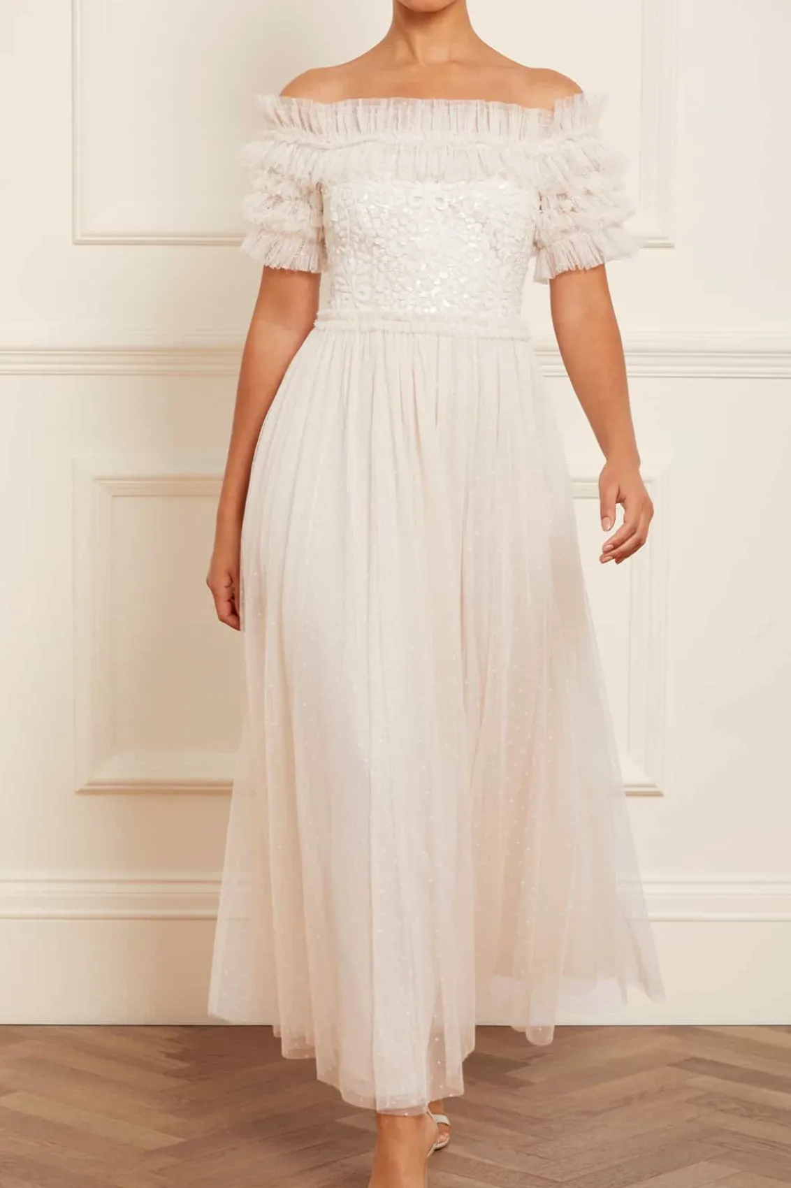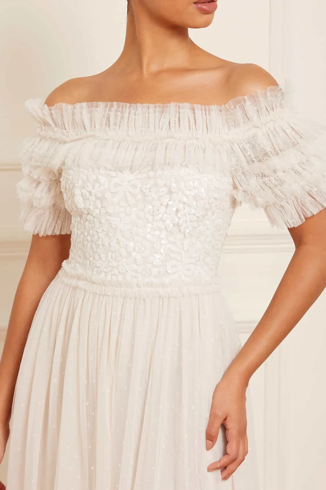 The Sequin Wreath Bodice Off-Shoulder Ankle Gown in Cream. This beautiful gown is crafted with an iconic off-the-shoulder design. Adorned with layers of delicate ruffles, along with an elasticated panel for comfort and hold. The bodice is beautifully decorated with shimmering sequins inspired by a vintage lace curtain. Designed with a romantic layered tulle skirt for signature Needle & Thread styling. A perfect gown for a special occasion.