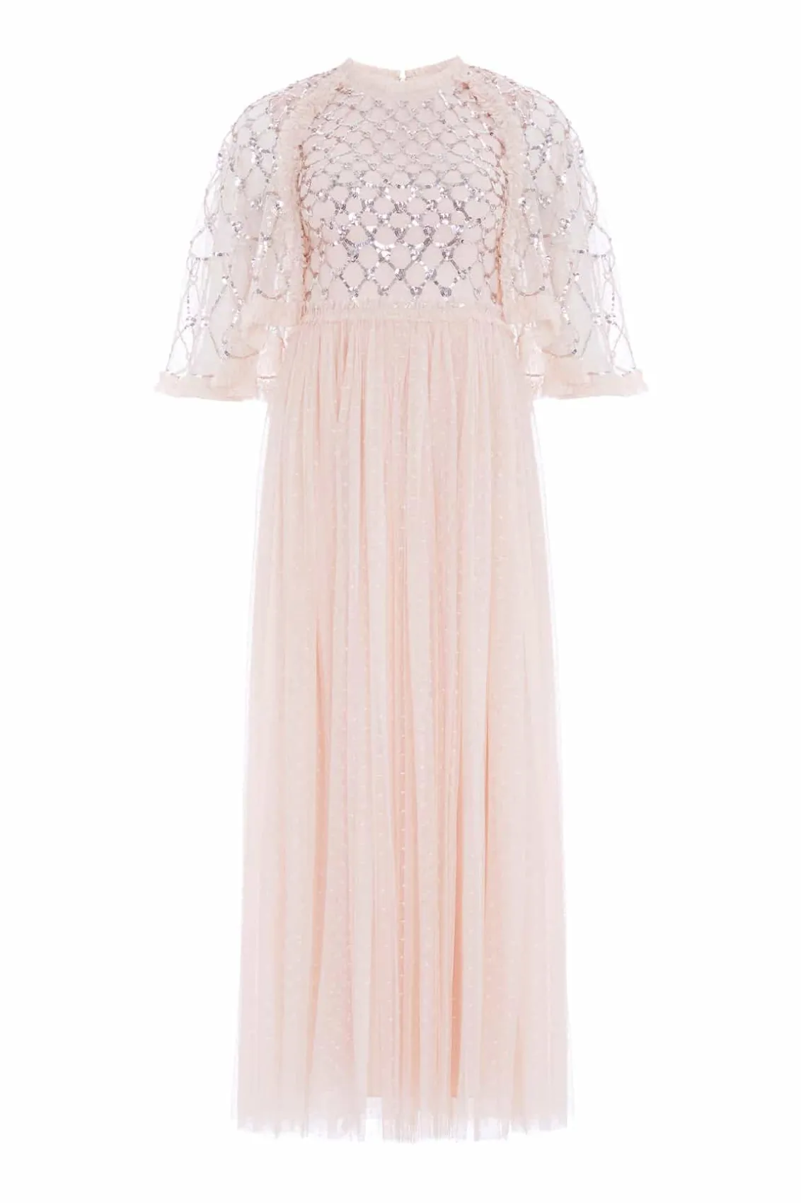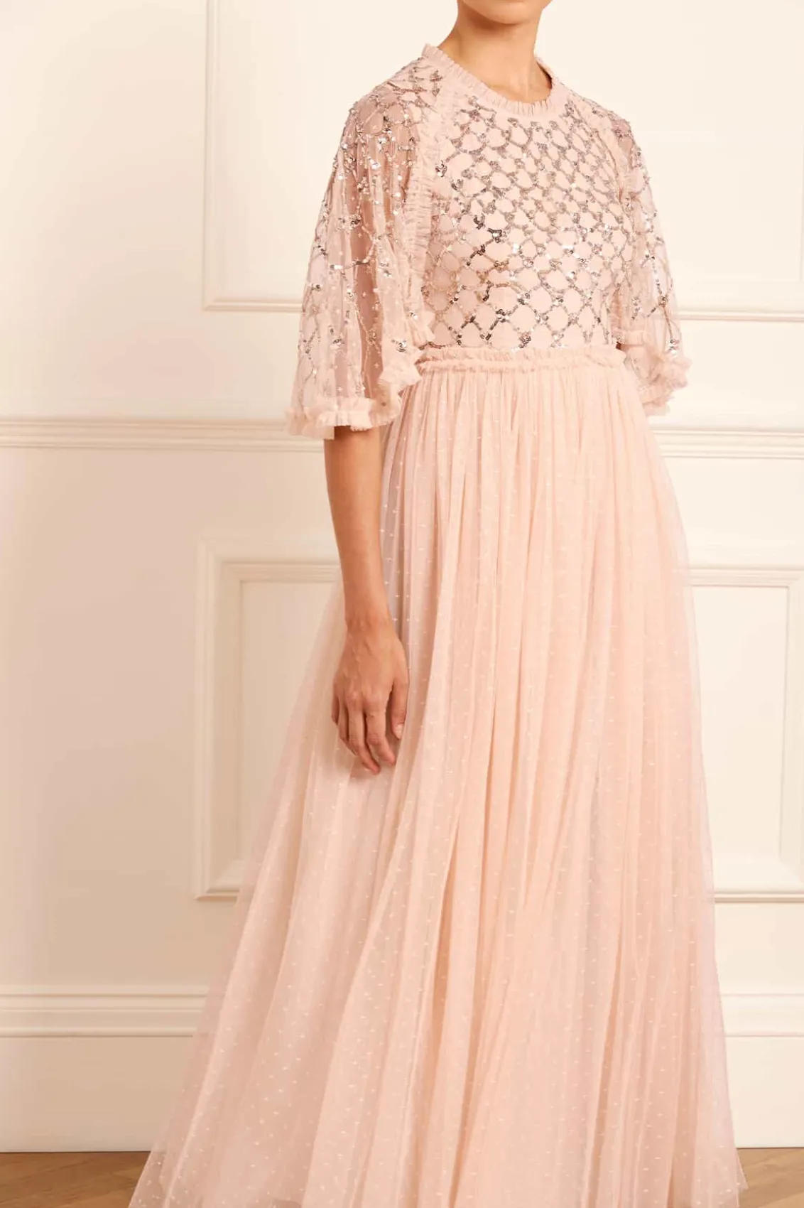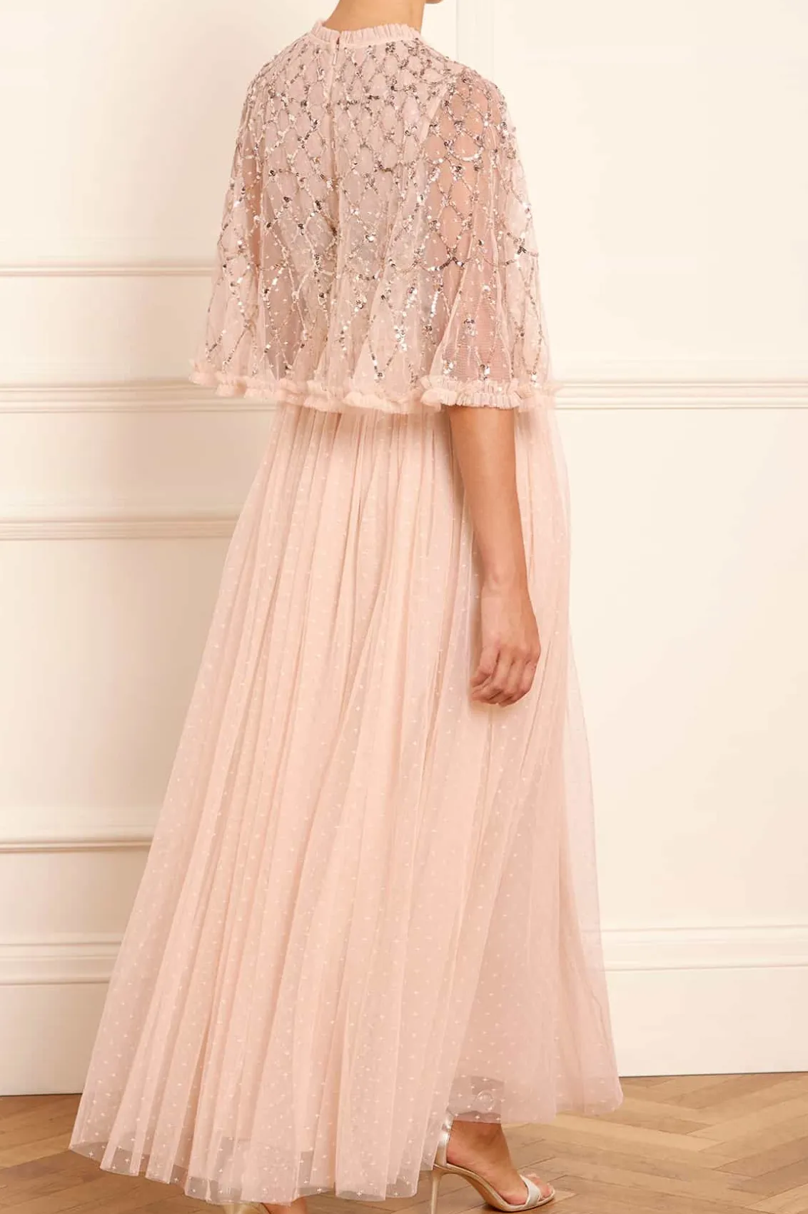 The Heart Lattice Bodice Cape Ankle Gown in Dust Beige/Silver. The bodice of the gown is decorated with intricate embellishments made using the smallest sequins for exquisite detailing. Beautifully designed with heart-shaped motifs in a lattice layout. Developed with signature Needle & Thread soft tulle trims and a layered skirt for romantic detailing and a statement look. The perfect gown for a bridesmaid moment or an upcoming special occasion.