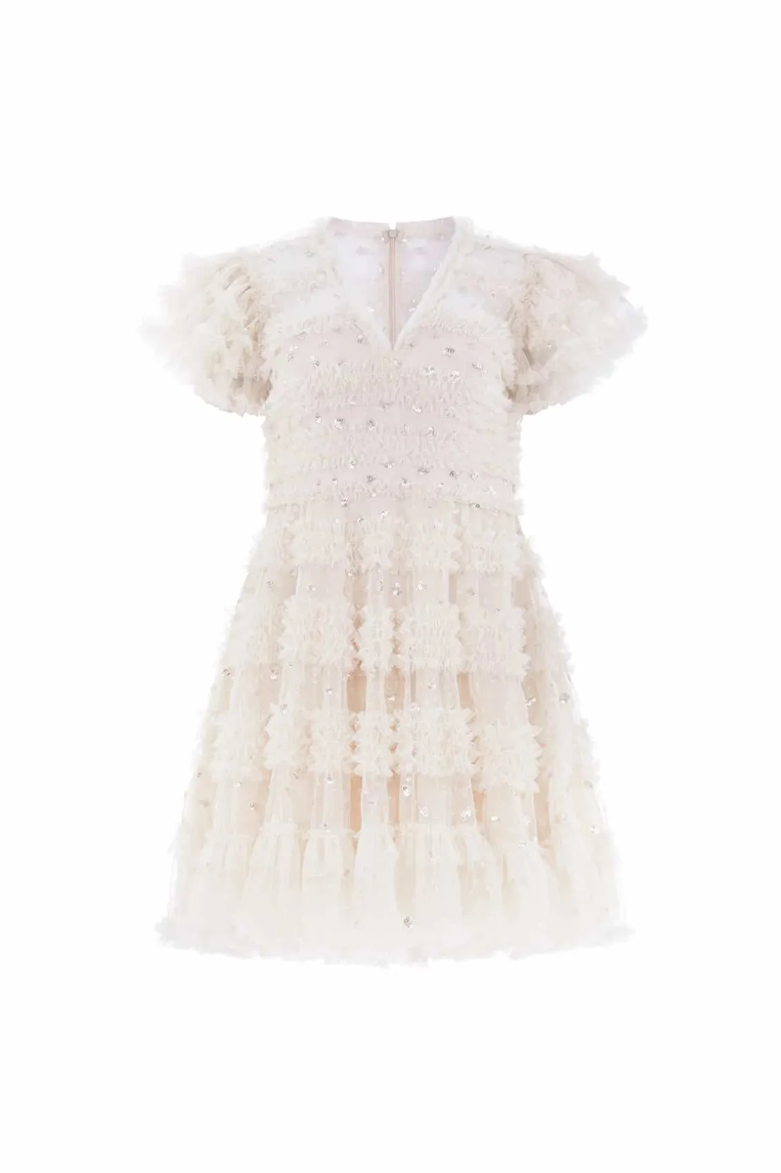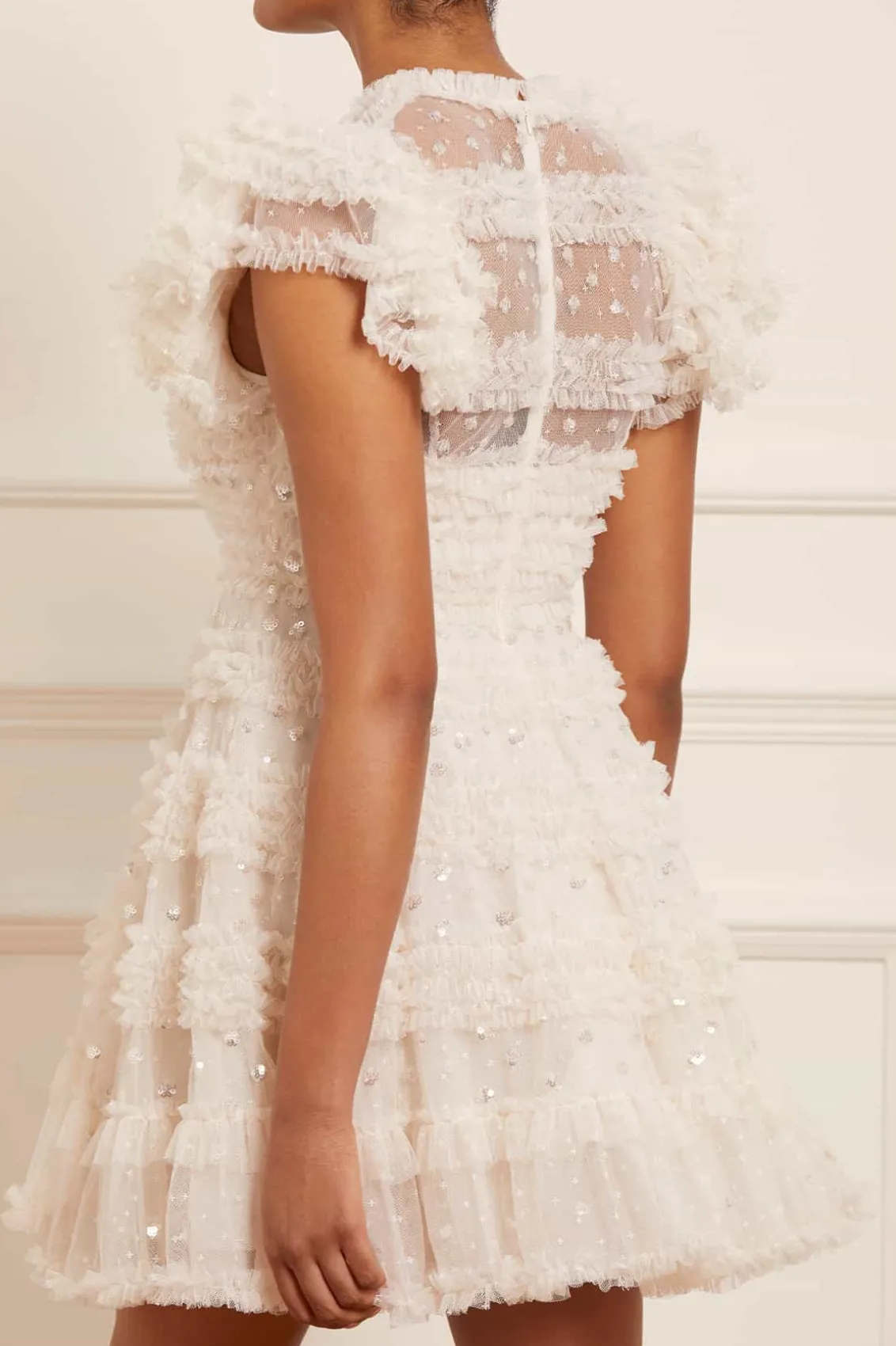 The Vivian V-Neck Micro Mini Dress in Cream. A signature Needle & Thread style statement. Beautifully printed with sequin polka dot motifs scattered throughout, creating an enchanting shimmer. Adorned with specially sourced sequins to create a sparkling effect throughout. This romantic style features tulle frills in perfectly positioned rows, creating a soft, frothy texture. Developed with generous ruffled sleeves and a V-neckline for a contemporary look. A style you’ll wear time and time again.