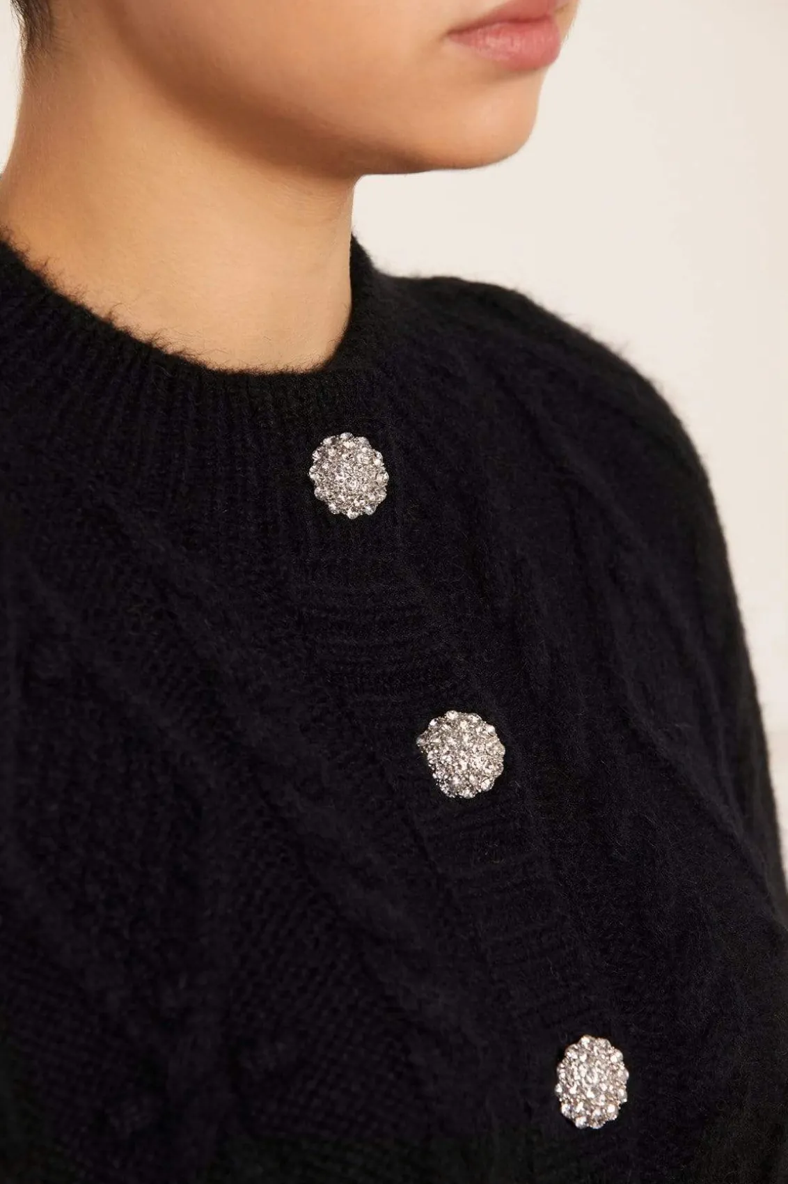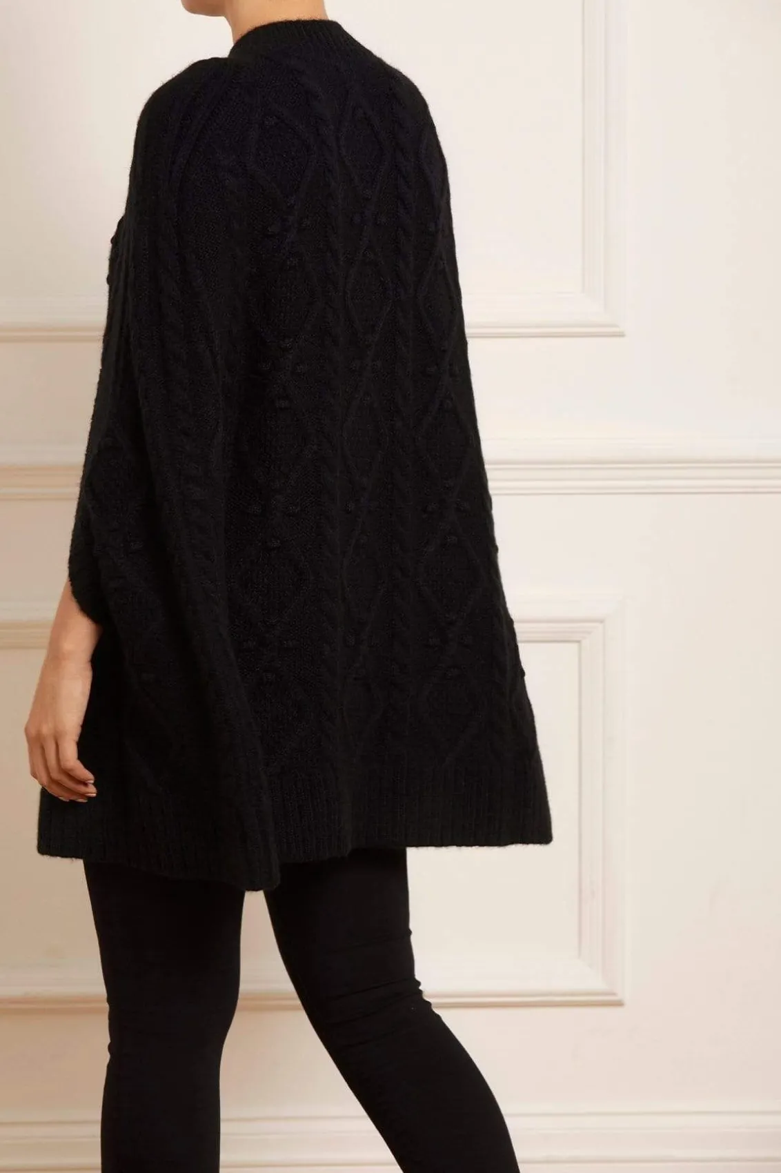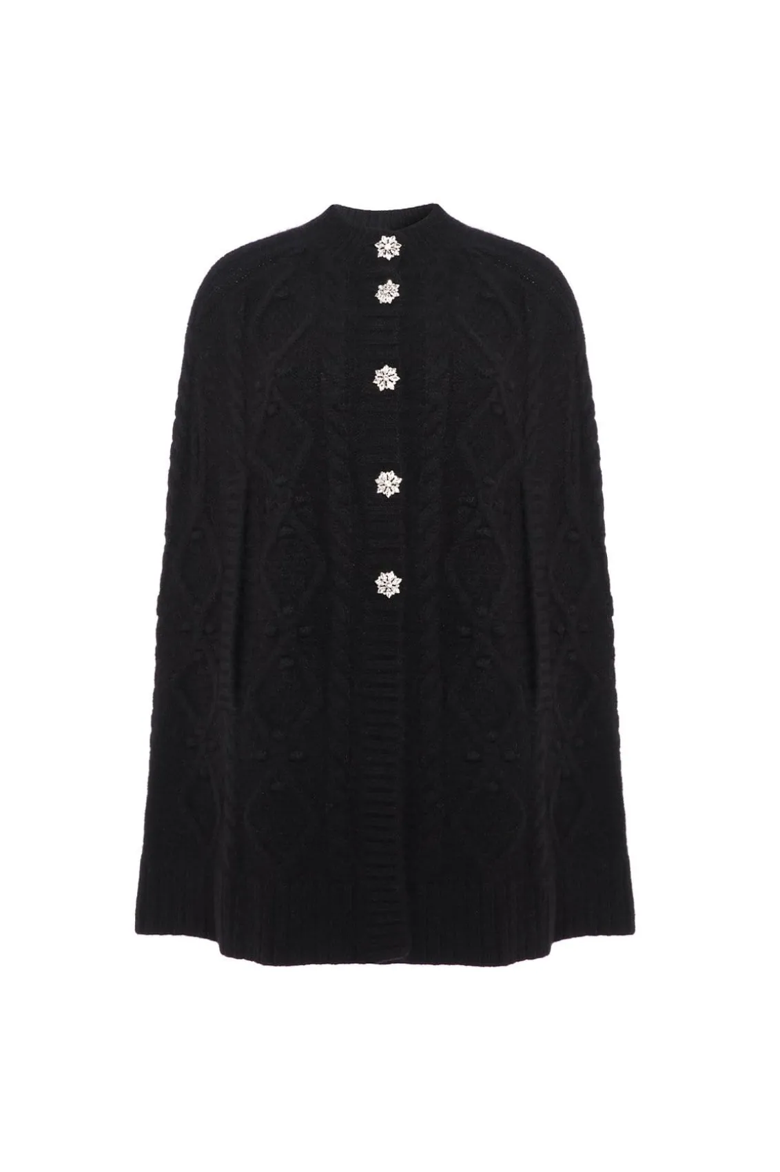 NEEDLE & THREAD EXCLUSIVE. The Sylvie Cable Jewelled Knee Length Cape in Jet Black. This cape is developed from alpaca yarn, creating a cosy feel with a fluff texture finish. Adorned with jewelled diamante buttons down the front of the cape, creating a subtle shimmer. This easy styling piece is decorated with mixed cables in diamond and twist textiles throughout. Designed with long sleeves, split openings and volume to create a romantic style statement. A key statement piece of the season.