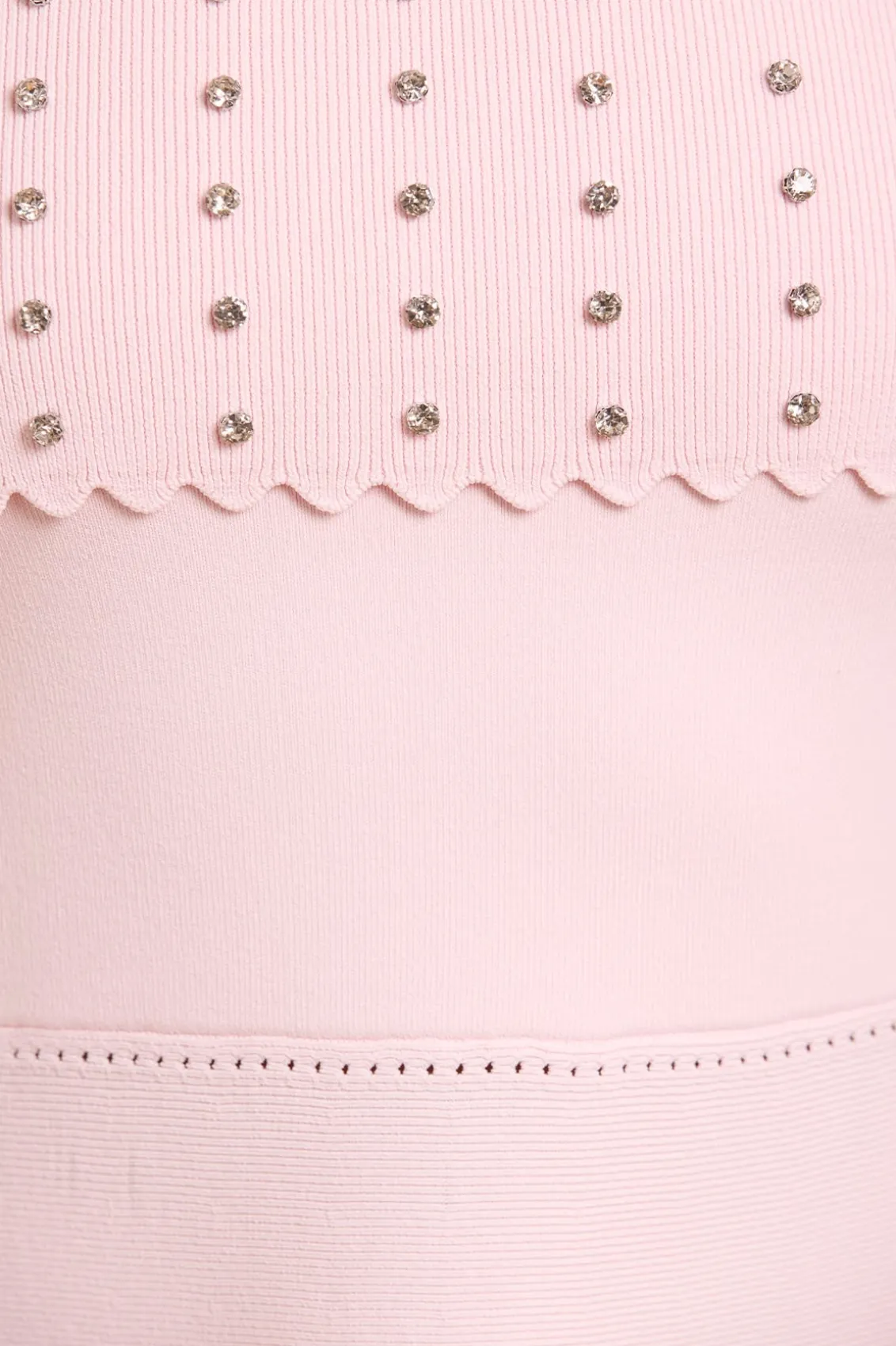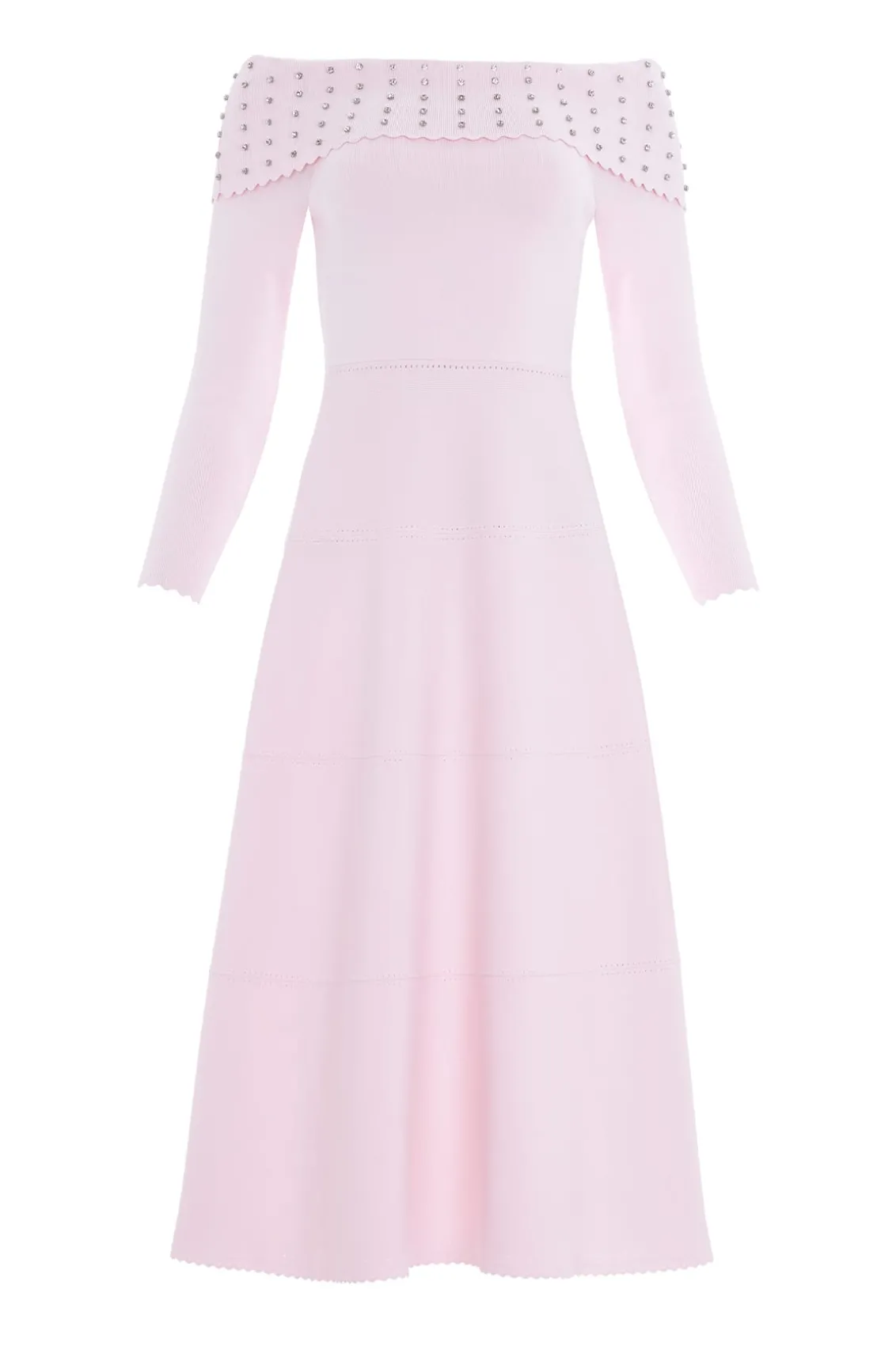 NEW SEASON. The Embellished Bardot Knit Gown in Pink. This knitted gown is developed from a recycled viscose blend, with stretch yarn for a beautiful, flattering texture. It features a fitted stretch bodice, a feminine bardot neckline, slim sleeves, and scalloped trim details for a romantic look. The bardot neck is beautifully adorned with crystal gems in a linear pattern for a signature Needle & Thread feminine touch.