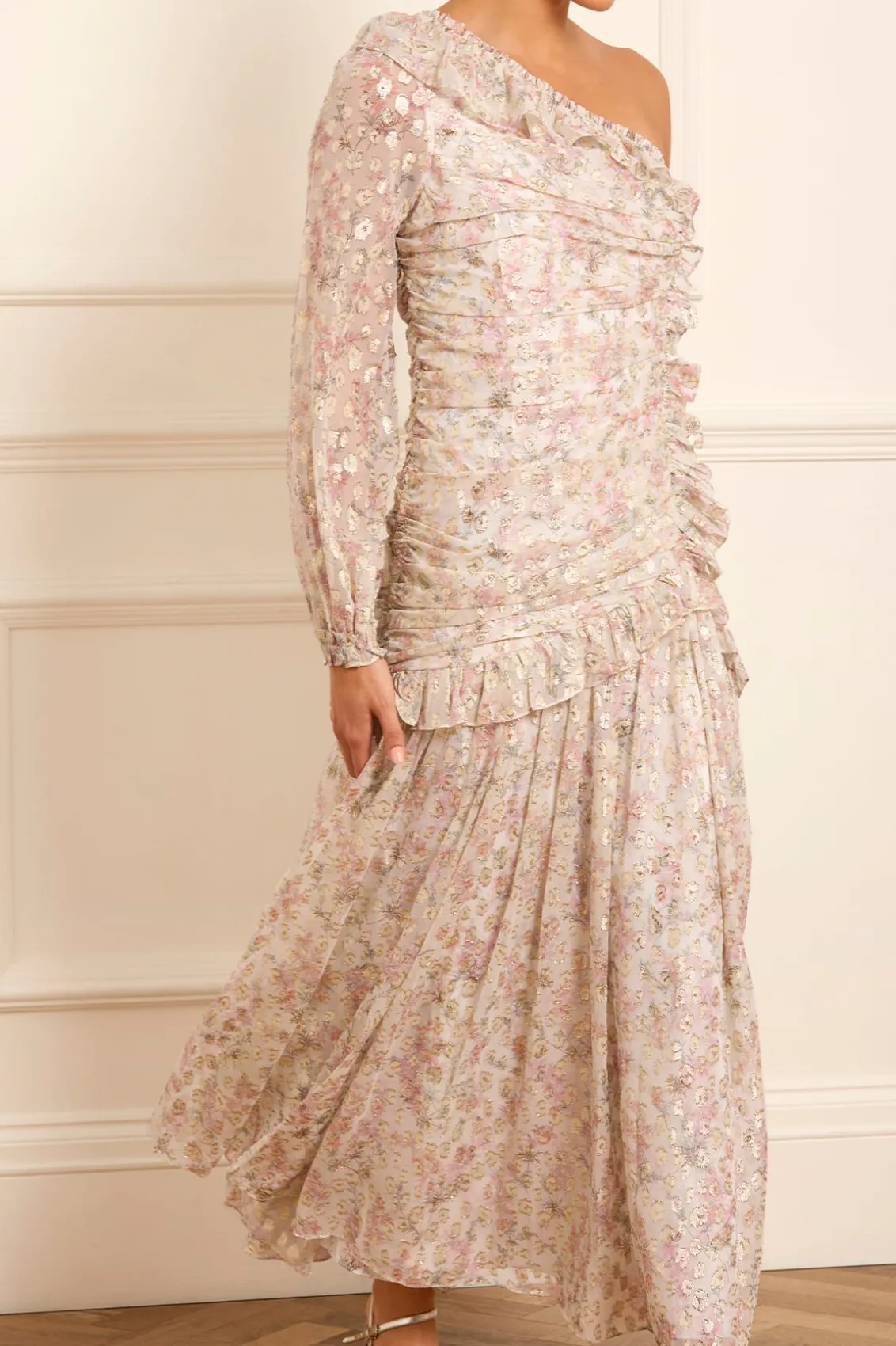 NEW SEASON. The Ophelia Ditsy Lurex One-Shoulder Ankle Gown in Moonshine/Pink. This romantic trailing print is taken from an archive, hand-painted artwork from the early 1900s, depicting soft, whimsical ditsy floating florals. This playful one-shoulder gown boasts a flattering gathered ruche detail engineered across the body and adorned with signature Needle & Thread frill detailing. Designed with a blouson sleeve featuring a ruffle cuff and romantic frills. The slim silhouette features a dropped waist seam with a flirty frill tier. The stretch lining fabric ensures fit and comfort. The perfect gown for an upcoming occasion.