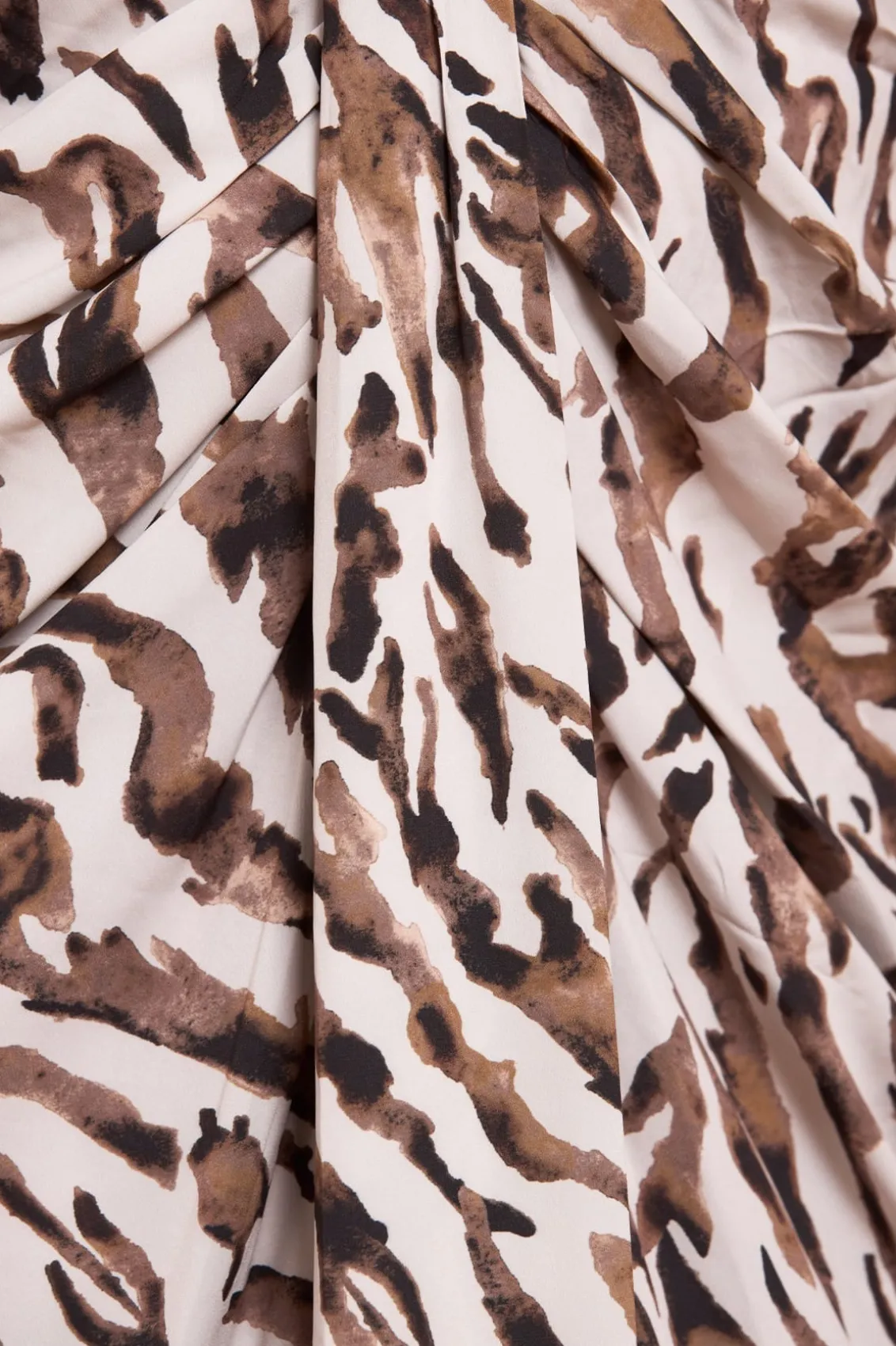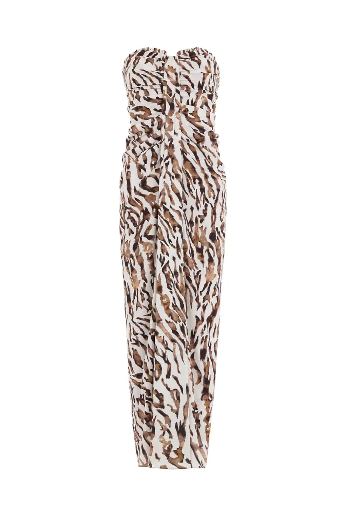 NEW SEASON. The Zebra Crepe Strapless Ankle Gown in Moonshine. This zebra print gown blends Hollywood glamour with hand-painted, water-inspired artwork. Crafted in soft crepe, it features elegant draping, flattering ruching, and a frilled neckline. An internal stretch power-mesh corset ensures comfort and impeccable fit, enhanced by couture-level details like grosgrain-encased boning. Pair it with the Zebra Chiffon Long Cape for a truly show-stopping look.