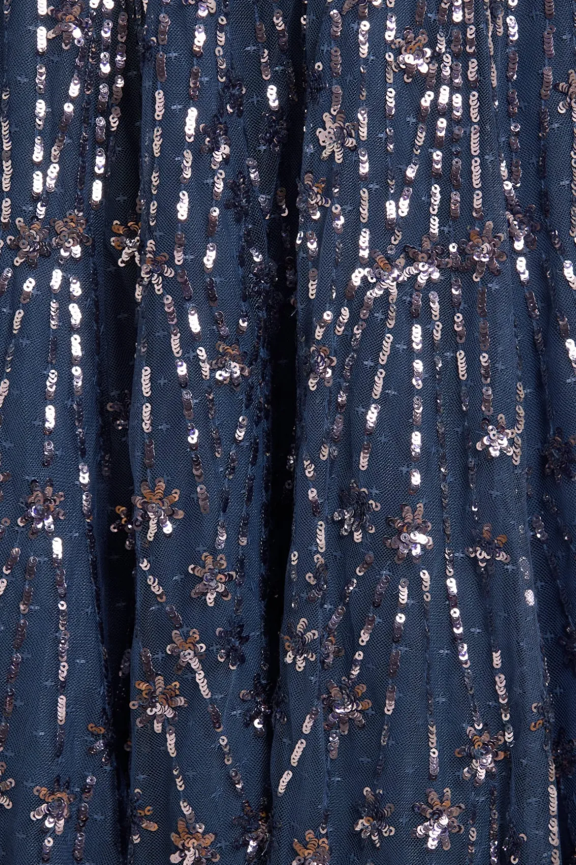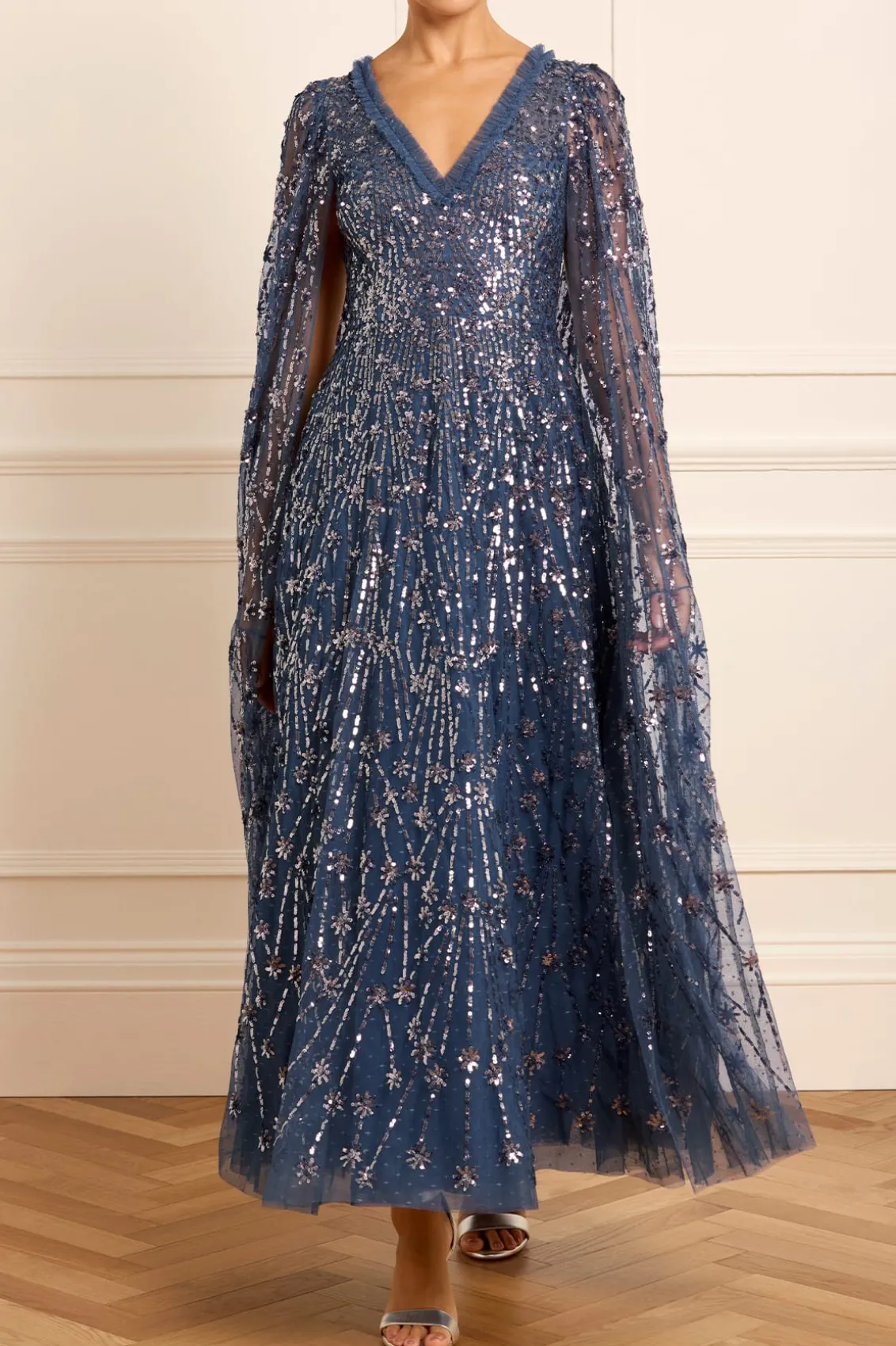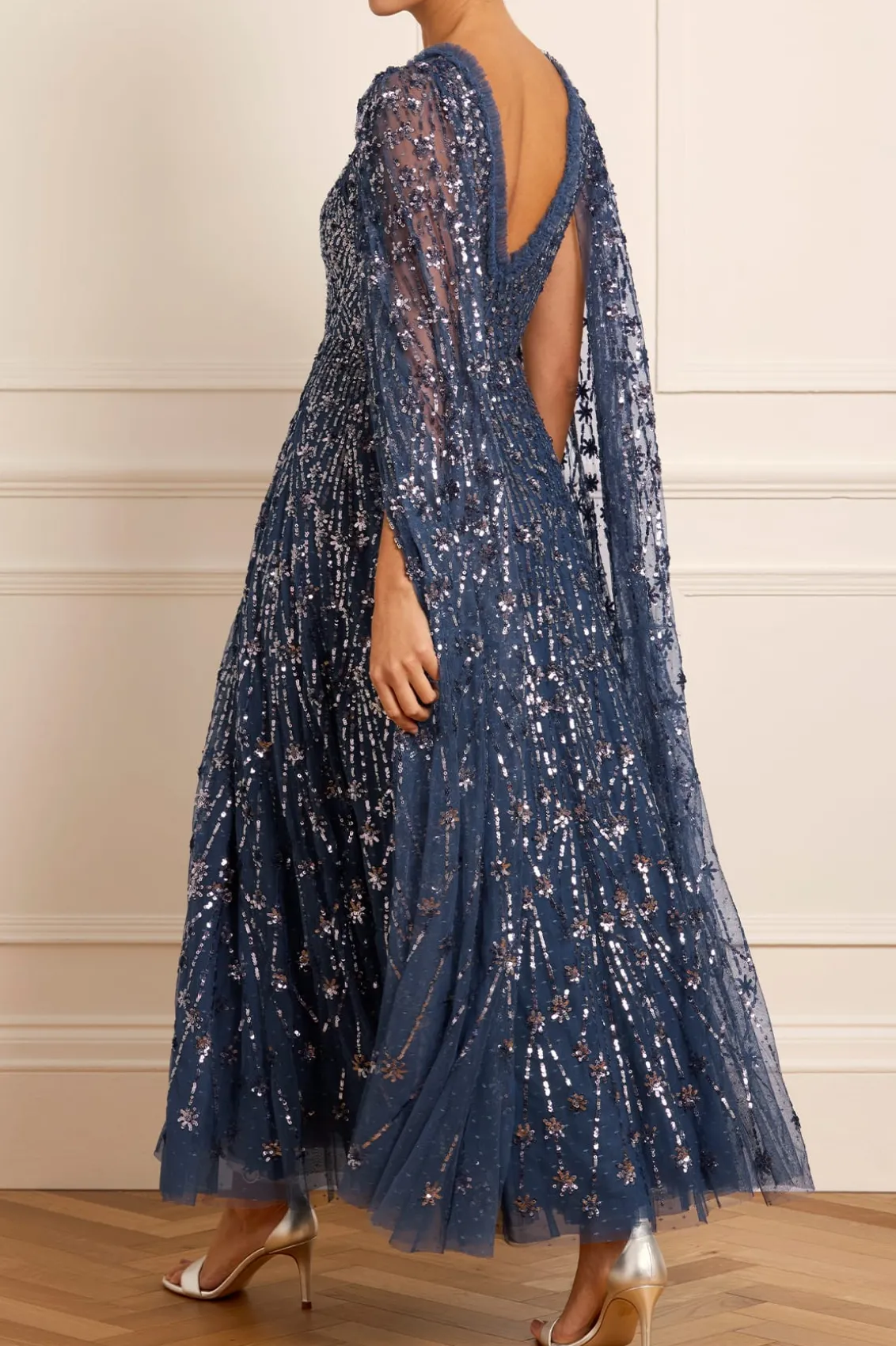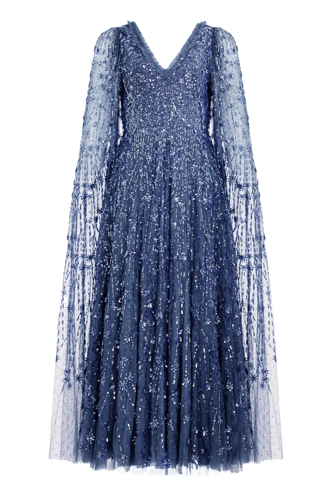 NEW SEASON. The Comet Ankle Gown in Indigo. This beautiful statement piece showcases glittering sequin shooting star motifs, inspired by the night sky, with embellishments that delicately trail down to the hem. This gown features our new floor-length cape, adding an element of romantic elegance. The skirt is crafted from layers of net and tulle, creating a full, voluminous silhouette. The sequins have a special high-shine, gloss finish created from extra foil coating added to each sequin to create this extra lustrous look. Make a memorable appearance in the Comet Ankle Gown.