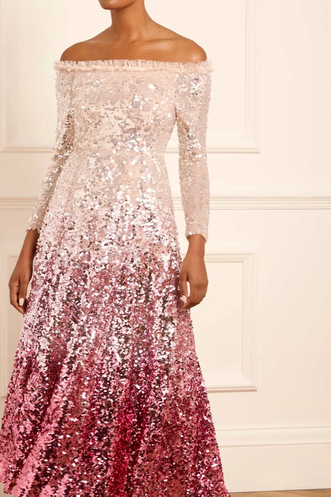The Hallie Ankle Gown in Bright Pink. This elegant gown features a glamorous Hollywood-inspired neckline adorned with our signature Needle & Thread frill. Designed with slim sleeves, and a full skirt made up of layers of soft tulle, complemented by luxurious statement shimmering sequins. Developed with an internal corset construction in stretch power mesh ensures full comfort and fit while maintaining the shape and hold of the garment, featuring a mesh bralette for ultimate comfort and an easy fit. This gown is both captivating and timeless.
