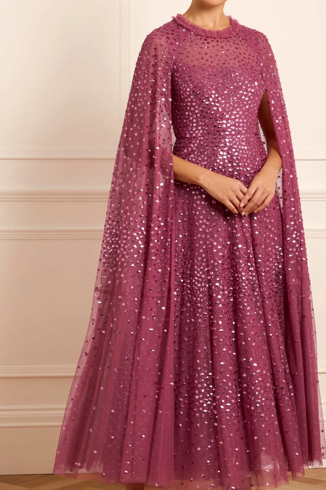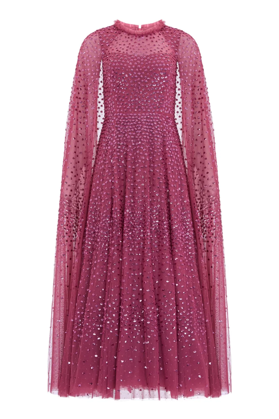 NEW SEASON. The Scatter Dot Cape Sleeve Ankle Gown in Pink Topaz. This embellished gown is decorated with exquisite shimmering dot motifs, undulating in wave formations for a captivating glittering effect. Designed with a sweeping floor-length cape for romantic detailing and a statement look. The flattering square neckline is trimmed with signature Needle & Thread tulle frills. The skirt is made up of generous layers of net and tulle with a sweeping hemline. The perfect choice for an upcoming special occasion and beyond.