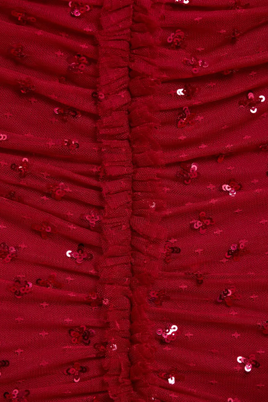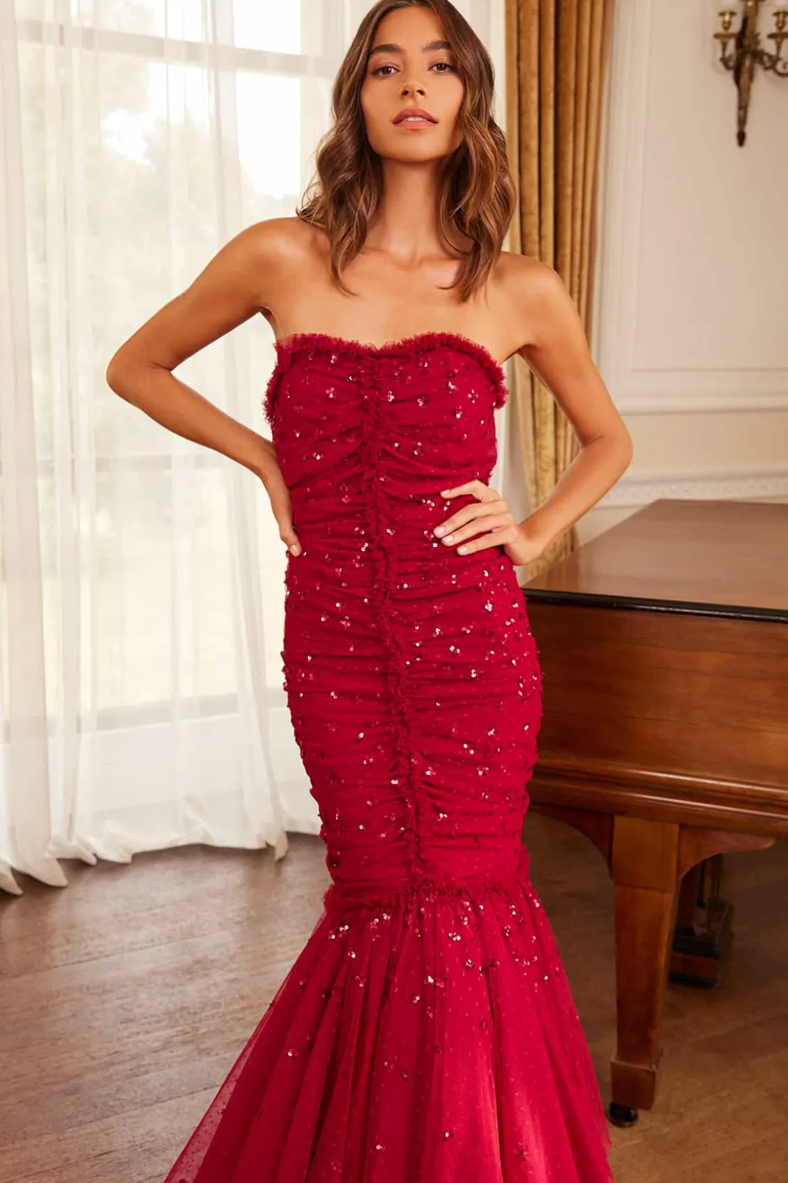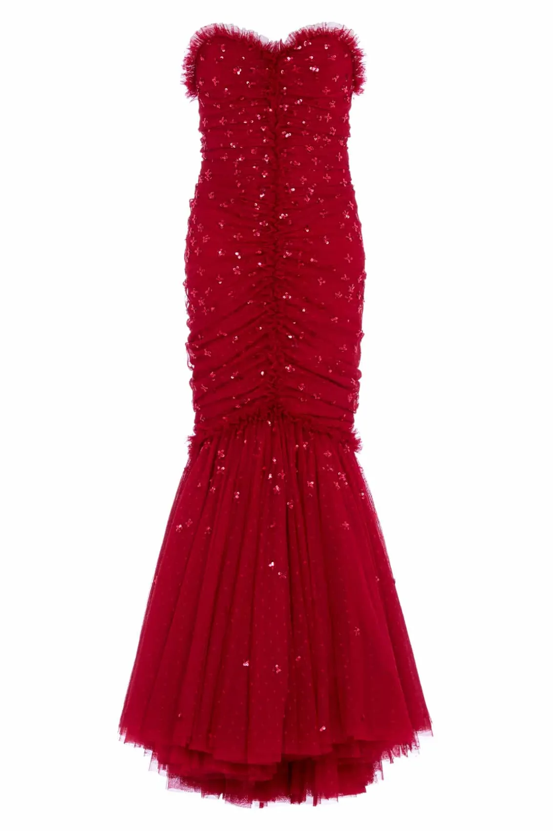 The Scatter Sequin Strapless Ankle Gown in Red. This gown is embellished with a shimmering scatter sequin motif that graduates towards the hem. This gown features a slim silhouette with soft, flattering drapes across the body. The elegant strapless sweetheart neckline and fishtail skirt are adorned with frothy tulle ruffles, adding a romantic touch. Crafted with signature Needle & Thread frills for added romantic styling. The internal corset construction in stretch power mesh ensures comfort and fit while maintaining the garment’s shape and hold. A statement piece you’ll forever treasure.