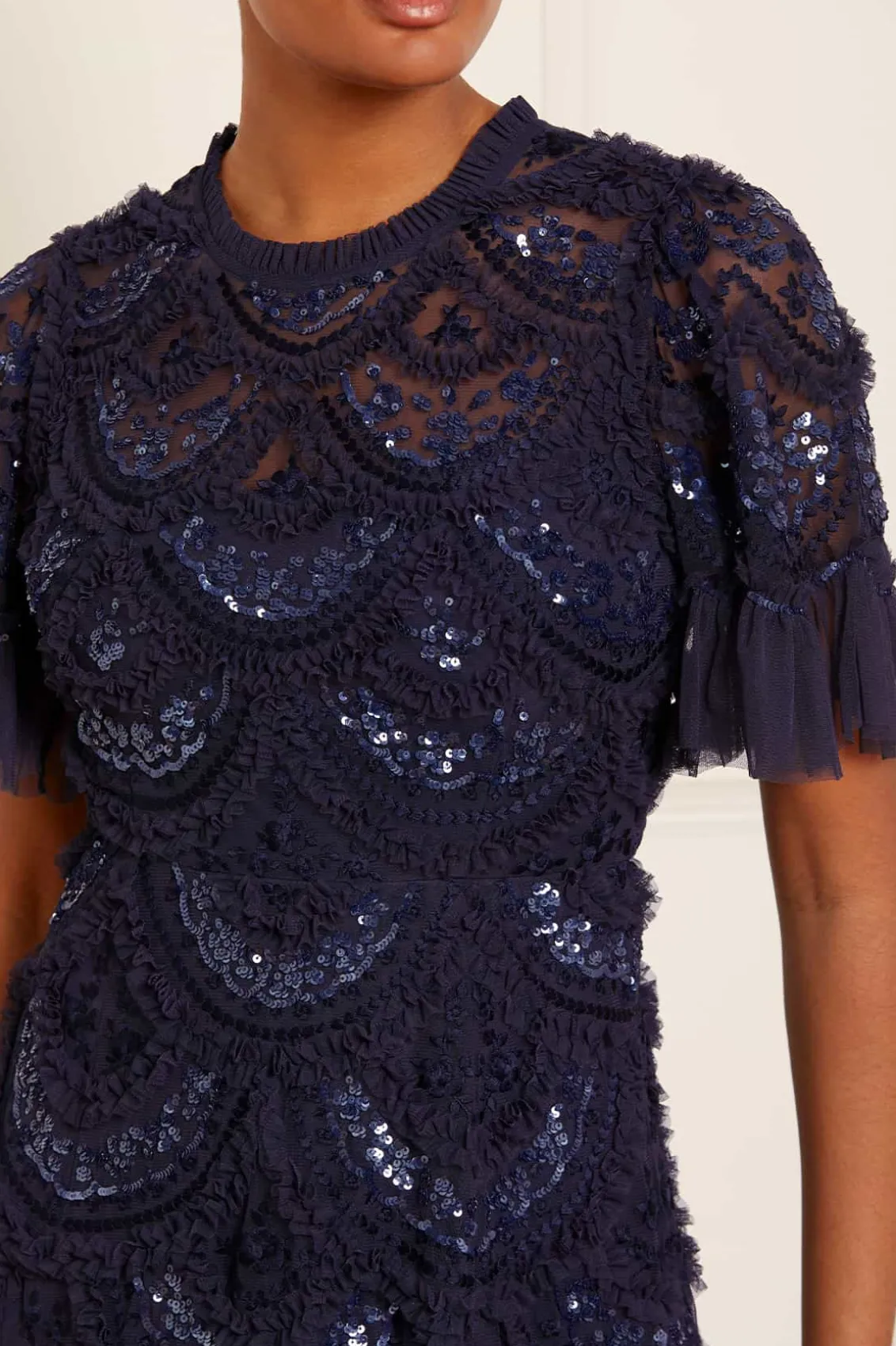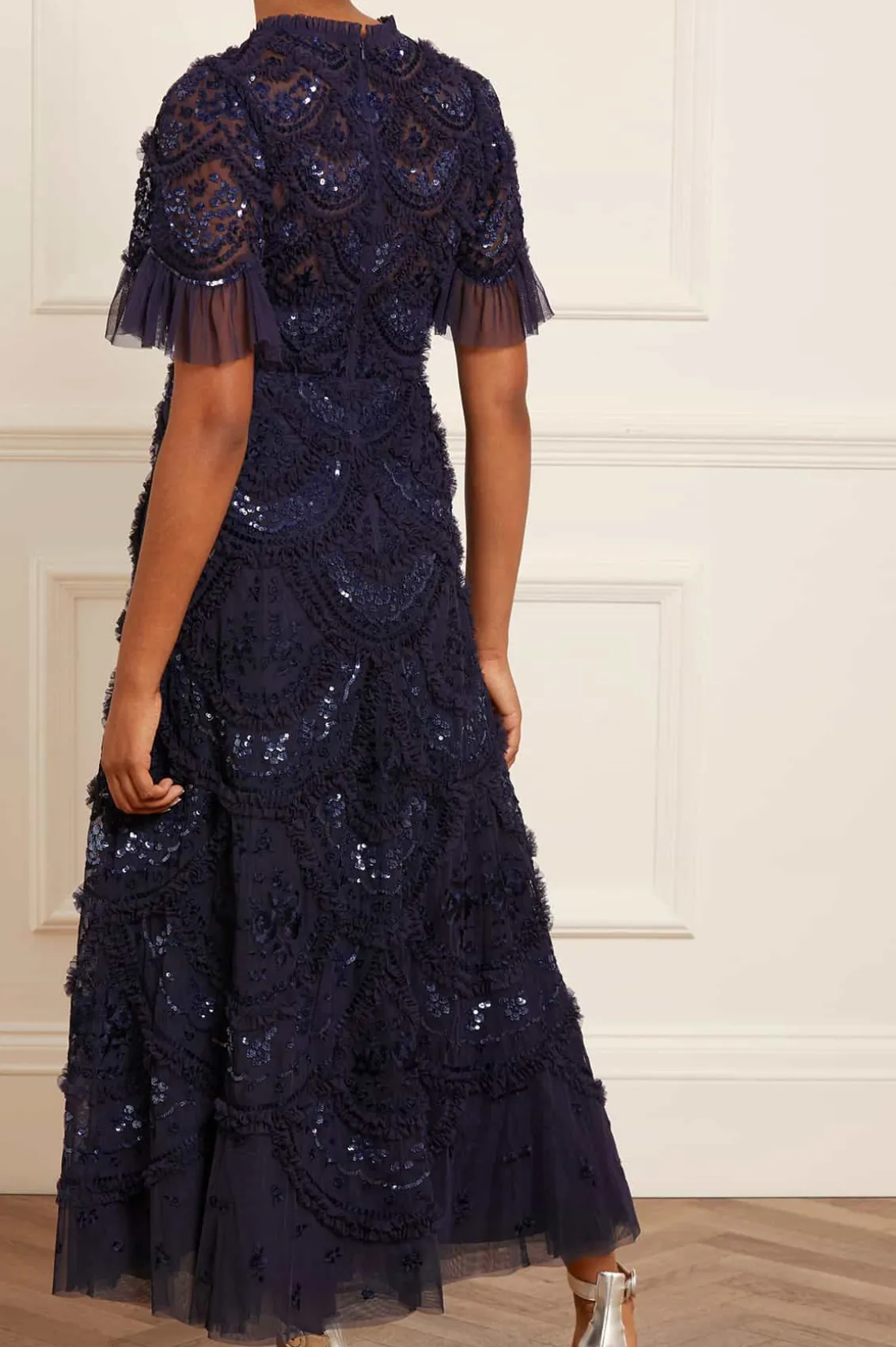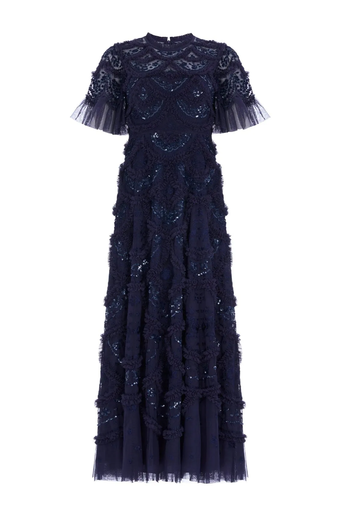 The Carmen Ruffle Ankle Gown in Navy. Designed with delicate tulle ruffles shaped into scallop sections, perfectly positioned to create a signature Needle & Thread romantic, textured look. This gown is beautifully embroidered with floral vine borders, featuring highlights of lustrous sequins for a glistening effect. A new wardrobe favourite.