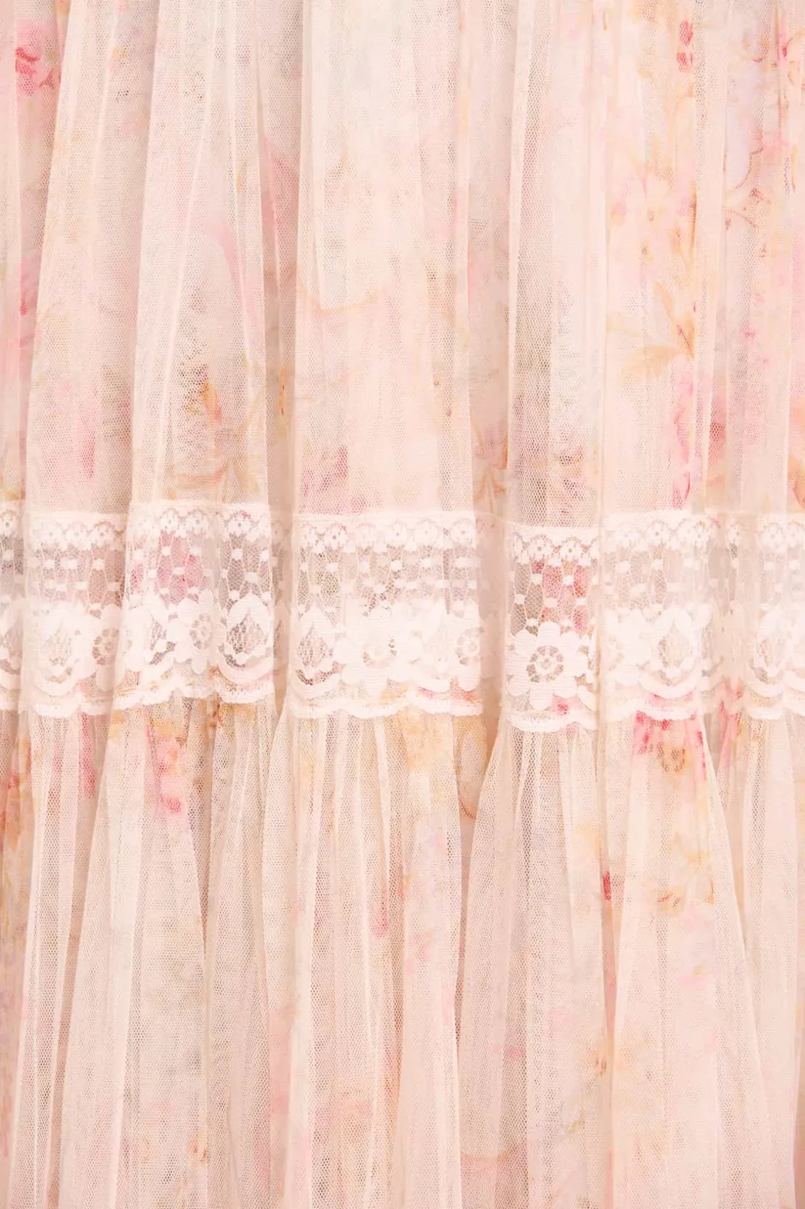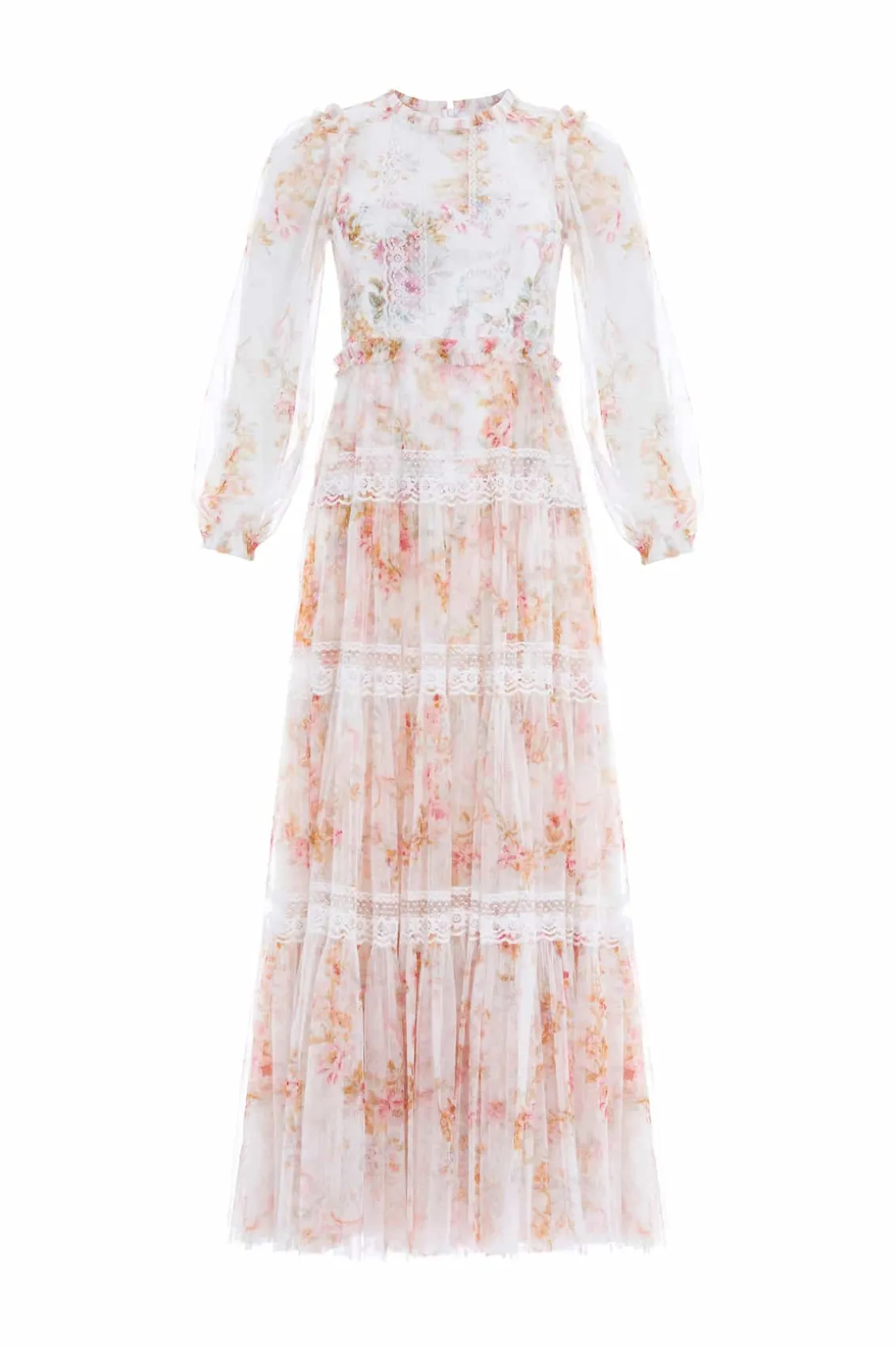 The Enchanted Garden Lace Ankle Gown in Moonshine. Beautifully designed with a signature Needle & Thread style print taken from archive hand-painted wallpaper depicting romantic garden florals and historical motifs. Inspired by Victorian styling, featuring lace trims that are perfectly positioned along gently gathered skirt tiers, adorning this printed tulle gown. Crafted with sheer printed blouson sleeves with ruffle cuffs and softly gathered tulle frills decorate the neckline, armhole, and waistband. The skirt is made up of layers of signature Needle & Thread soft tulle for romantic styling. A contemporary style you’ll forever treasure.