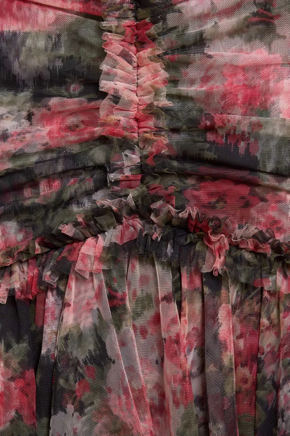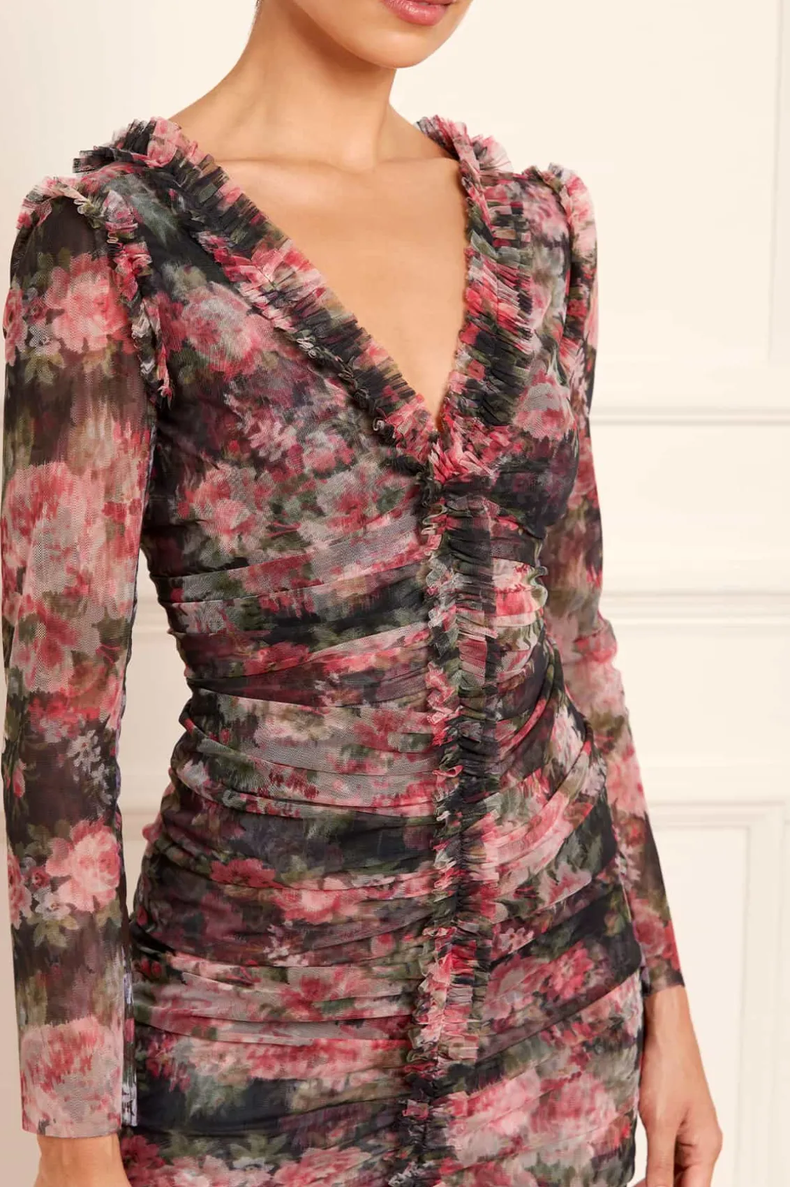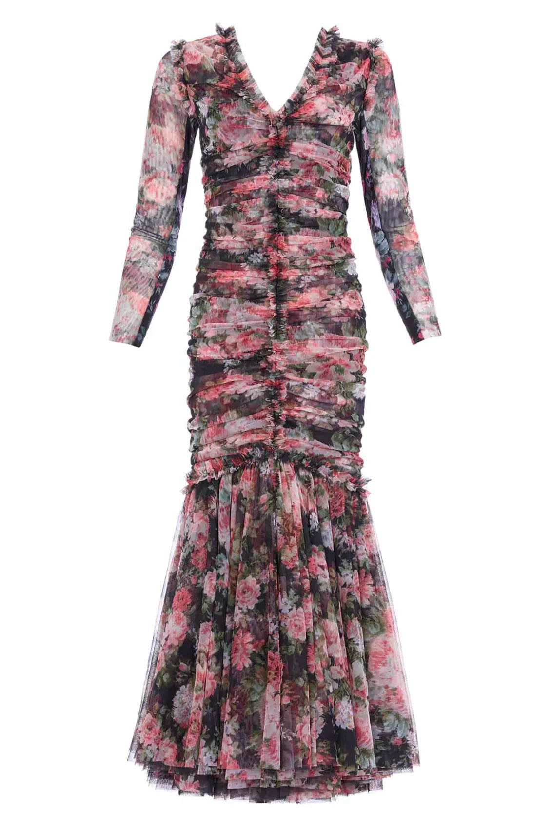 The Midnight Dance Long Sleeve Ankle Gown in Graphite. Beautifully printed with a floral design featuring luxurious blooms taken from archive, hand-painted artwork from the early 1900s. The statement fishtail skirt is crafted from layers of signature Needle & Thread soft tulle and net for added drama. The elegant V-neckline is adorned with frothy tulle ruffles, featuring long slim sleeves. Crafted with signature Needle & Thread frills on the shoulder, skirt seam, and bodice for a touch of romantic styling. This gown creates the most stunning movement as you walk.