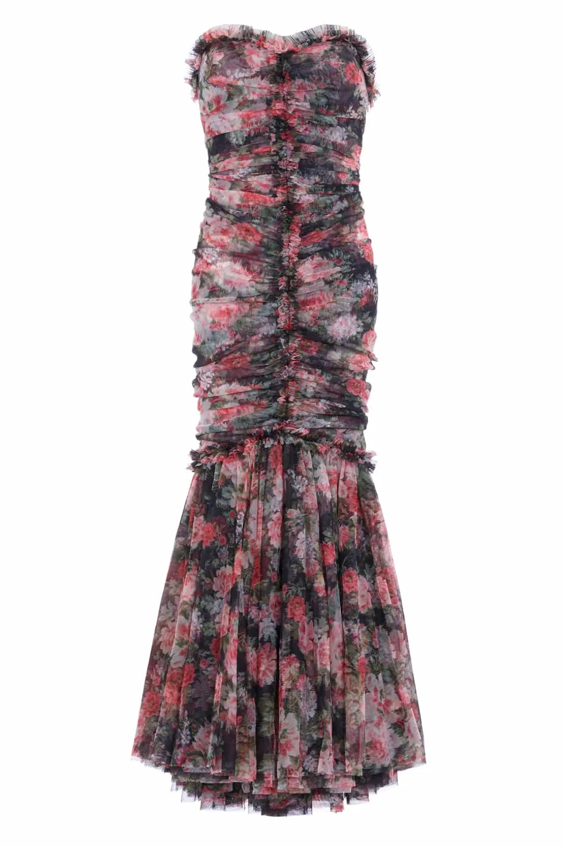 The Midnight Dance Strapless Ankle Gown in Graphite. Beautifully printed with a floral design featuring luxurious blooms taken from archive, hand-painted artwork from the early 1900s. This gown features a slim silhouette with soft, flattering drapes across the body. The statement fishtail skirt is crafted from layers of signature Needle & Thread soft tulle and net for added drama. The elegant V-neckline is adorned with frothy tulle ruffles, featuring long slim sleeves. Crafted with signature Needle & Thread frills on the shoulder, skirt seam, and bodice for a touch of romantic styling. This gown creates the most stunning movement as you walk.