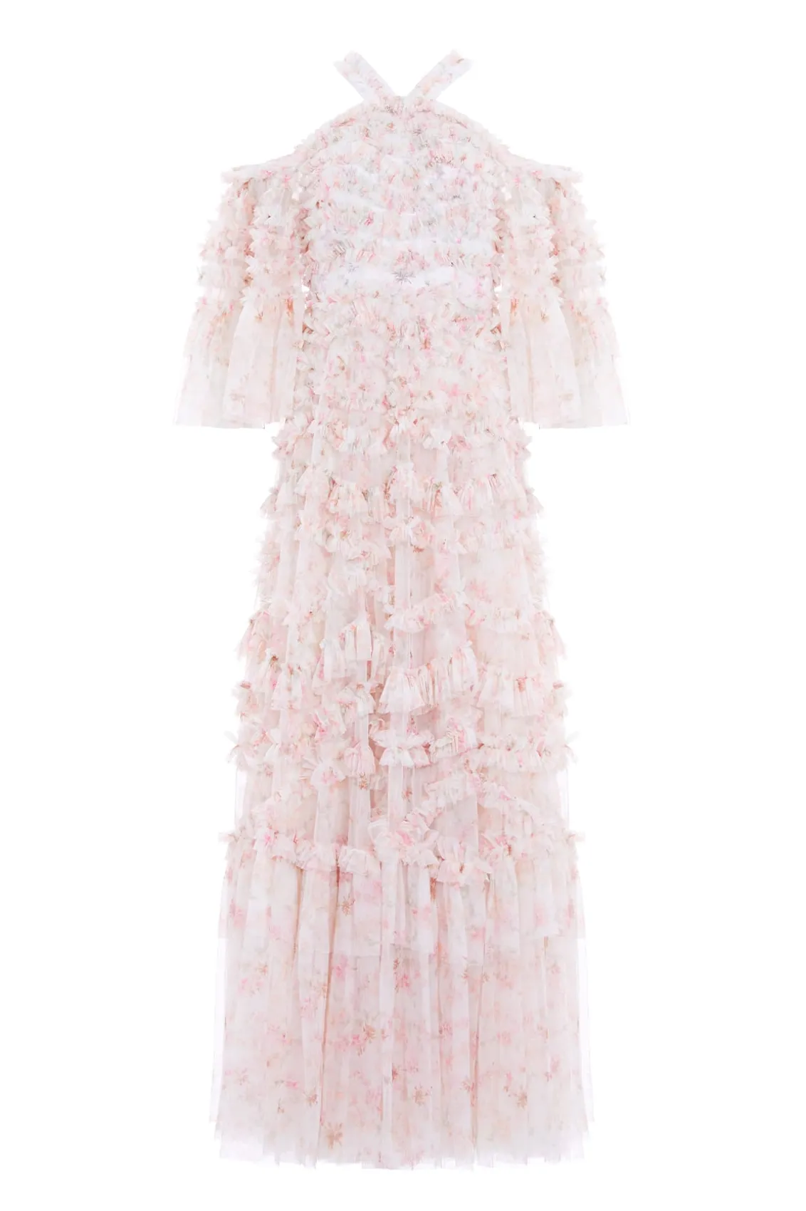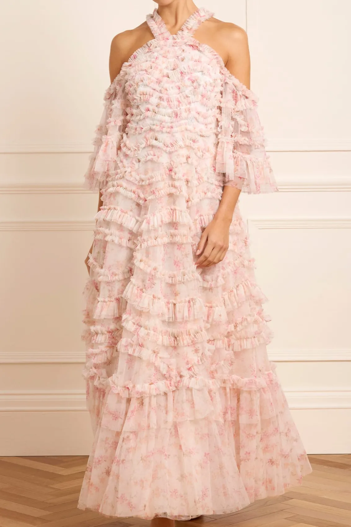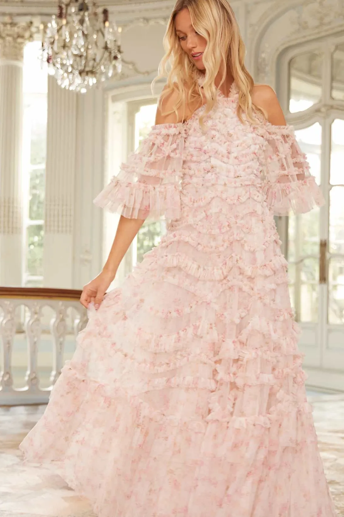NEW SEASON. The Ophelia Ditsy Bronte Off Shoulder Gown in Moonshine/Pink. This gown features a beautiful, romantic trailing print taken from an archive, hand-painted artwork from the early 1900s, depicting soft, whimsical ditsy floating florals. Designed with short, fluted sleeves and delicate tulle ruffles that mirror the gown’s intricate detailing. The statement off-the-shoulder gown has a flattering curved neckline and straps, both adorned with signature Needle & Thread soft tulle ruffles. The silhouette is exceptionally flattering, with a fitted bodice that flows into a generous skirt made up of layers of net and tulle, culminating in a sweeping hemline that ensures a breathtaking entrance.