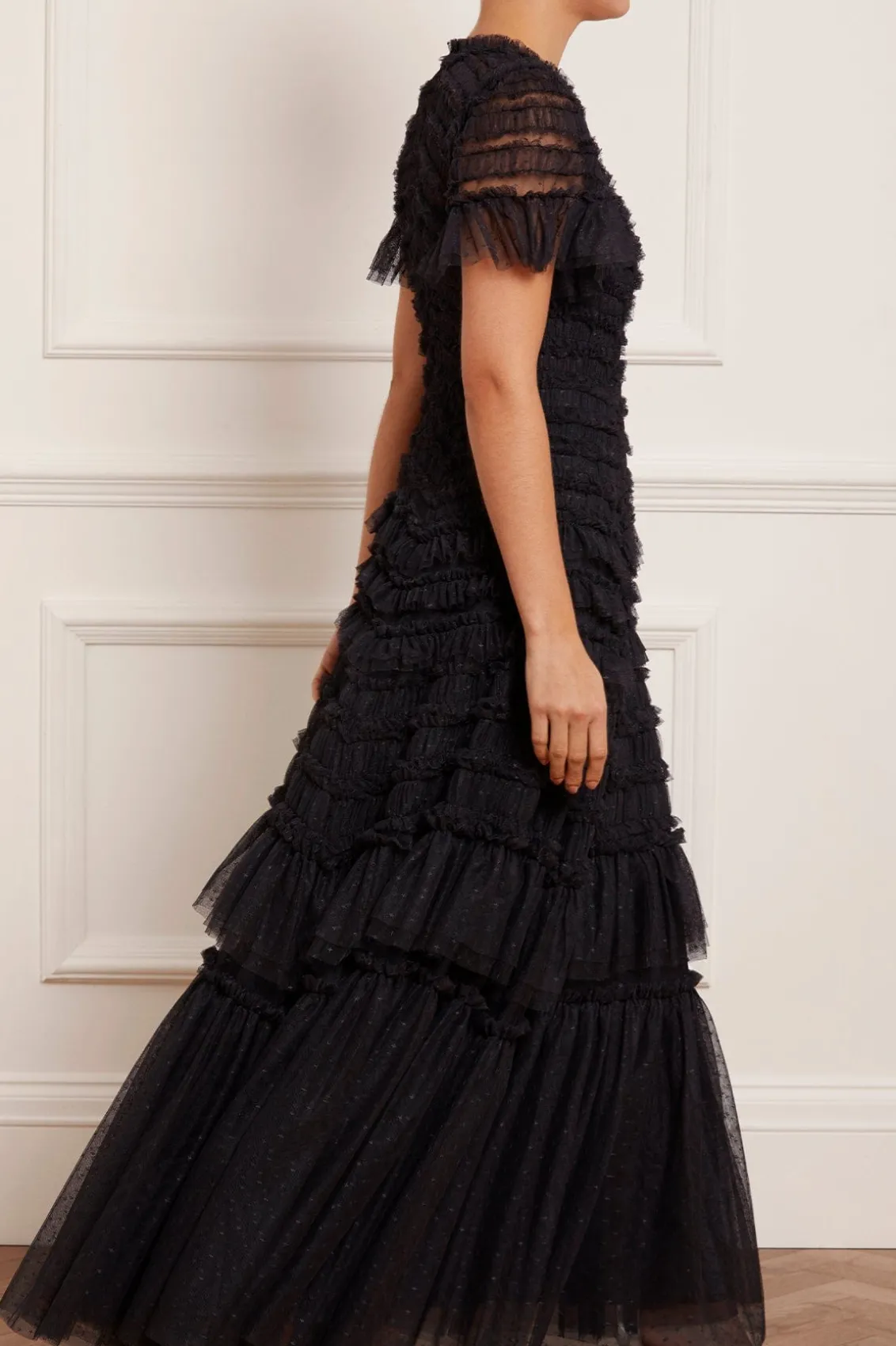 The Valentine Ruffle Gown in Graphite. A signature Needle & Thread style developed with textile ruffles and flattering tulle, creating a romantic look. The ruffles cascade down the dress, starting smaller and gradually getting bigger towards the hem to create soft, fluid movement. Crafted from our signature Needle & Thread kisses tulle. Make a statement in the Valentine.