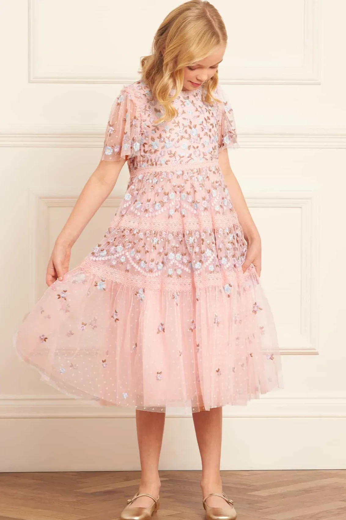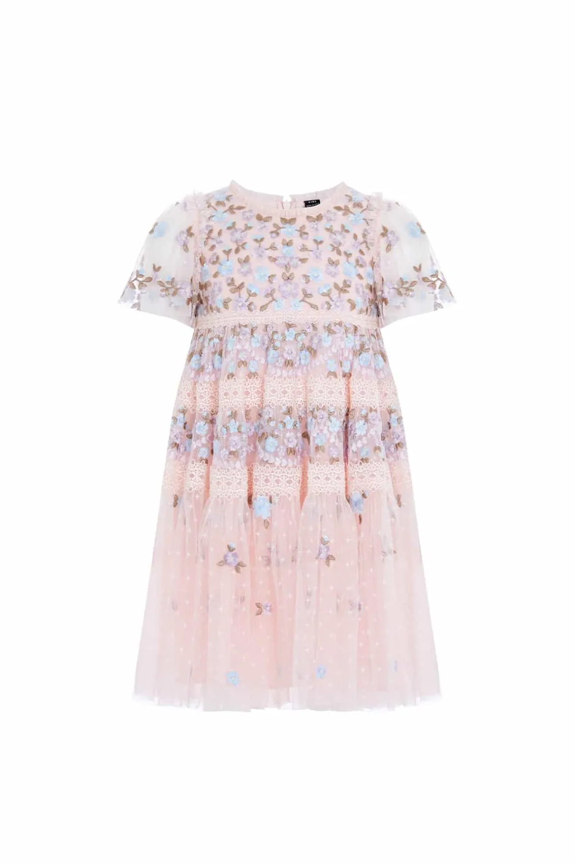 NEW SEASON. The Garland Ribbon Kids Dress in Dusk Pink. This enchanting dress features intricate embroidery inspired by Victorian lace, with delicate pastel florals and fresh white accents. The tiered skirt, adorned with signature Needle & Thread detailing, adds a touch of magic. A perfect fairytale piece for your little one’s special occasions.