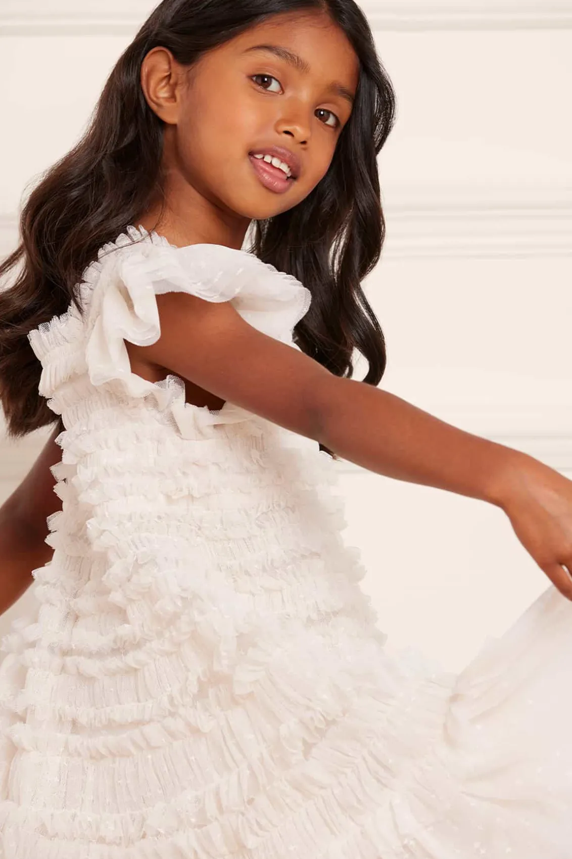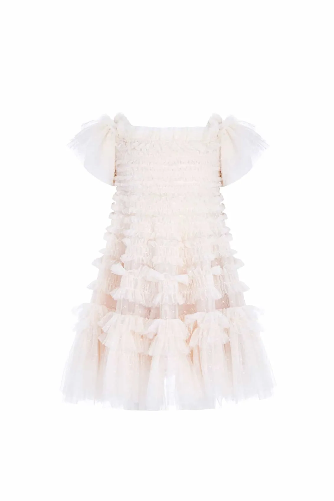 The Lisette KIDS Dress in Cream. This dress is beautifully designed with a signature Needle & Thread textile. Crafted with a playful, frothy texture created using soft tulle panels gathered to create an all over pretty effect. Designed with short sleeves and underlayers of tulle to create a generous volume skirt. The perfect dress for your little one’s upcoming occasions.