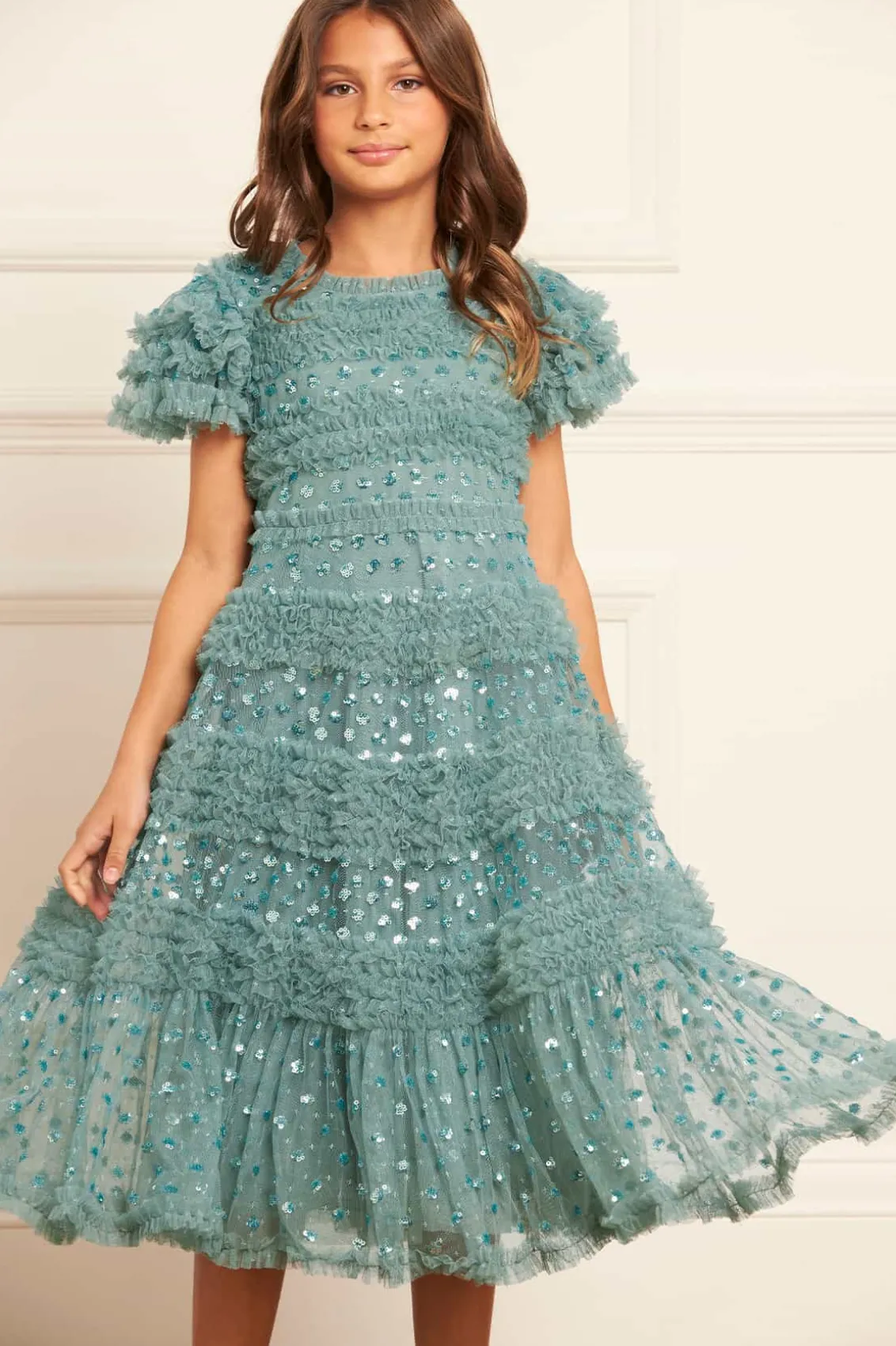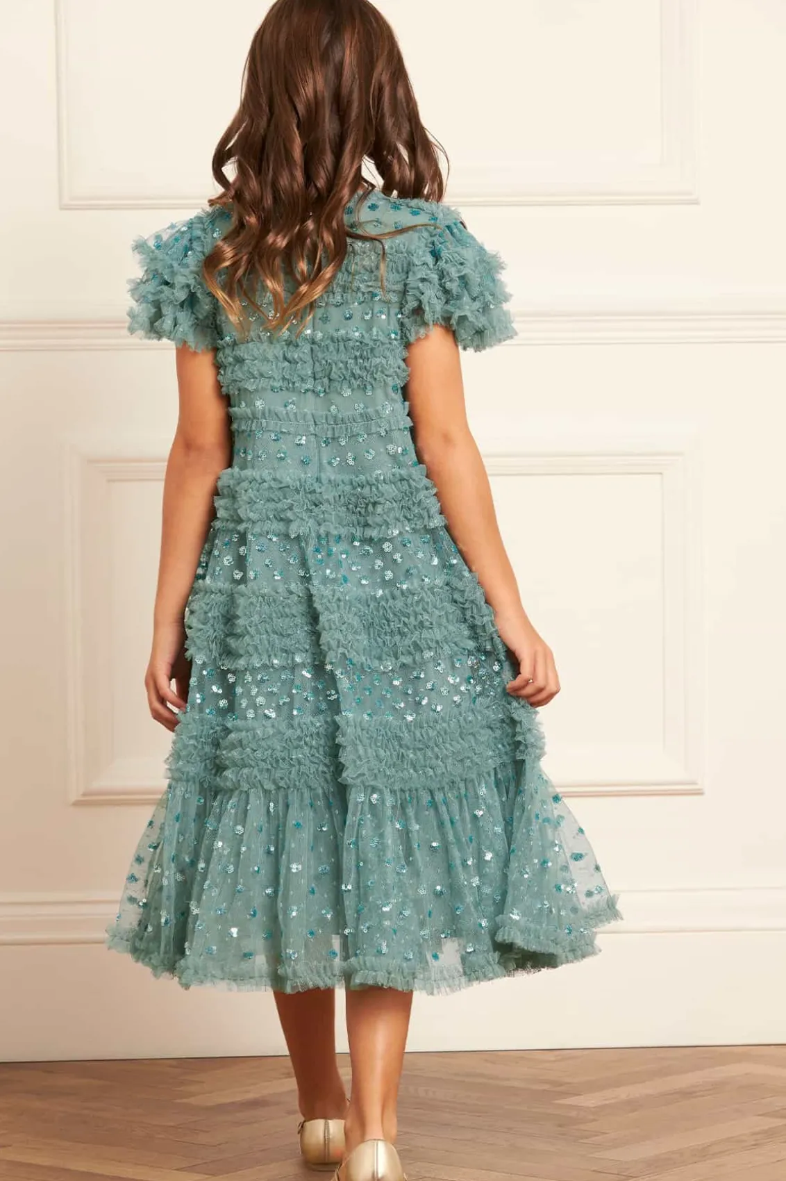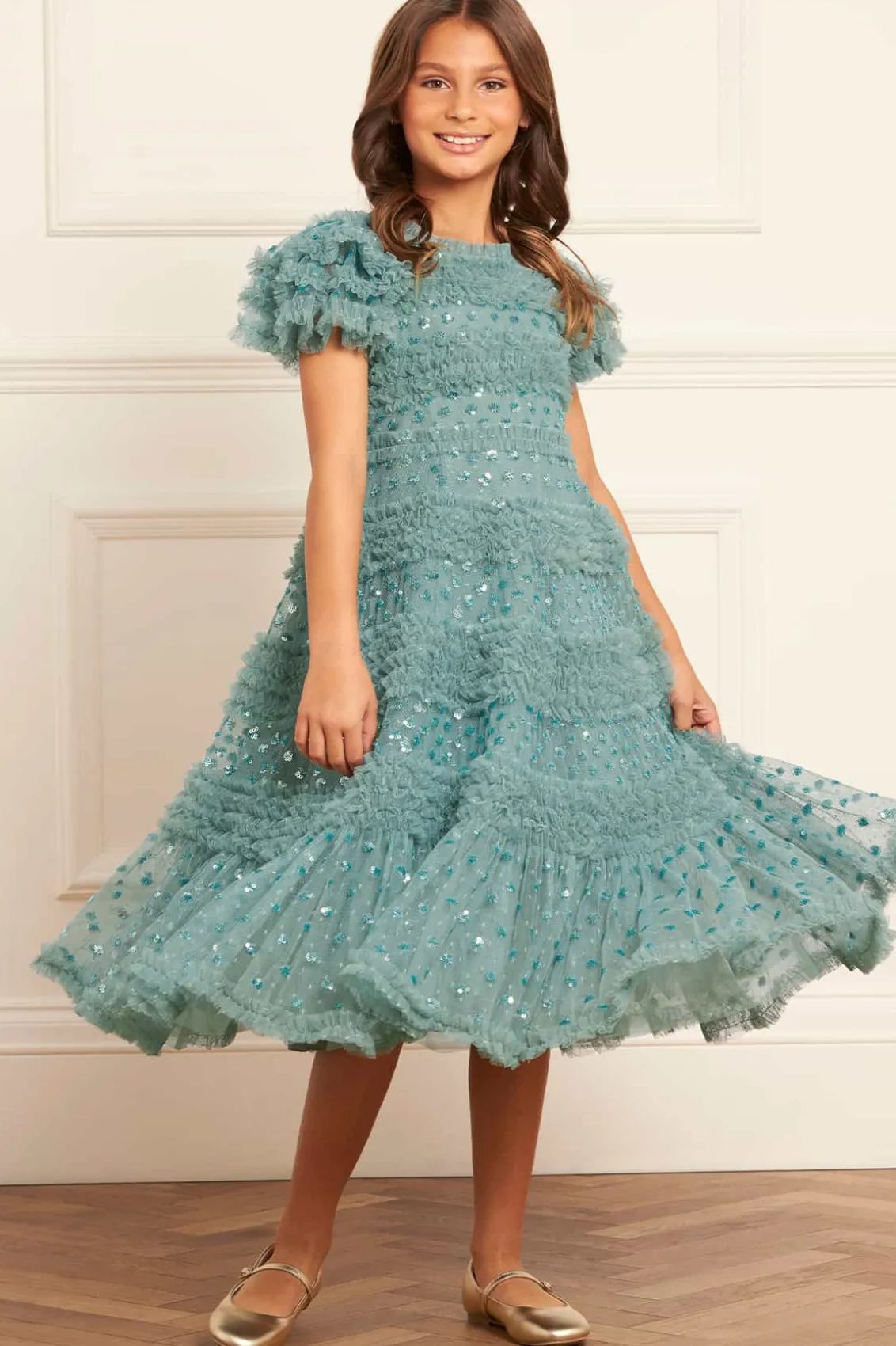 NEW SEASON. The Vivian Kids Dress in Aquamarine. This charming dress features sparkling sequin polka dots scattered across a playful silhouette. Designed with tulle frills and ruffled sleeves, crafted with signature Needle & Thread detailing, add a whimsical touch. The perfect dress to make your little one shine at their next special event.