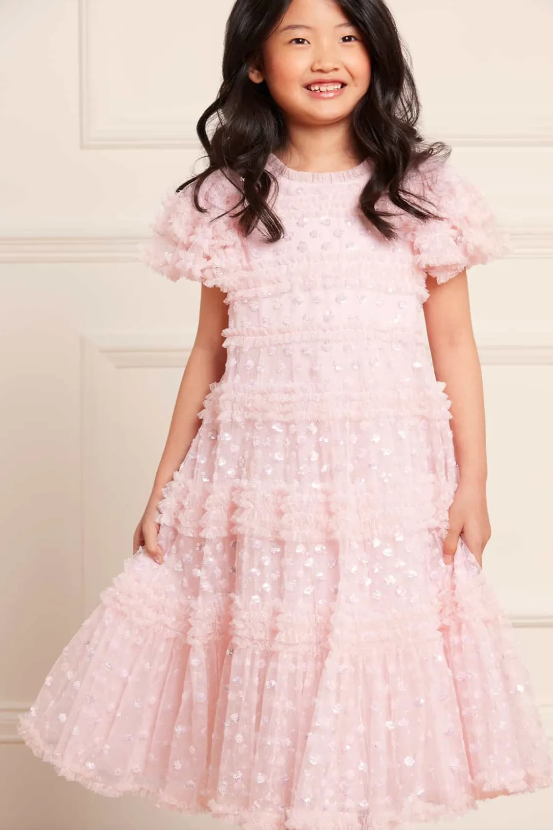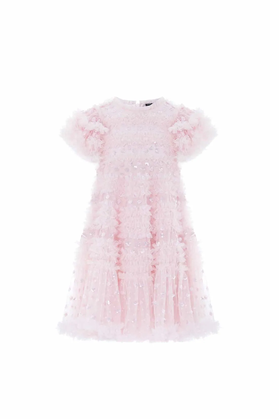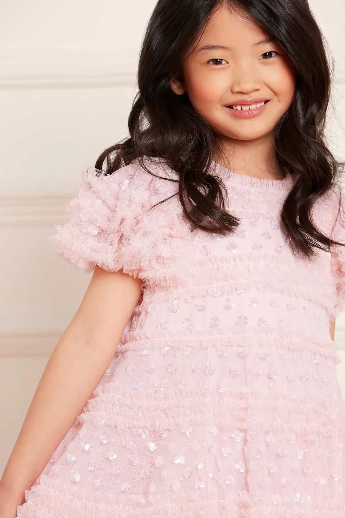 NEW SEASON. The Vivian KIDS Dress in Dusk Pink. This pretty dress is adorned with sparkling sequin polka dot motifs, scattered throughout. Beautifully designed with a playful silhouette, tulle frills and ruffled sleeves for signature Needle & Thread detailing. Let your little one shine at their next event.