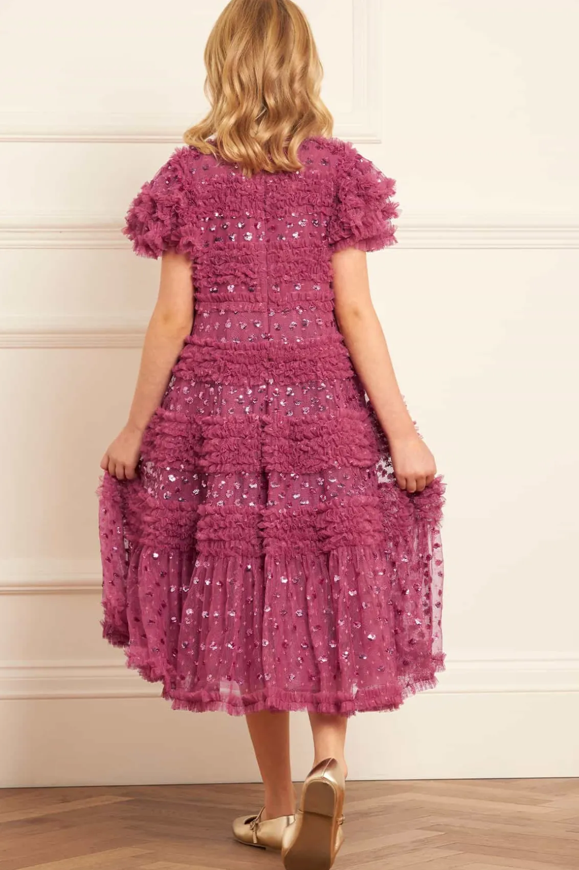 NEW SEASON. The Vivian Kids Dress in Pink Topaz. This charming dress features sparkling sequin polka dots scattered across a playful silhouette. Designed with tulle frills and ruffled sleeves, crafted with signature Needle & Thread detailing, add a whimsical touch. The perfect dress to make your little one shine at their next special event.