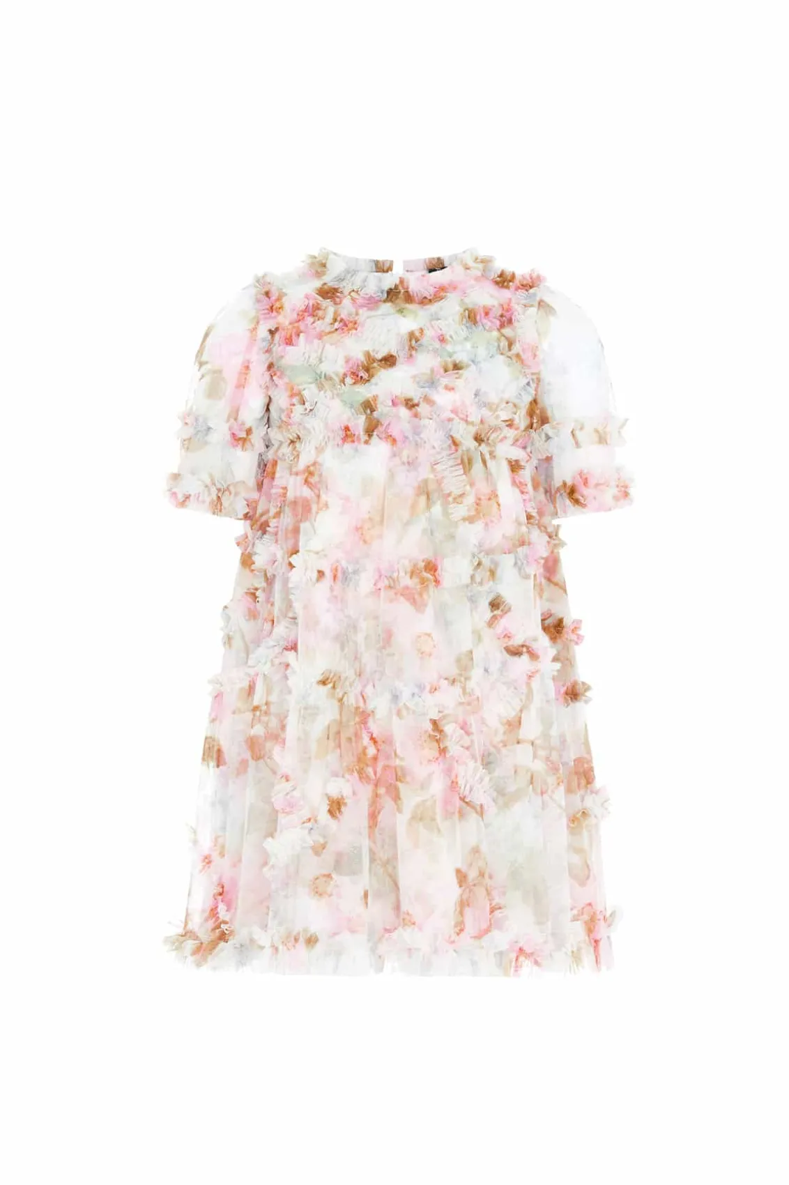 The Enchanted Garden Maeve Kids Dress in Moonshine. This signature Needle & Thread style print is taken from archive hand-painted wallpaper design depicting romantic garden florals and historical motifs. Created in our soft signature tulle fabric with perfectly placed gathered frills to create a pretty, frothy textile. A piece your little one will forever treasure.