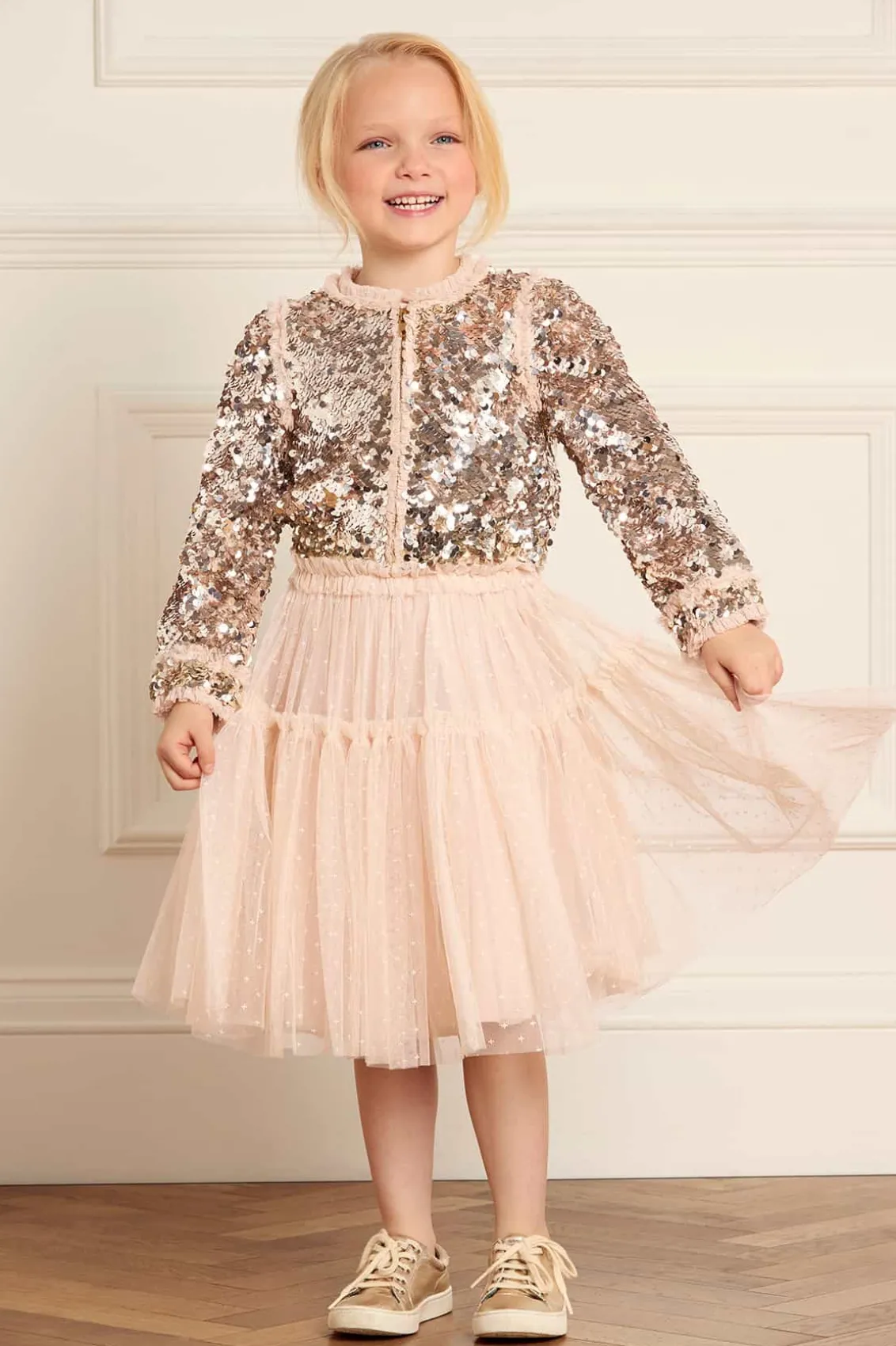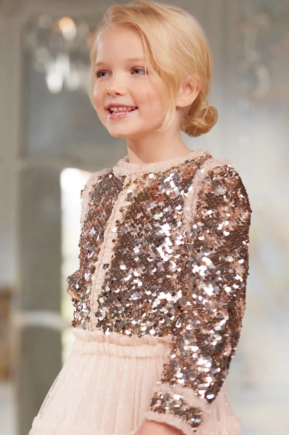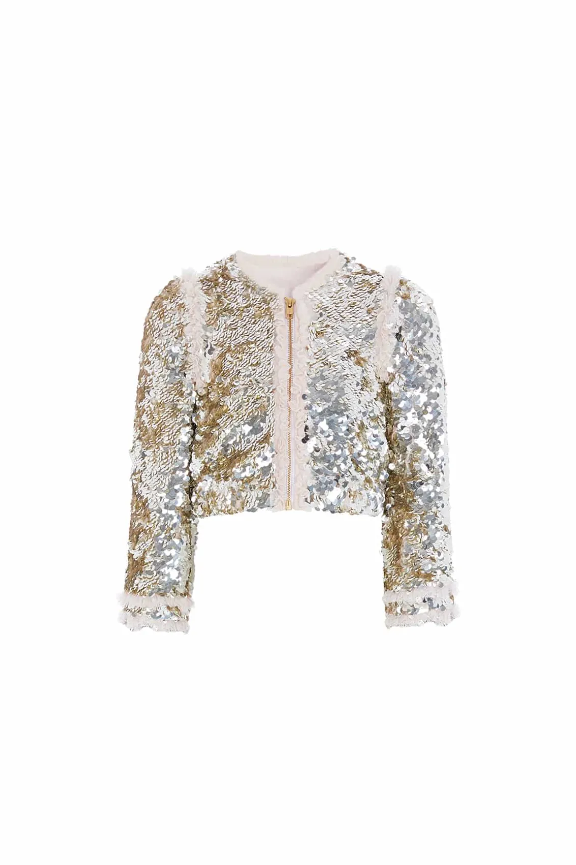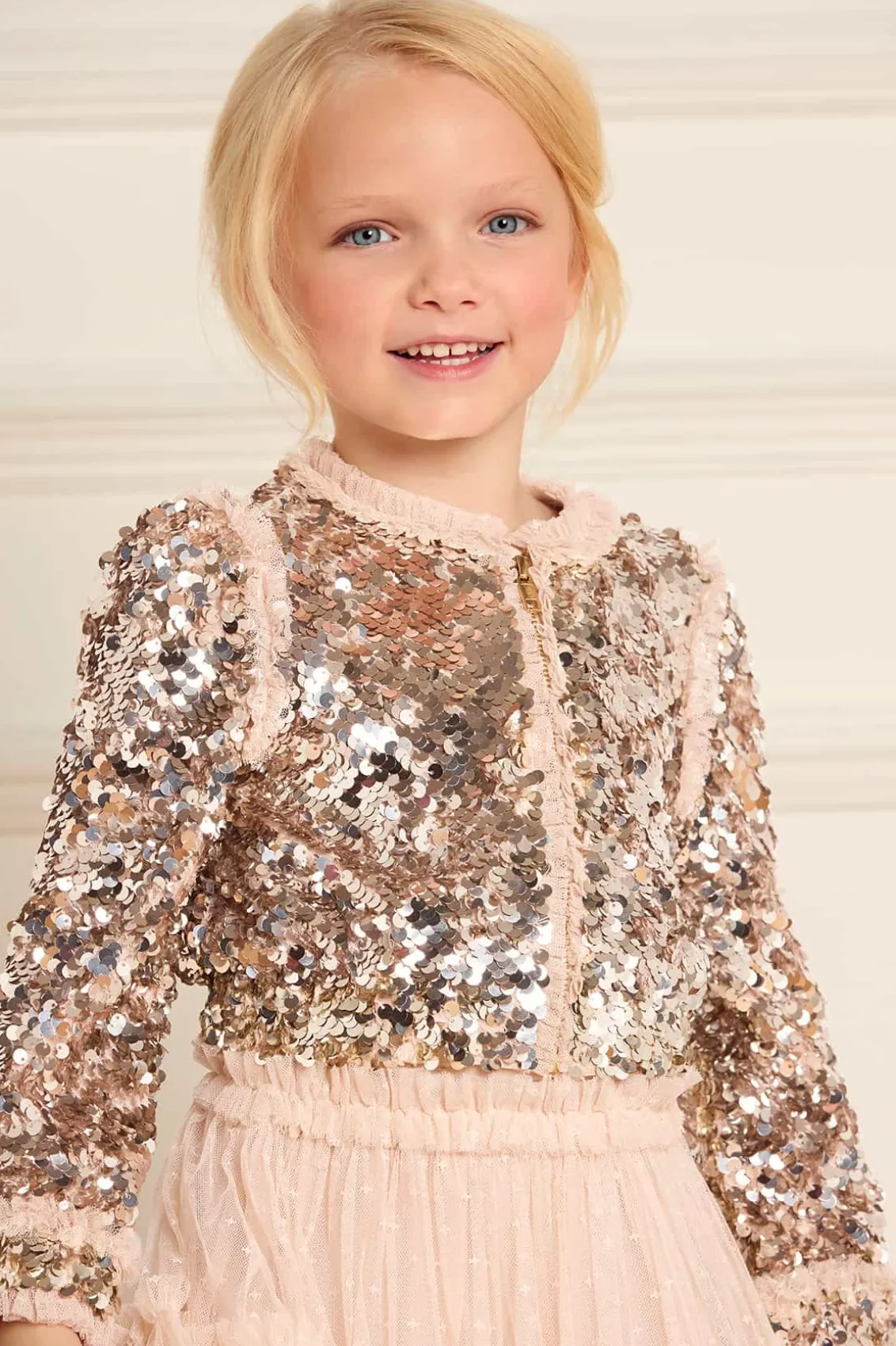 The Hallie KIDS Bomber Jacket in Silver. Reintroducing a signature archive product: The Needle & Thread bomber jacket. This playful cropped bomber is designed to be styled with our Tulle KIDS Skirt for the prettiest statement co-ord. Developed with signature frills on the cuffs, shoulders, and around the zip, creating a frothy texture. This charming piece is embellished with a specially developed all-over sequin fabric, made by intricately applying delicate side-hole sequins that overlap to form a decadent, luxe, shimmering effect. This bomber will be the star of their wardrobe.