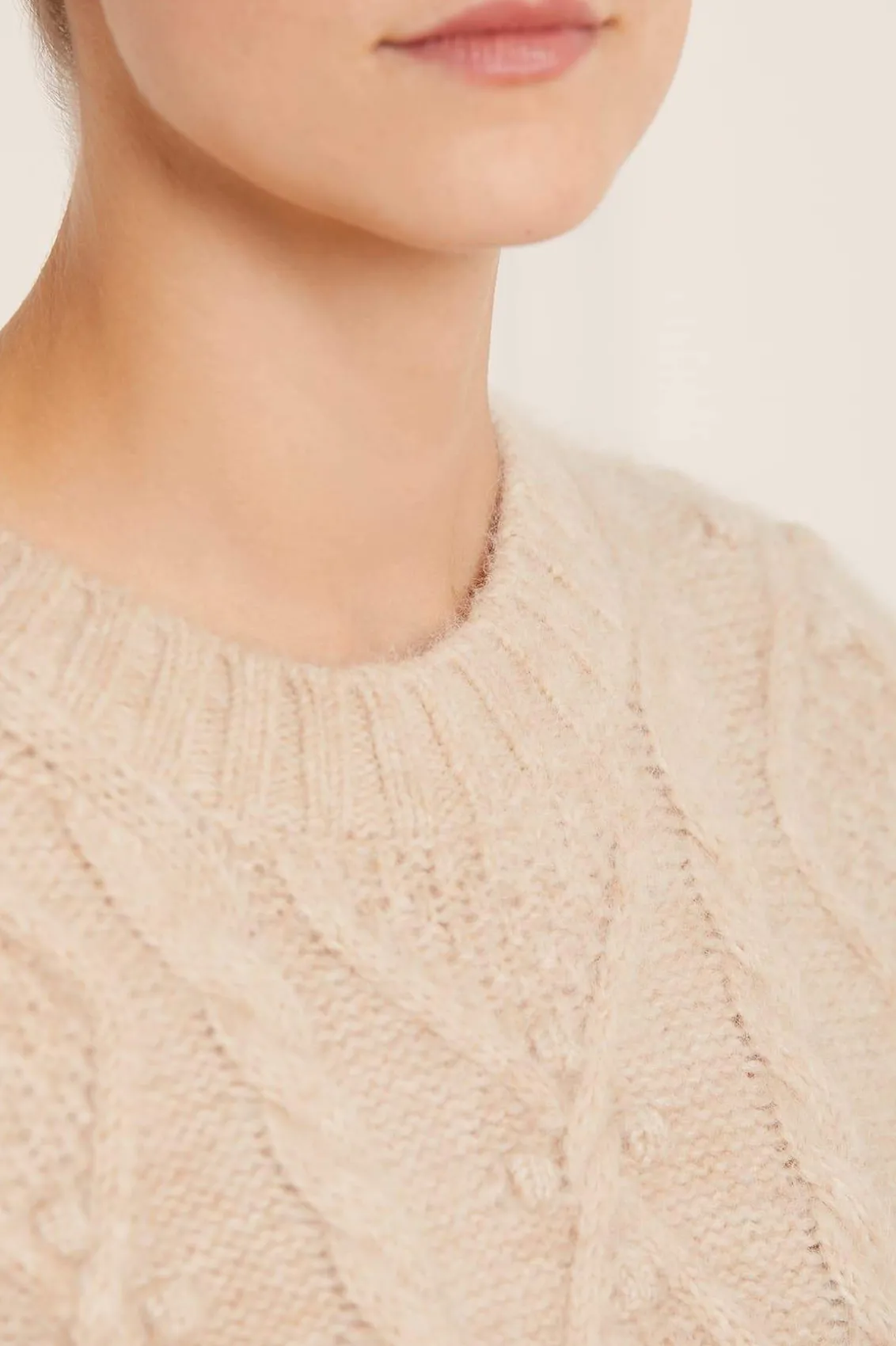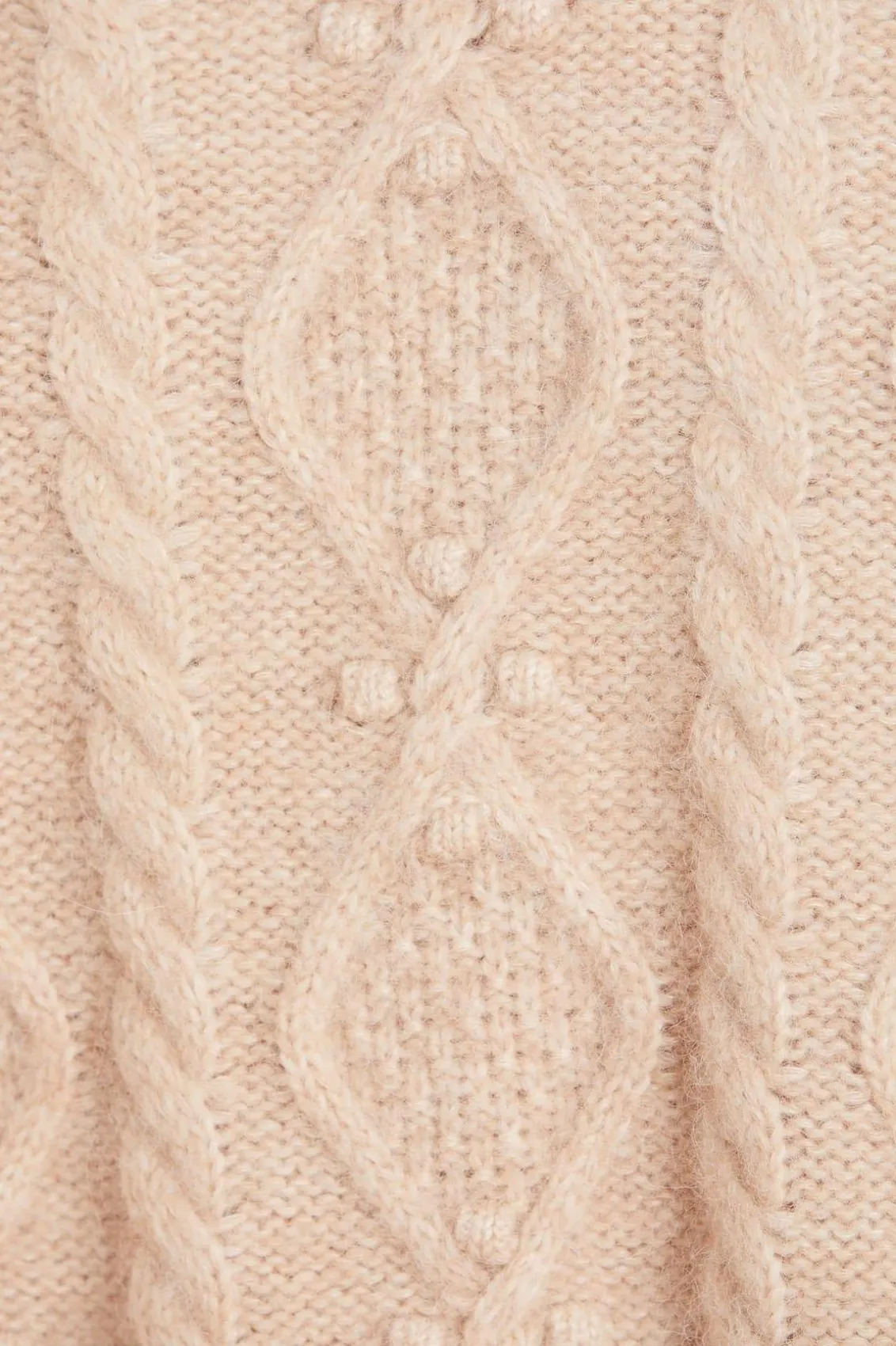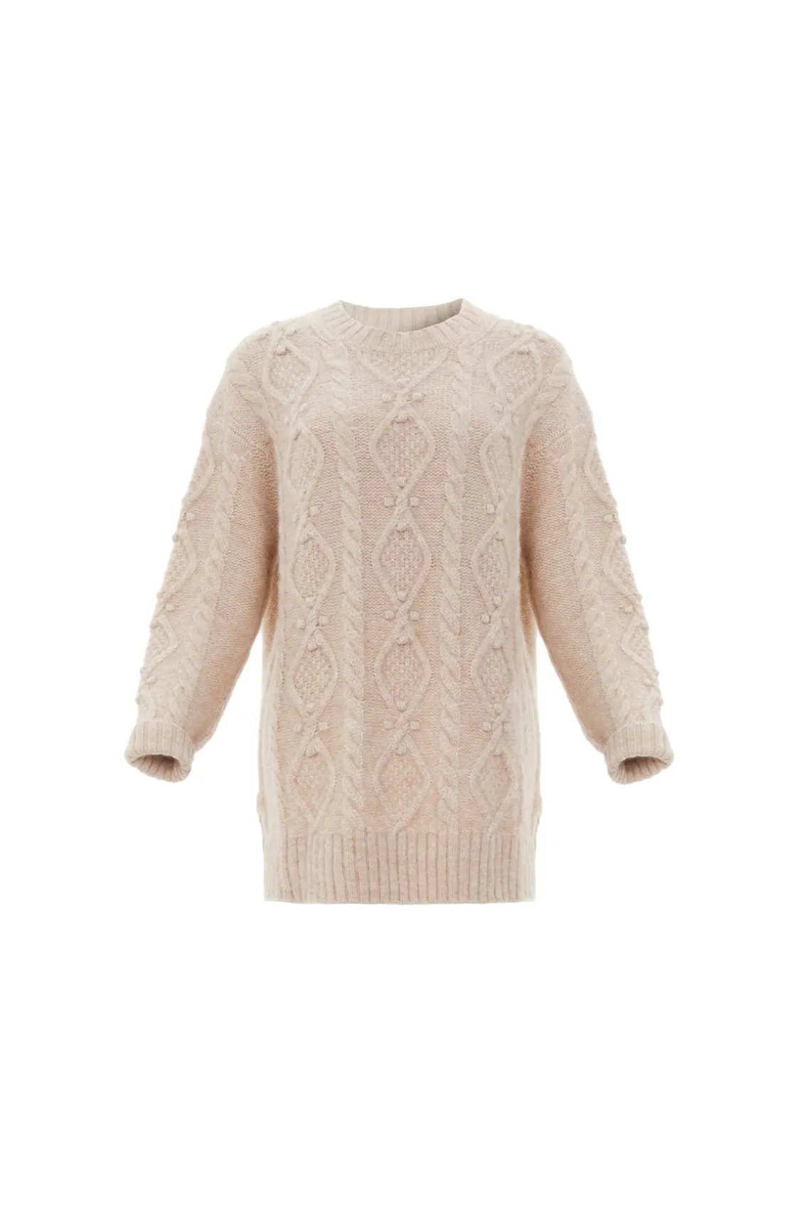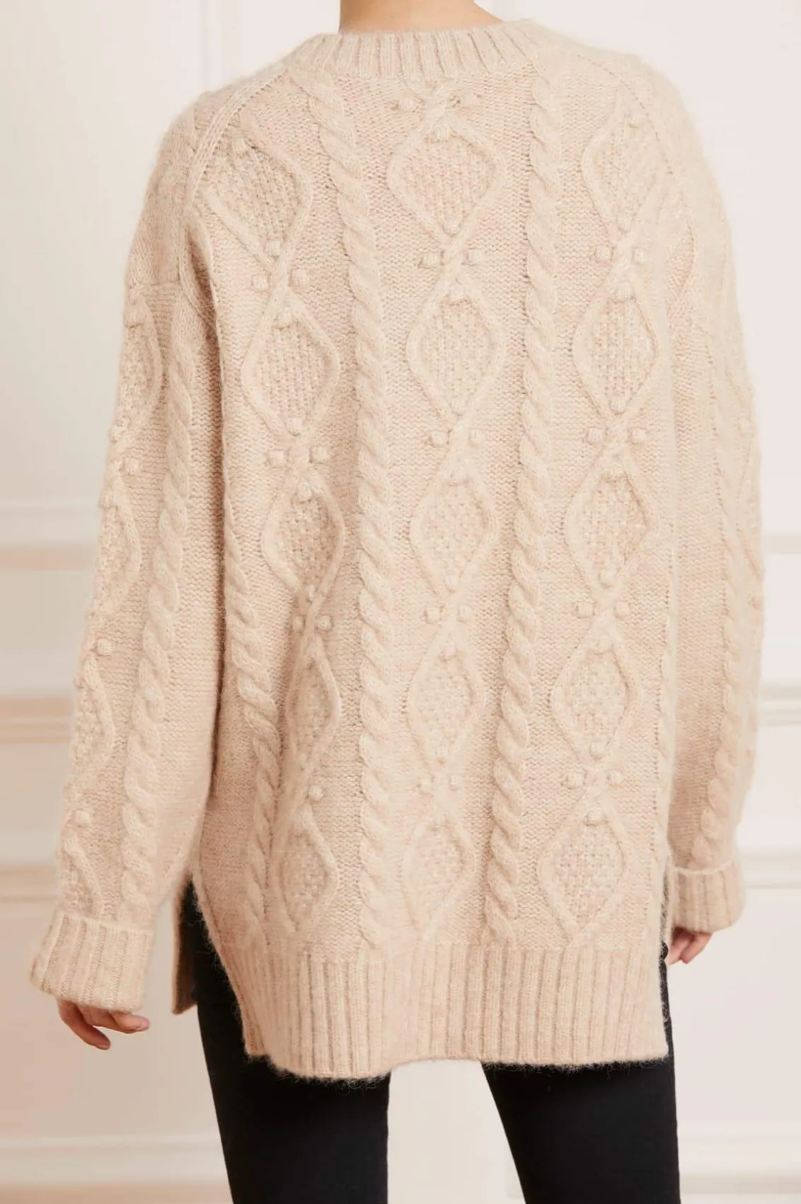 NEEDLE & THREAD EXCLUSIVE. The Sylvie Cable Longline Jumper in Birch. This premium knitwear piece is designed in a super-soft, fluffy alpaca-blend yarn. This cosy jumper is crafted with a mix of diamond-shaped cables and twists in an intricate textile. Adorned with playful flower bobbles adding a feminine texture. Designed with a relaxed fit, subtle split details and loose sleeves to create a cosy feel. The ultimate wardrobe staple this season.