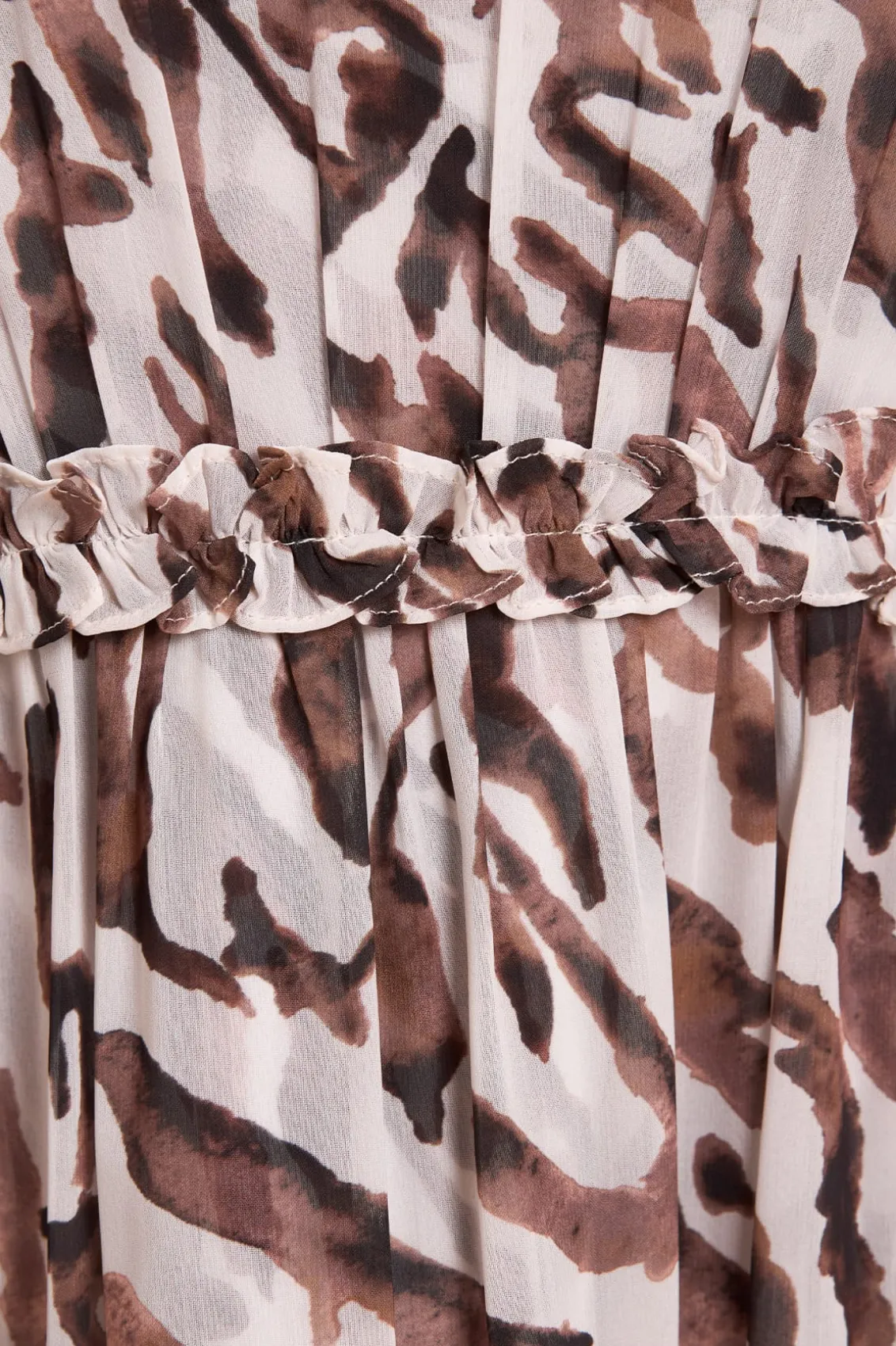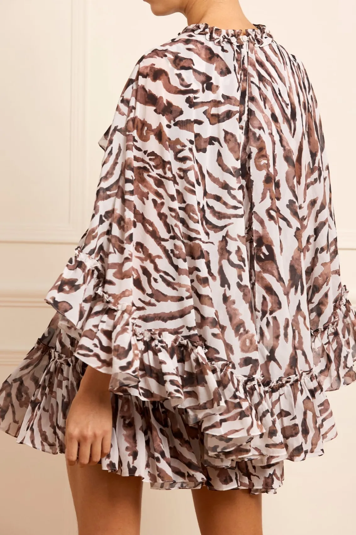 NEW SEASON. The Zebra Harper Chiffon Cape Micro Mini Dress in Moonshine. This zebra print dress showcases hand-painted, water-inspired artwork on soft chiffon for a romantic, flowing silhouette. Featuring a dramatic detachable cape for versatile styling, this chic mini dress transitions effortlessly from day to night.