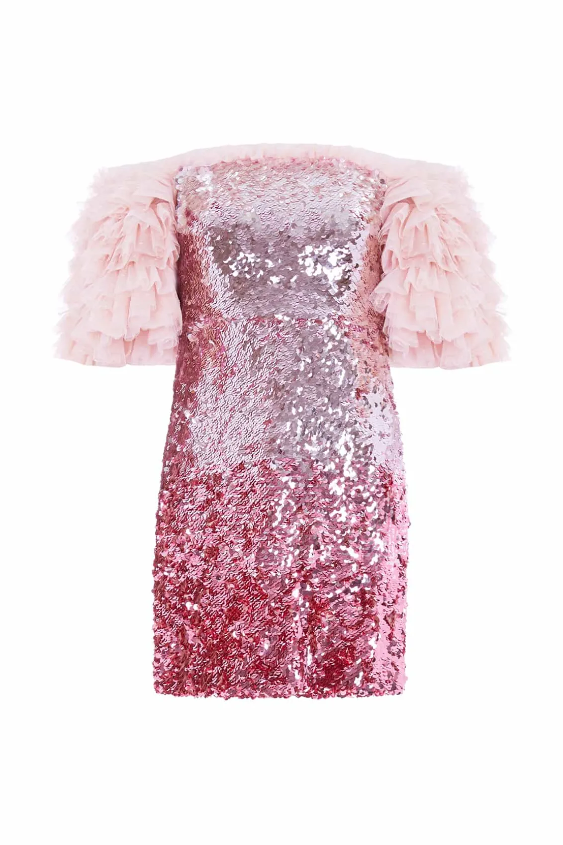 NEEDLE & THREAD EXCLUSIVE. The Essie Ombre Off-Shoulder Micro Mini Dress in Bright Pink. This playful dress is crafted with an off-shoulder design. Beautifully decorated with frothy layered sleeves in soft, delicate tulle. Designed with a slim silhouette, in a micro mini length, decorated with glittering sequins in an ombre effect, transitioning from soft blush pink to bright pink towards the hem. The perfect party dress you’ll wear time and time again.