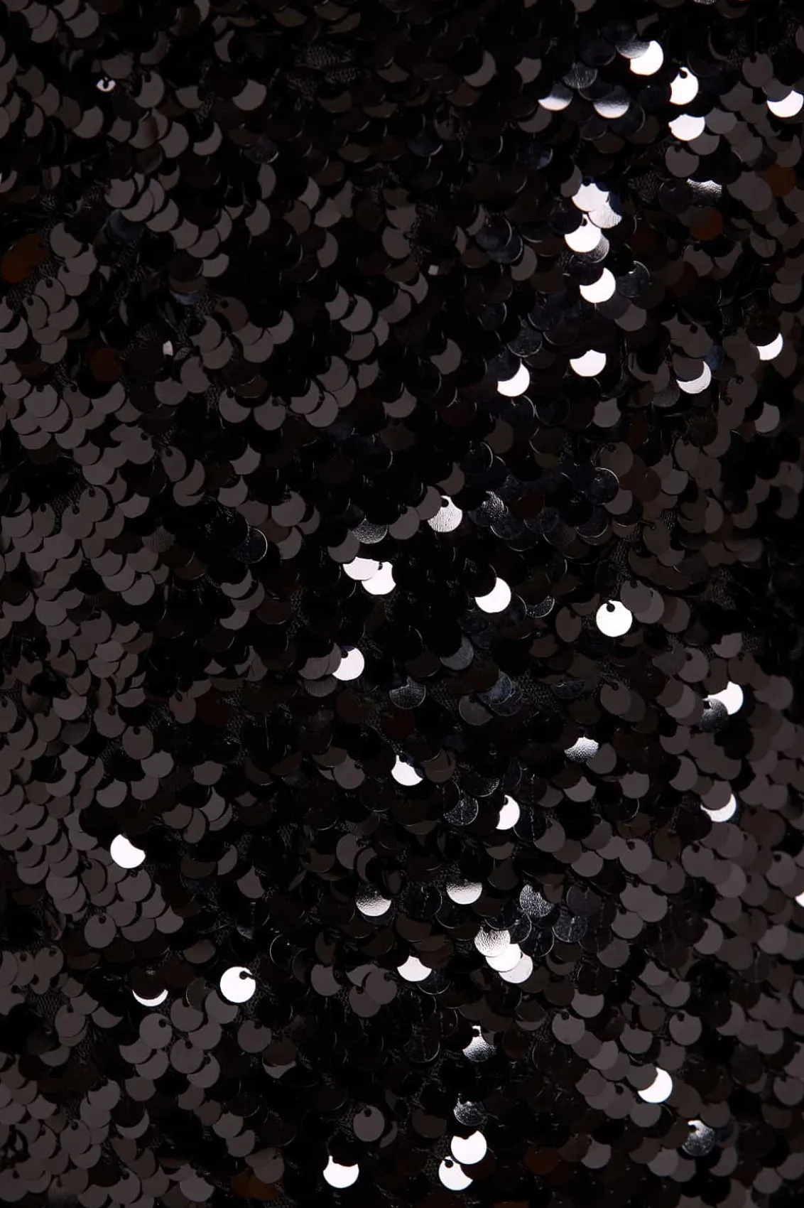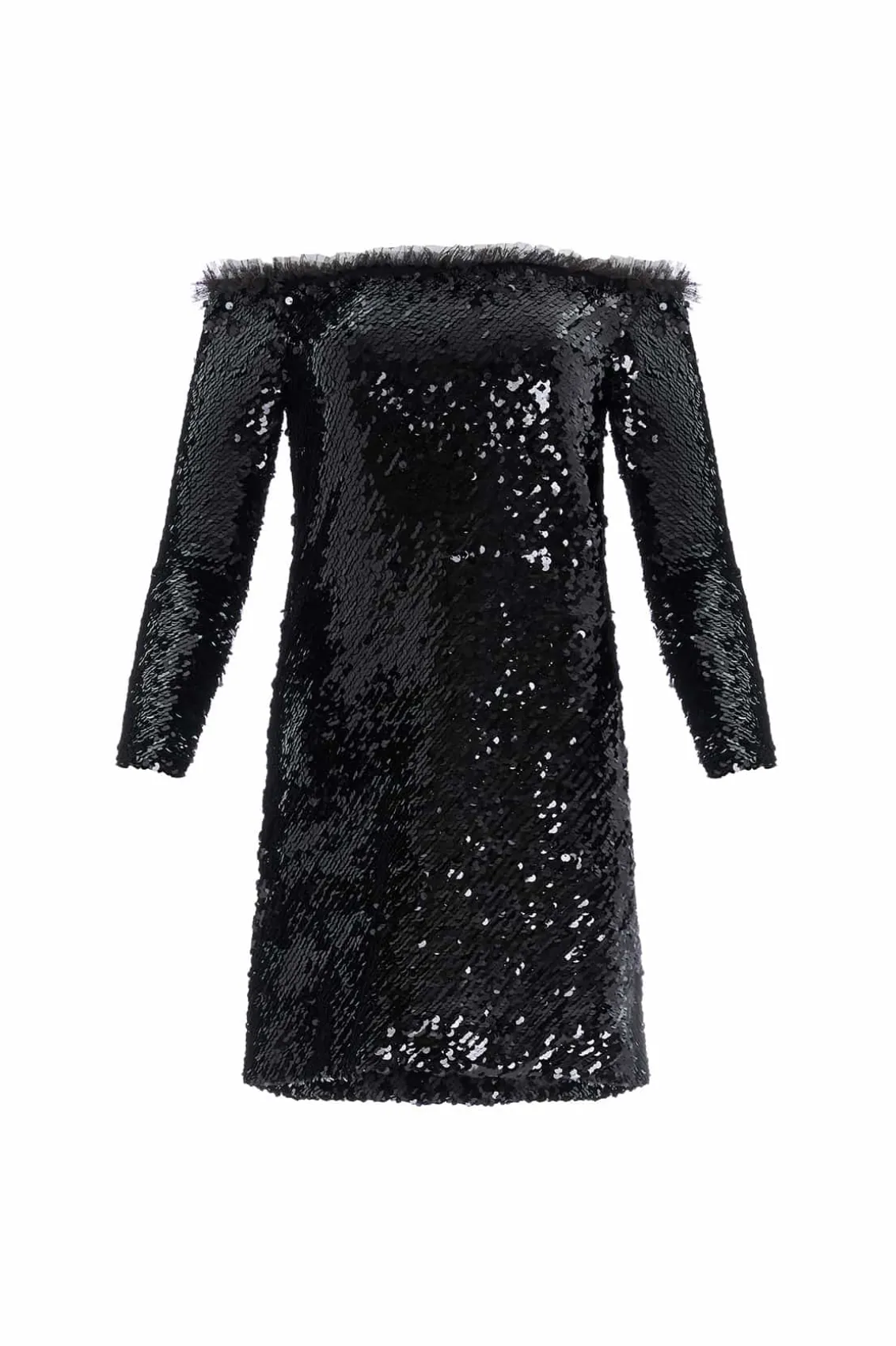 NEEDLE & THREAD EXCLUSIVE. The Evie Off-Shoulder Micro Mini Dress in Graphite. This statement dress is decorated with sparkling sequins. Designed with an elegant off-shoulder design adorned with signature Needle & Thread tulle frills and slim long sleeves. Crafted with a flattering loose-fit A-line silhouette. Developed with an all-over sequin fabric featuring side-hole sequins that overlap to create a decadent, luxe, shimmering look with a stretch base for comfort and style. The dress also includes a mesh bralette for ultimate comfort and an easy fit. The perfect party dress you’ll wear time and time again.