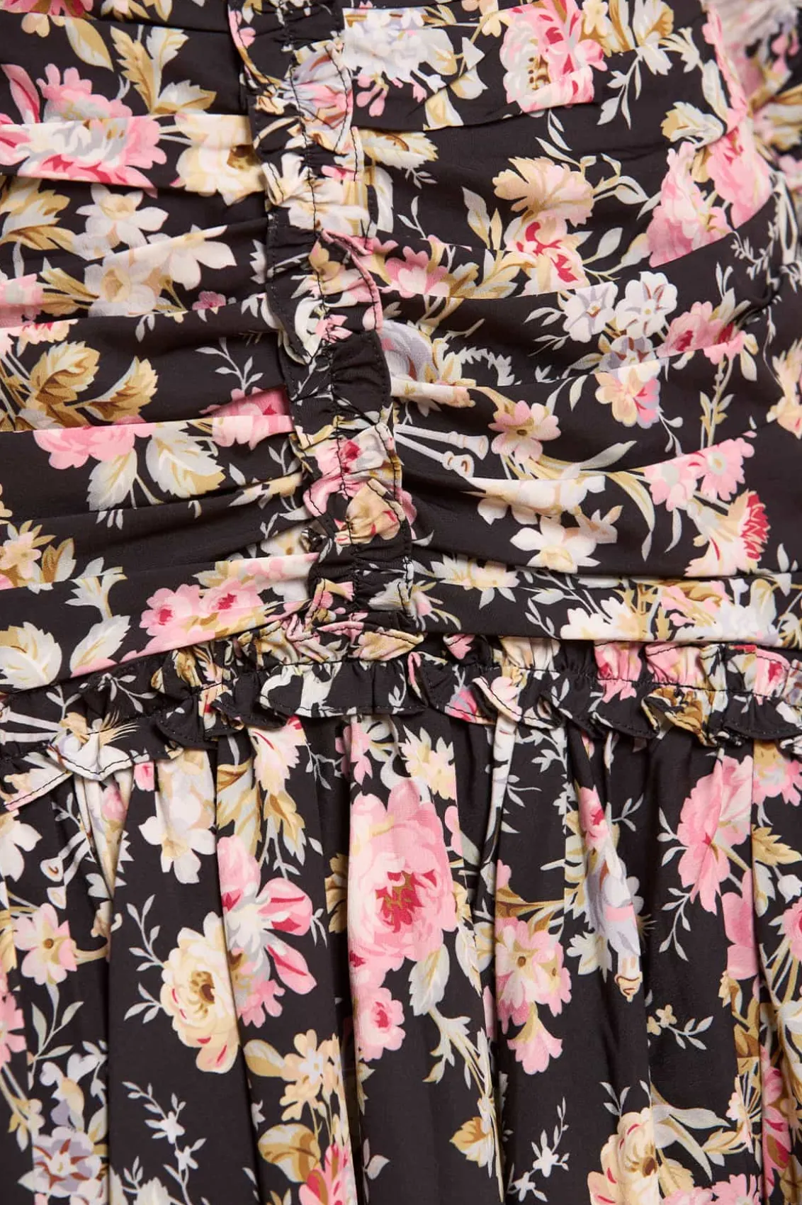 The Enchanted Garden Ellen Crepe Micro Mini Dress in Graphite. A signature Needle & Thread print inspired by an archival hand-painted wallpaper design. This exquisite artwork brings to life a vision of romantic garden florals and historical motifs, beautifully translating the past into contemporary fashion. Crafted from crepe fabric with a touch of stretch, this gown offers a flattering fit that gracefully contours the body. The softly gathered bodice and slim sleeves add a romantic touch, creating a silhouette that is both feminine and sophisticated. The V-neckline, adorned with delicate signature frills, enhances the gown’s charm, making it a perfect choice for any occasion.