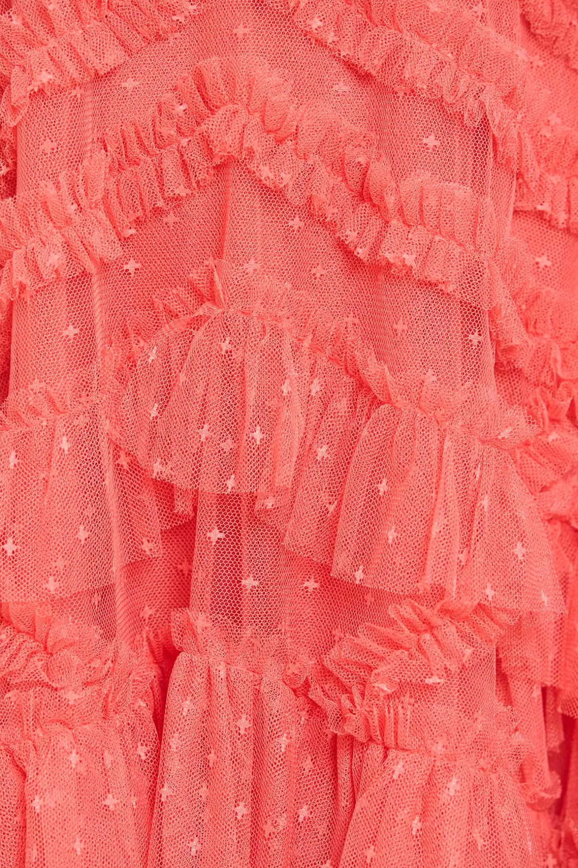The Lola Backless Micro Mini Dress in Pink Sky. This pretty dress is designed with signature Needle & Thread elements. Beautifully adorned with soft tulle and gathered frills, creating a frothy, engineered textile. This mini dress features a backless design for a romantic, playful look. The perfect dress for a wedding guest, birthday or upcoming special event.