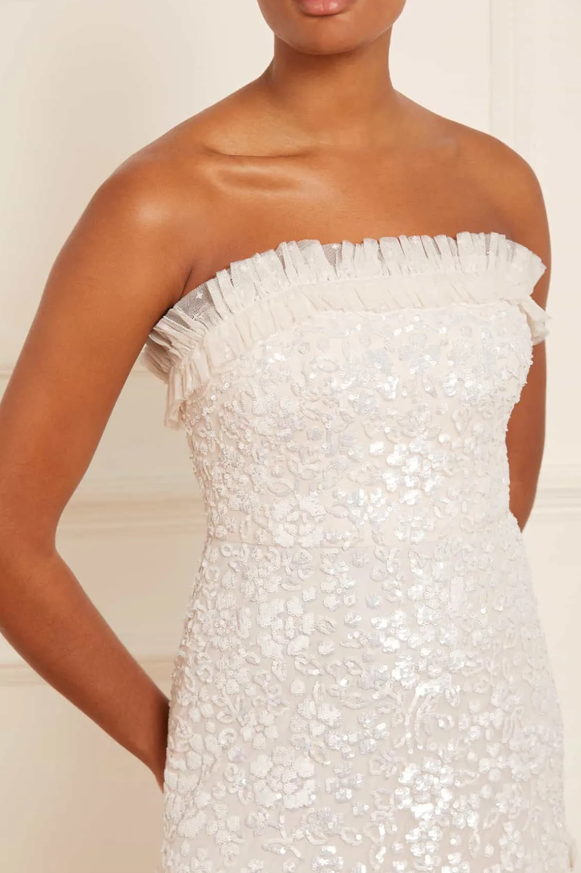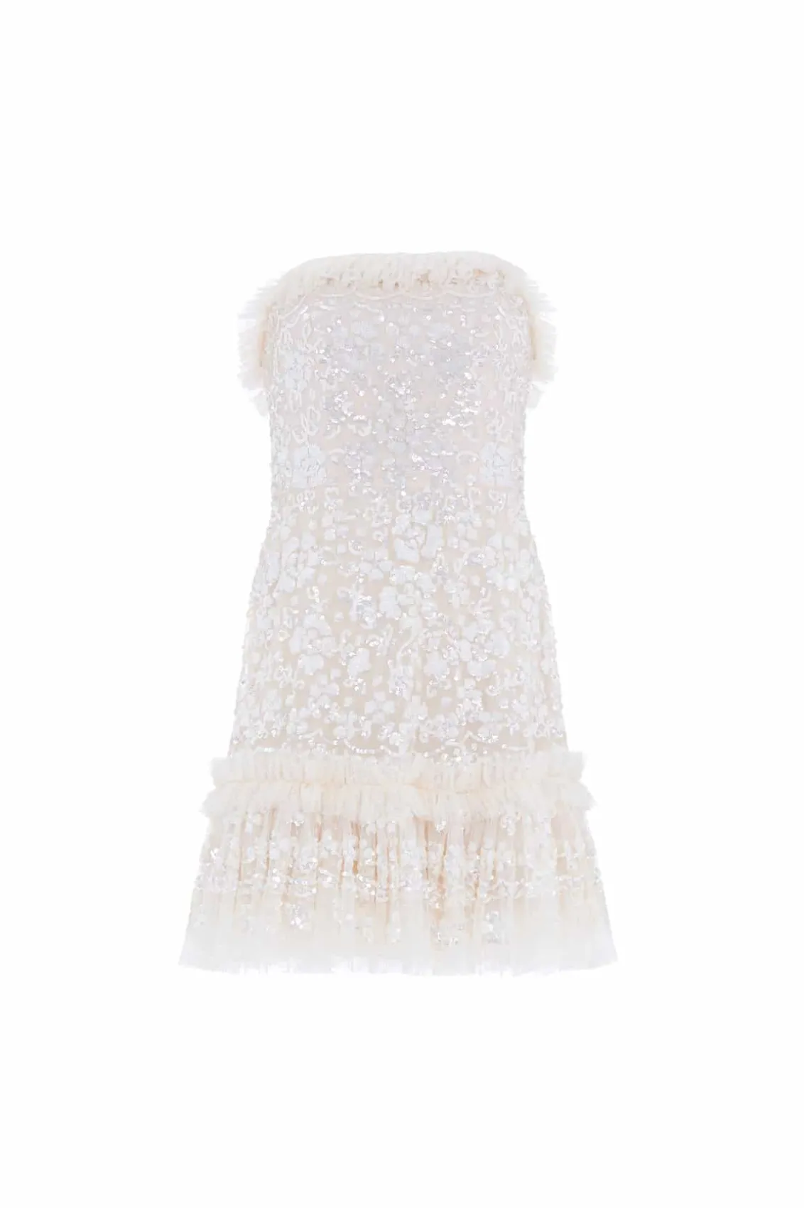 The Regal Rose Gloss Strapless Micro Mini Dress in Cream. The Regal Rose is decorated with elegant, floral artwork featuring delicate lace. This dress is developed with a fitted corset bodice and then flows into a dramatic, voluminous skirt. The integrated corset is made with ribbon stitching, soft boning and panels of stretch mesh fabric for comfort and security in the fit. The perfect dress for a special moment.
