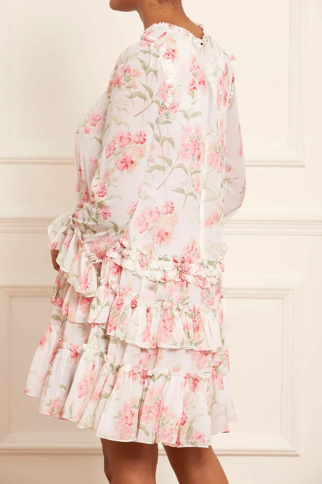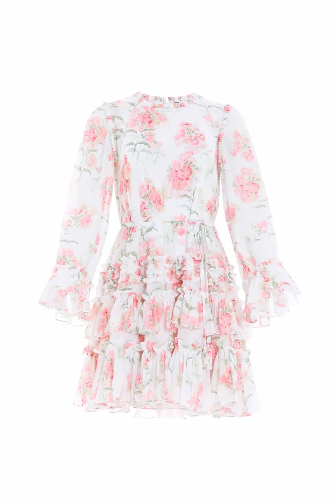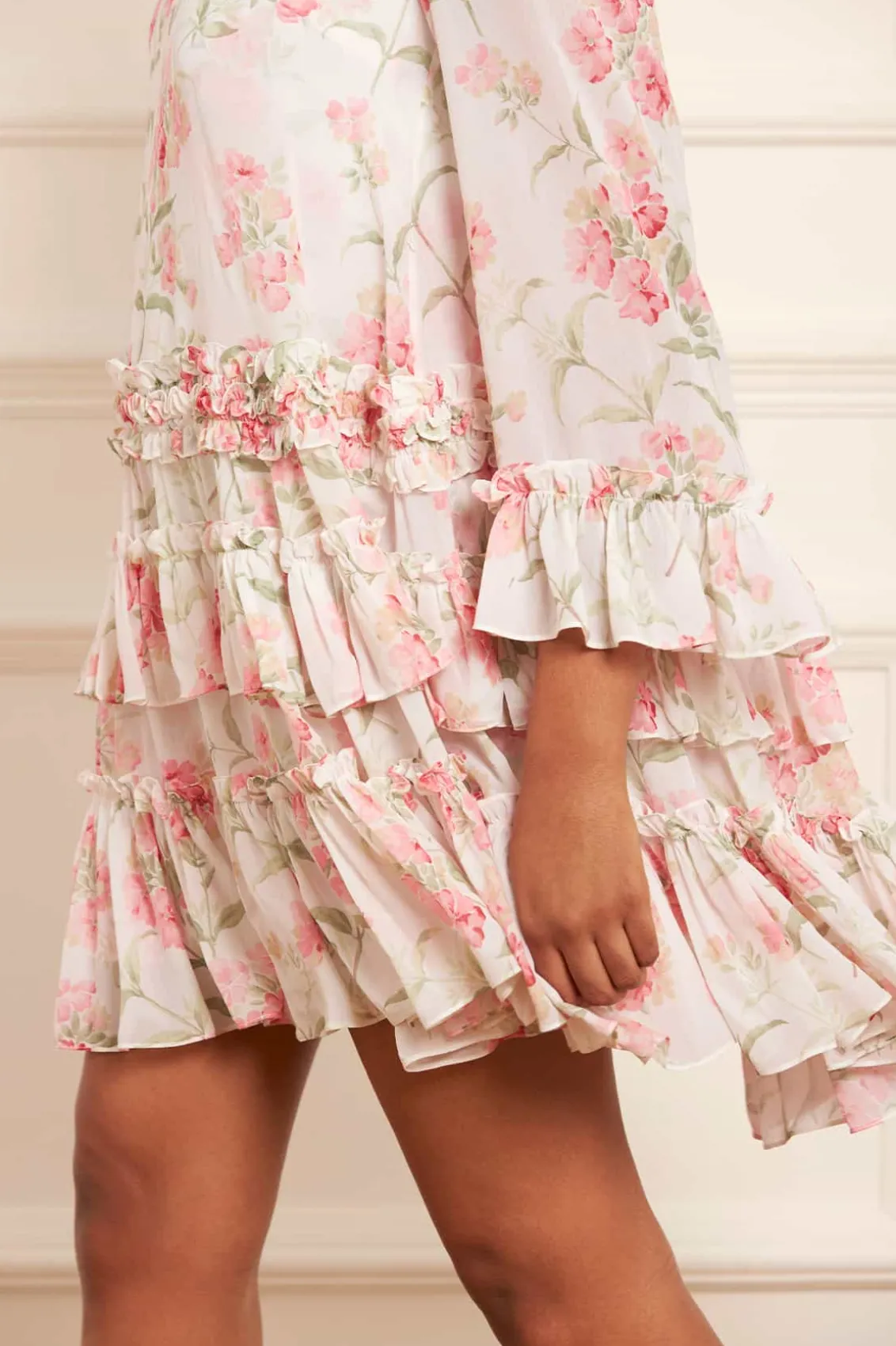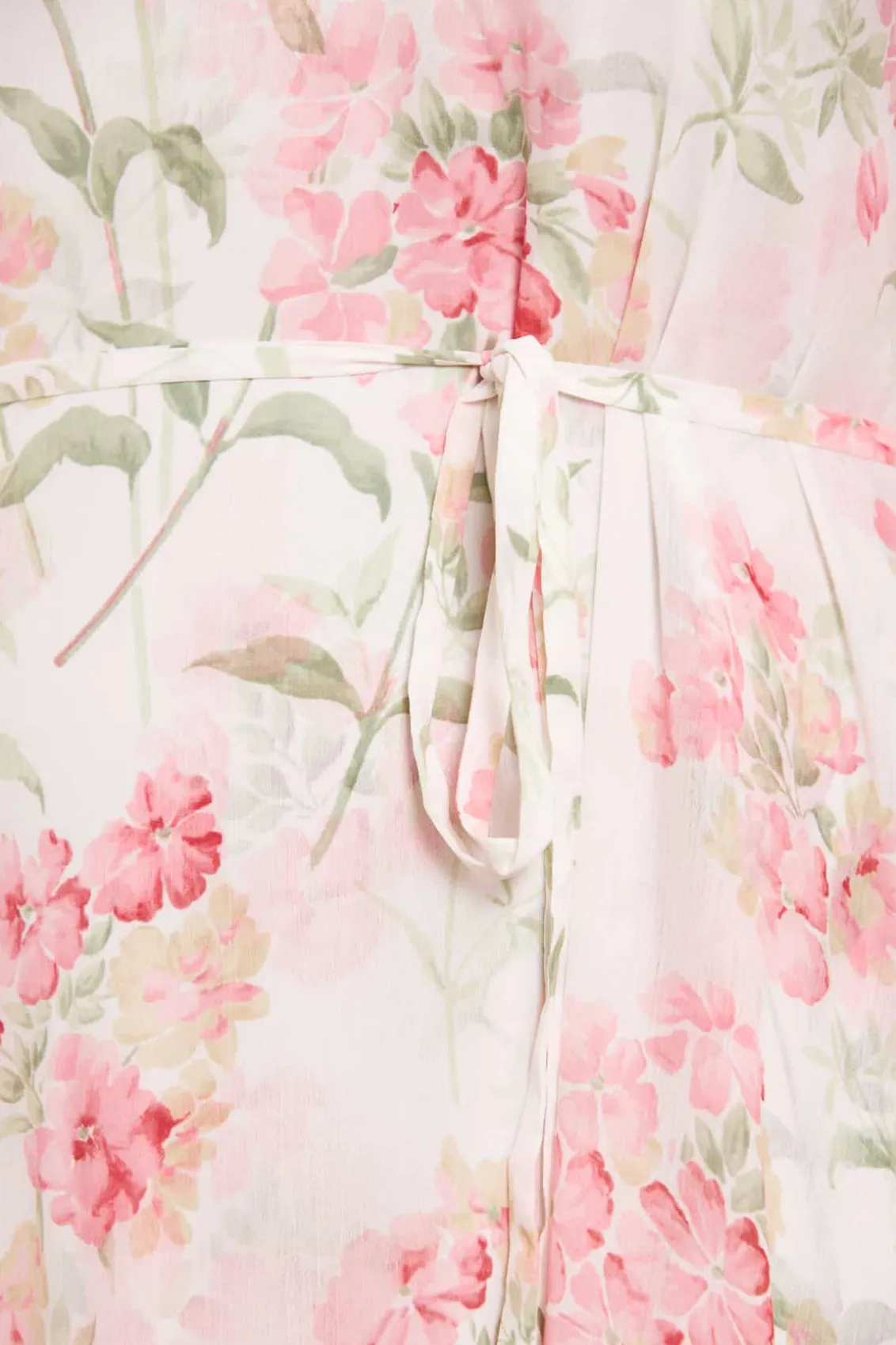 Summer Posy Chiffon Round Neck Mini Dress in Moonshine / Coral. Beautifully designed with a perfect summer print taken from a hand-painted artwork from the early 1900s. This dress is decorated with pretty posy, floral clusters scattered and dispersed throughout to create an all-over beautiful print. Developed with a effortless, loose-fitting silhouette made in soft chiffon, creating this romantic, floaty look. The chiffon fabric is semi-sheer and comes with a separate slip underneath, adding a chic modesty to the dress. Engineered with frills towards the hem of this style for a Needle & Thread signature look. Make this style your new wardrobe staple.