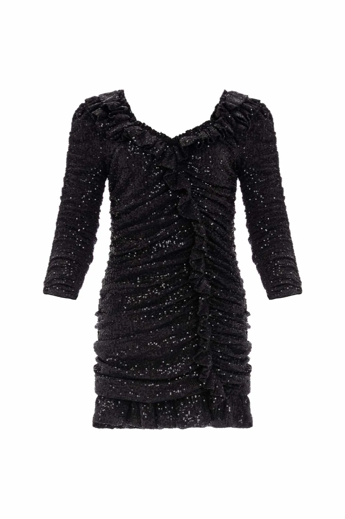 The Sunbeam Rouched Long Sleeve Micro Mini Dress in Graphite. A brand new style for the season ahead. This dress is made from specially sourced sequin fabric, created using the tiniest sequins carefully stitched to the stretch mesh base, creating an all-over shimmering fabric. This mini dress is developed with a flattering silhouette using an expert technique featuring folded frill details for Needle & Thread signature elements. This style is fully lined in power mesh to create ultimate fit and comfort. The perfect piece to shine in golden hour.