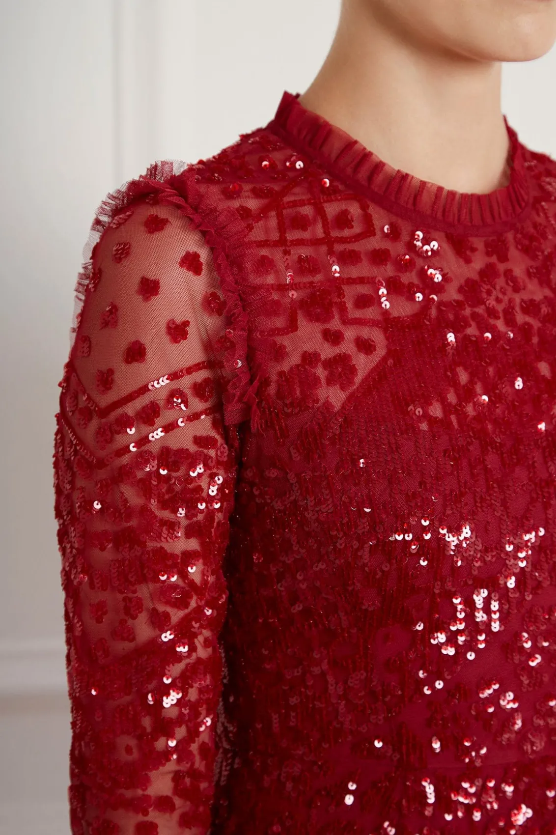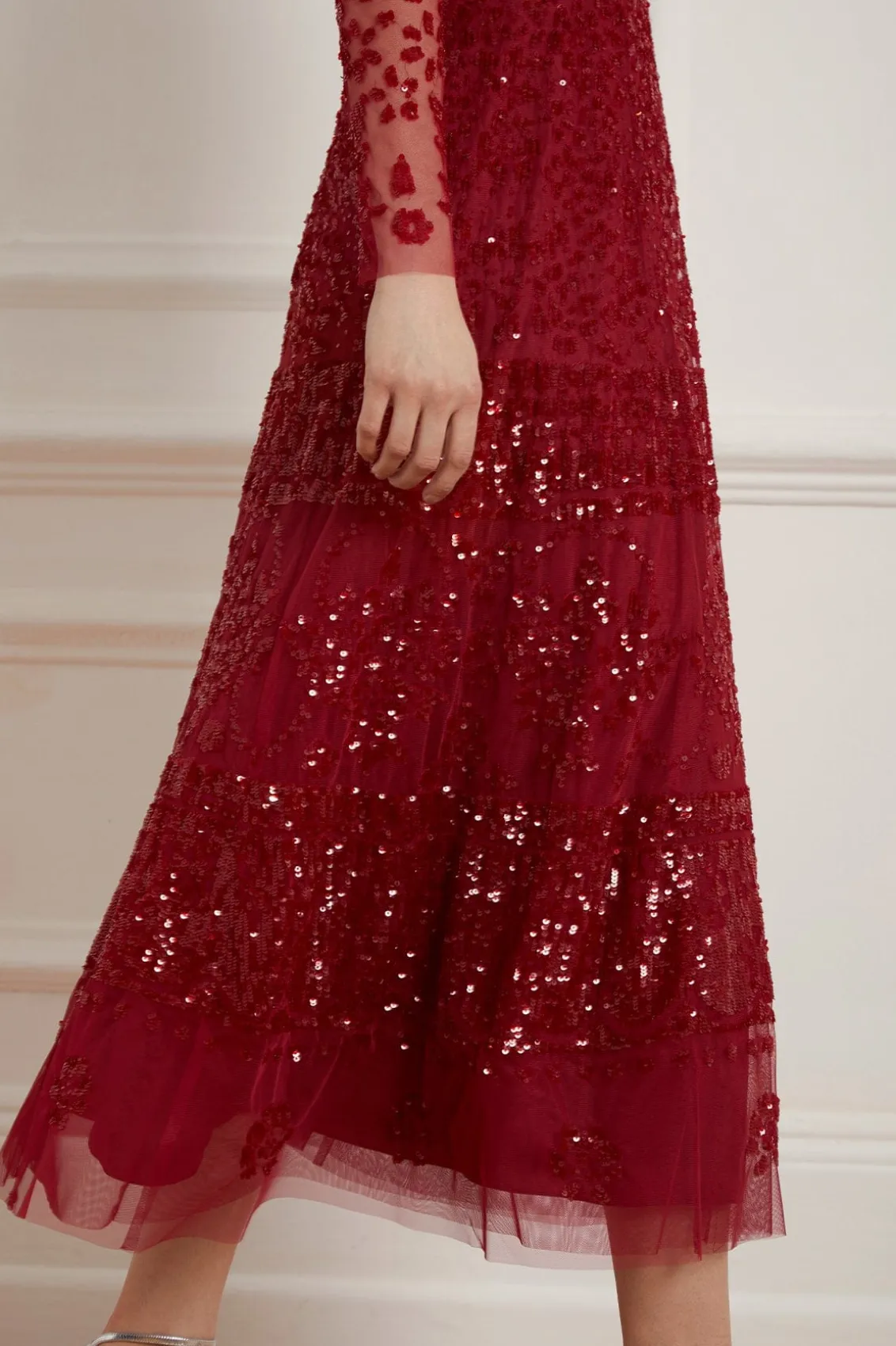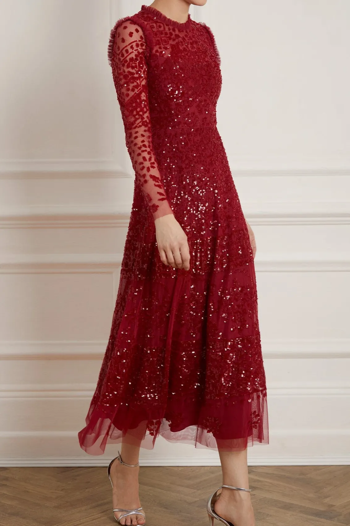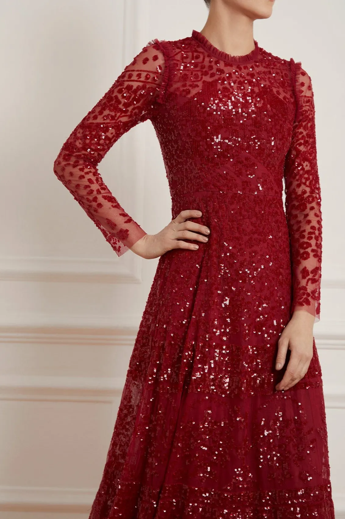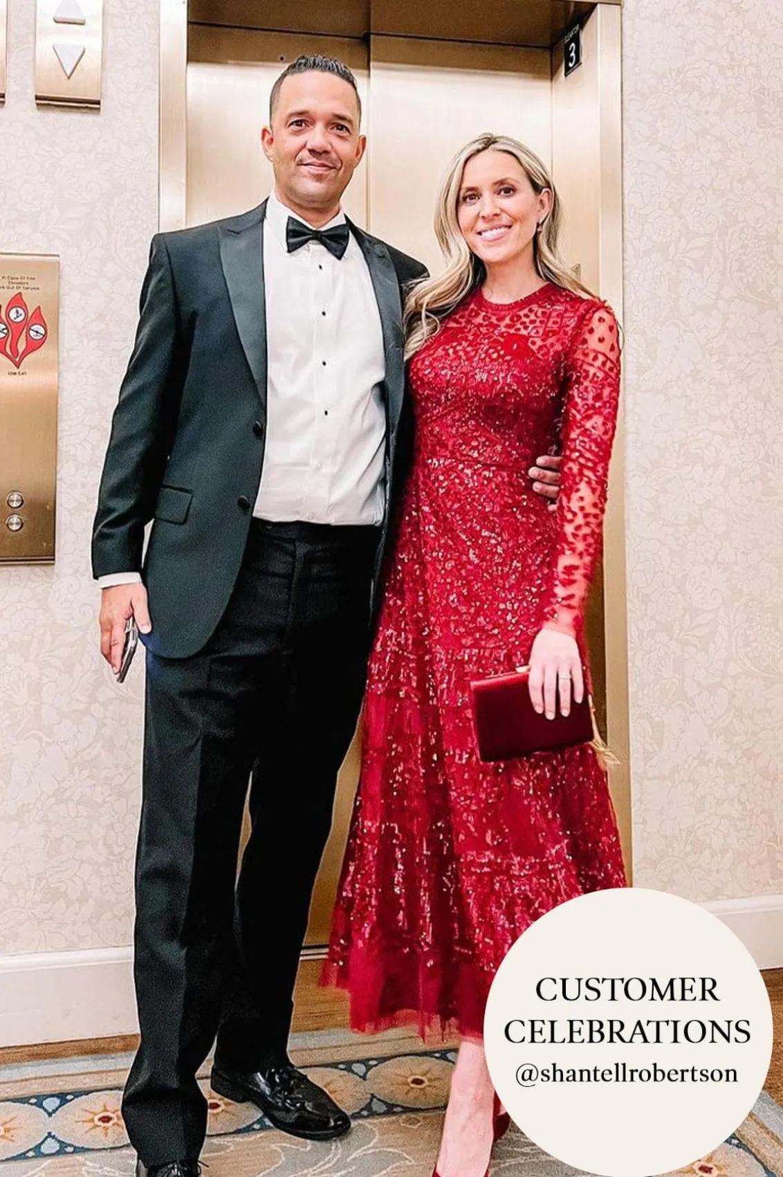 – Form fitted bodice, fitted sleeve with a multi-layered full skirt- Delicate dry clean only