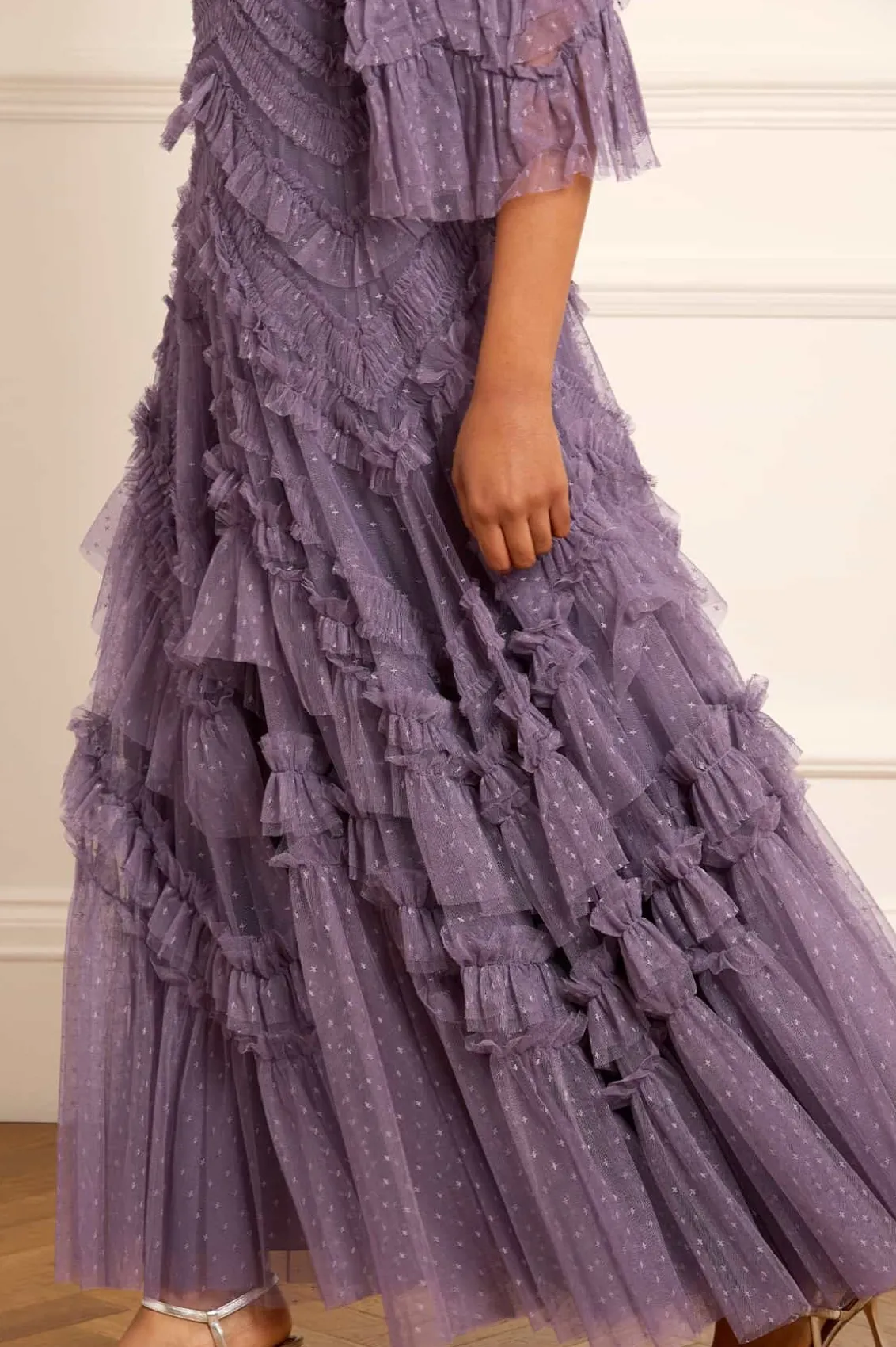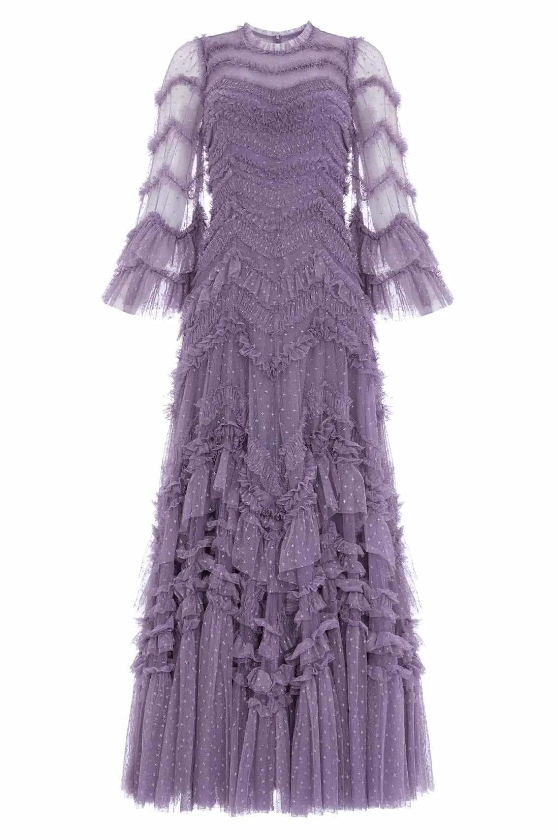 The Elia Long Sleeve Gown in Amethyst. This textile gown is beautifully designed with soft, delicate tulle ruffles that gradually increase in size towards the hem. Crafted with romantic, frothy fluted sleeves and developed using layers of soft tulle trimmed with frills, adding to this statement look. The skirt is made up of generous layers of net and tulle with a sweeping hemline. Expect all eyes on you in this statement style.