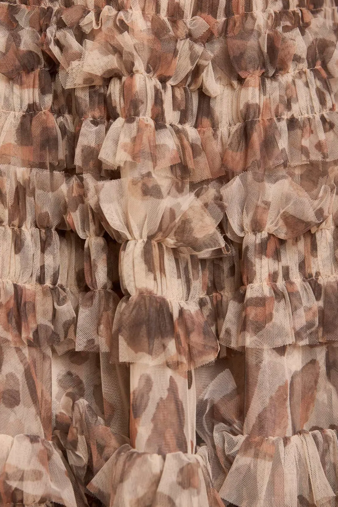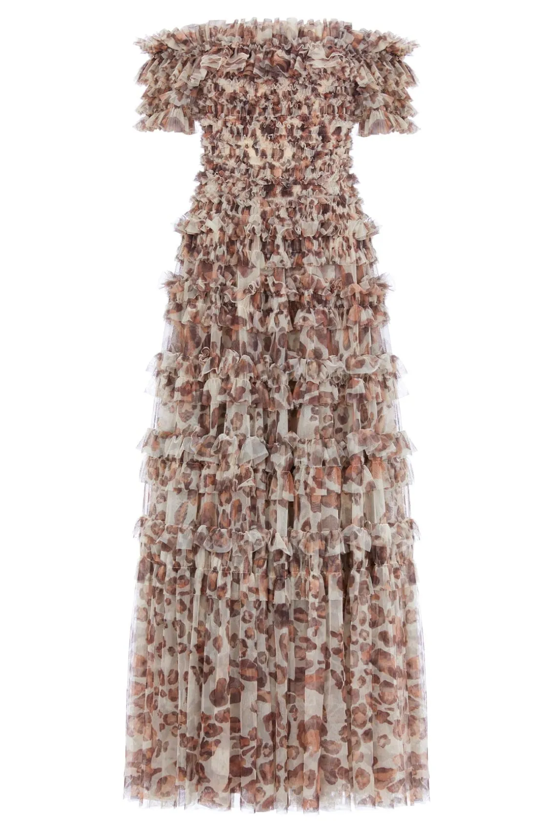 The Leopard Lisette Off-Shoulder Gown in Moonshine. This dress features a statement print that was hand-painted in-house using watercolour, with soft leopard motifs varying in scale and showcasing watery definition. This statement gown has an elegant off-the-shoulder design inspired by Hollywood styling. Crafted with textile tulle and double-stitched frills for a dramatic, romantic effect. Features an integrated corset for a perfect fit and to hold the silhouette. Expect all eyes on you in this romantic gown.