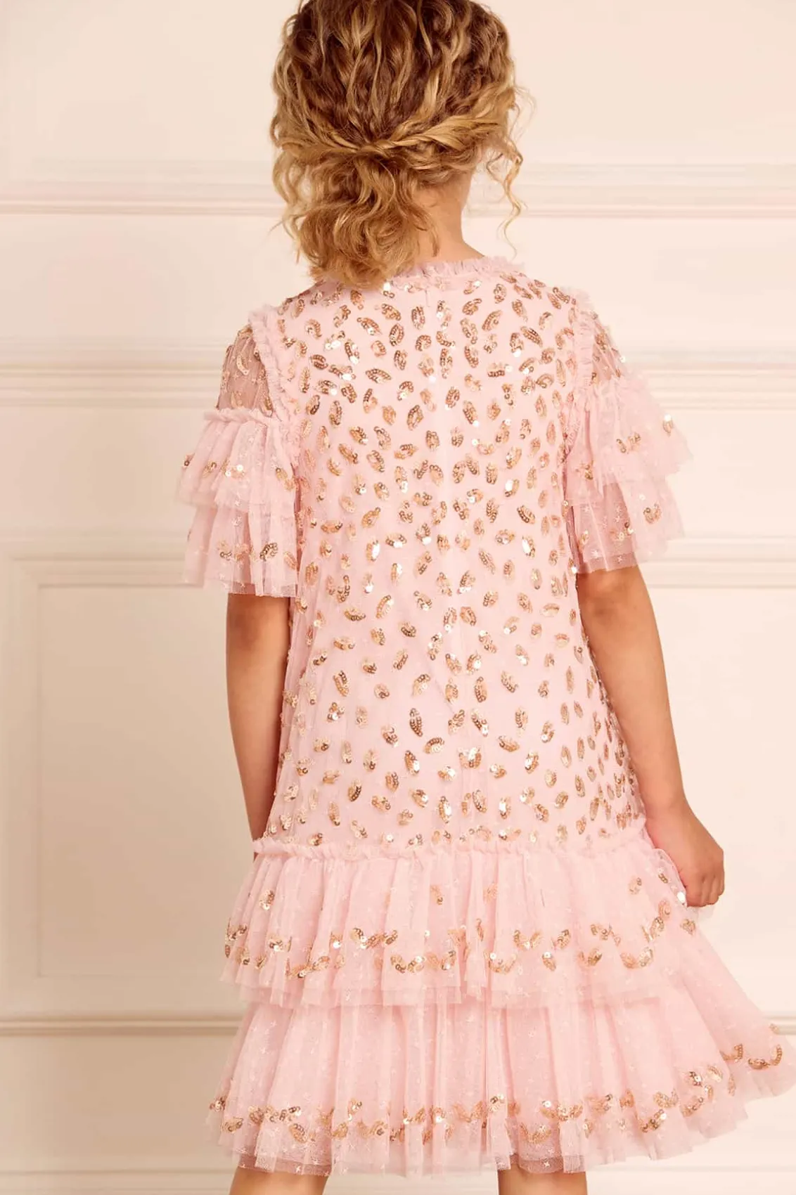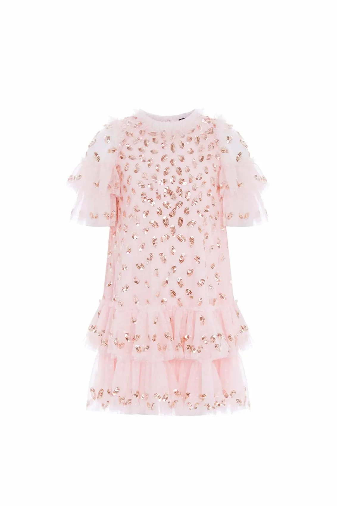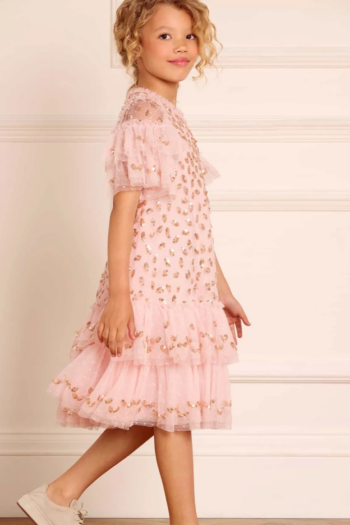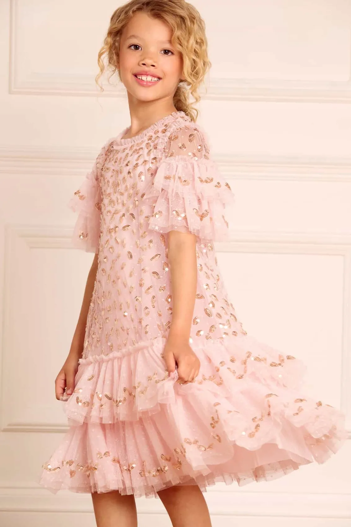 The Autumn Leaves Kids Dress in Dusk Pink / Caramel. This dress is embellished with a glittering leaf motif that disperses down the body of the dress and delicately adorns the frills, creating reminiscent of autumn falling leaves. Beautifully designed in soft tulle, gently gathered tiers at the sleeves and skirt hem create the prettiest, most whimsical style. Crafted with signature Needle & Thread frills adorn the neckline and shoulder. This magical piece will forever be a favourite in your little one’s wardrobe.