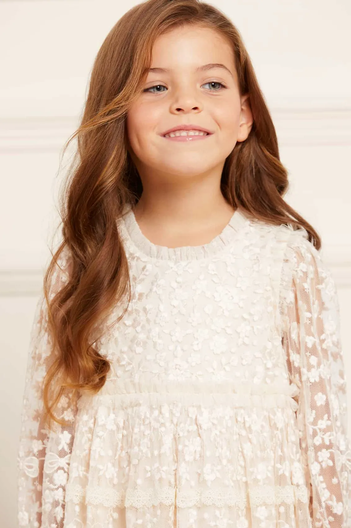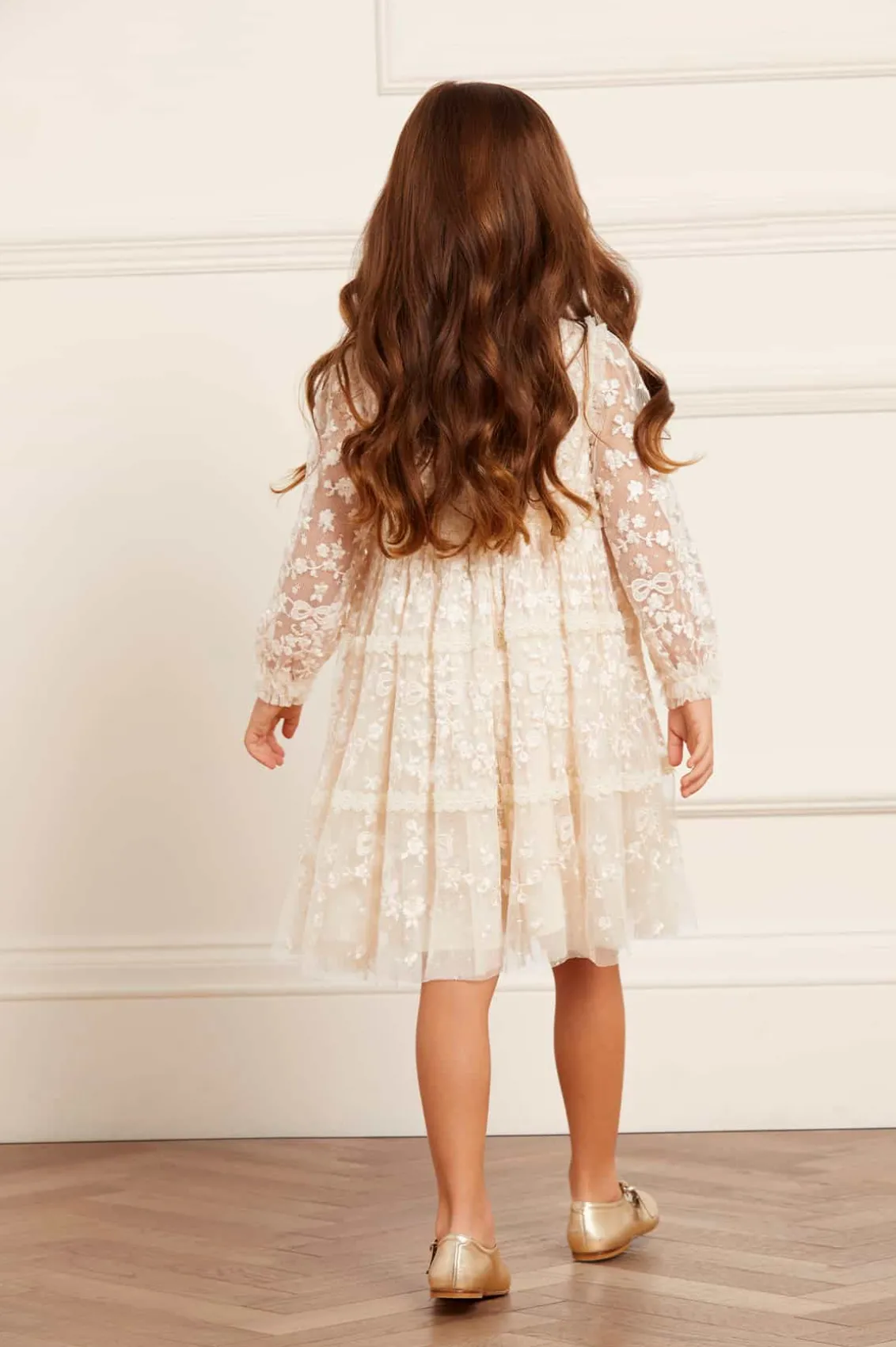 The Celestia Ribbon KIDS Dress in Champagne. This long sleeve dress is beautifully decorated with rich embroidery inspired by vintage lace, featuring delicate flower motifs and ribbon bows throughout. Intricately designed with lace trims for signature Needle & Thread detail. Crafted from a delicately textured tulle fabric base, with a playful tiered skirt for volume and movement. A truly magical piece.