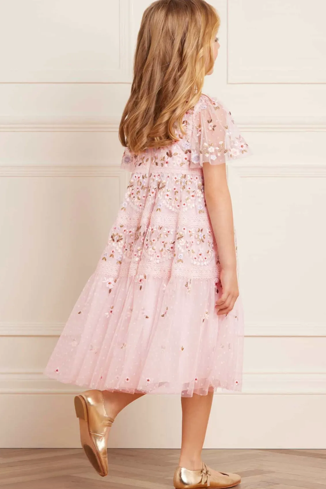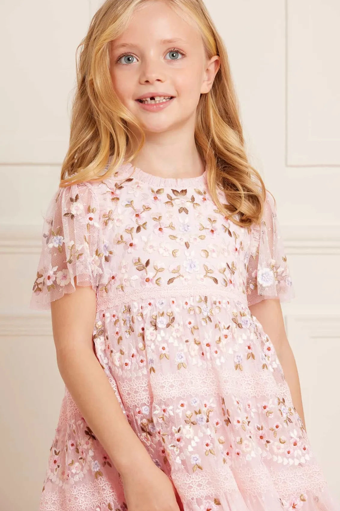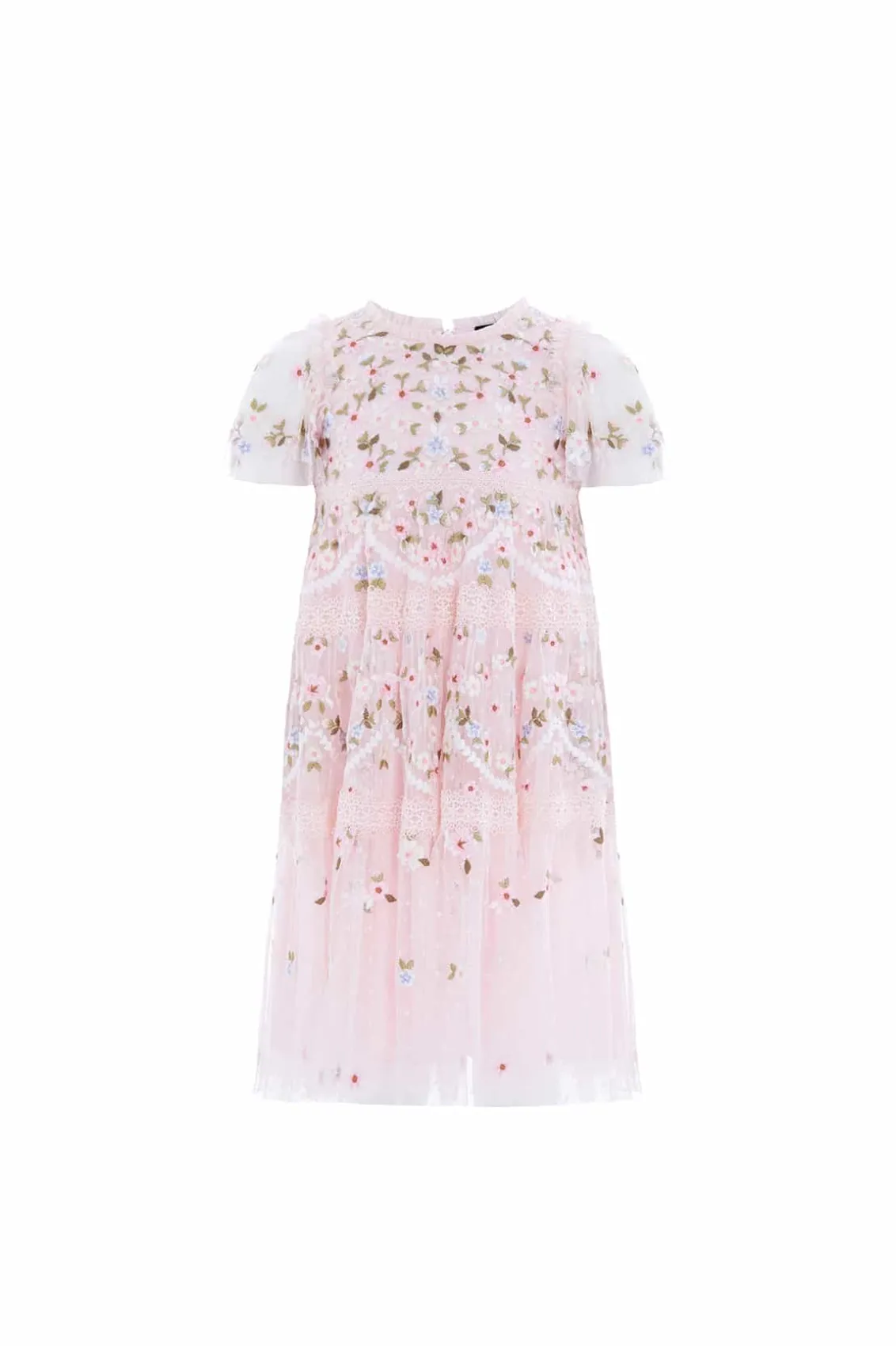 The Garland Ribbon KIDS Dress in Peony Pink. This dress is designed with embroidery inspired by Victorian lace trims. Featuring pretty intertwined lace borders in soft pastel floral motifs, accented by fresh white highlights. The skirt features tiers of fabric adorned with signature Needle & Thread detailing. The perfect fairytale piece for all your little one’s special occasions.