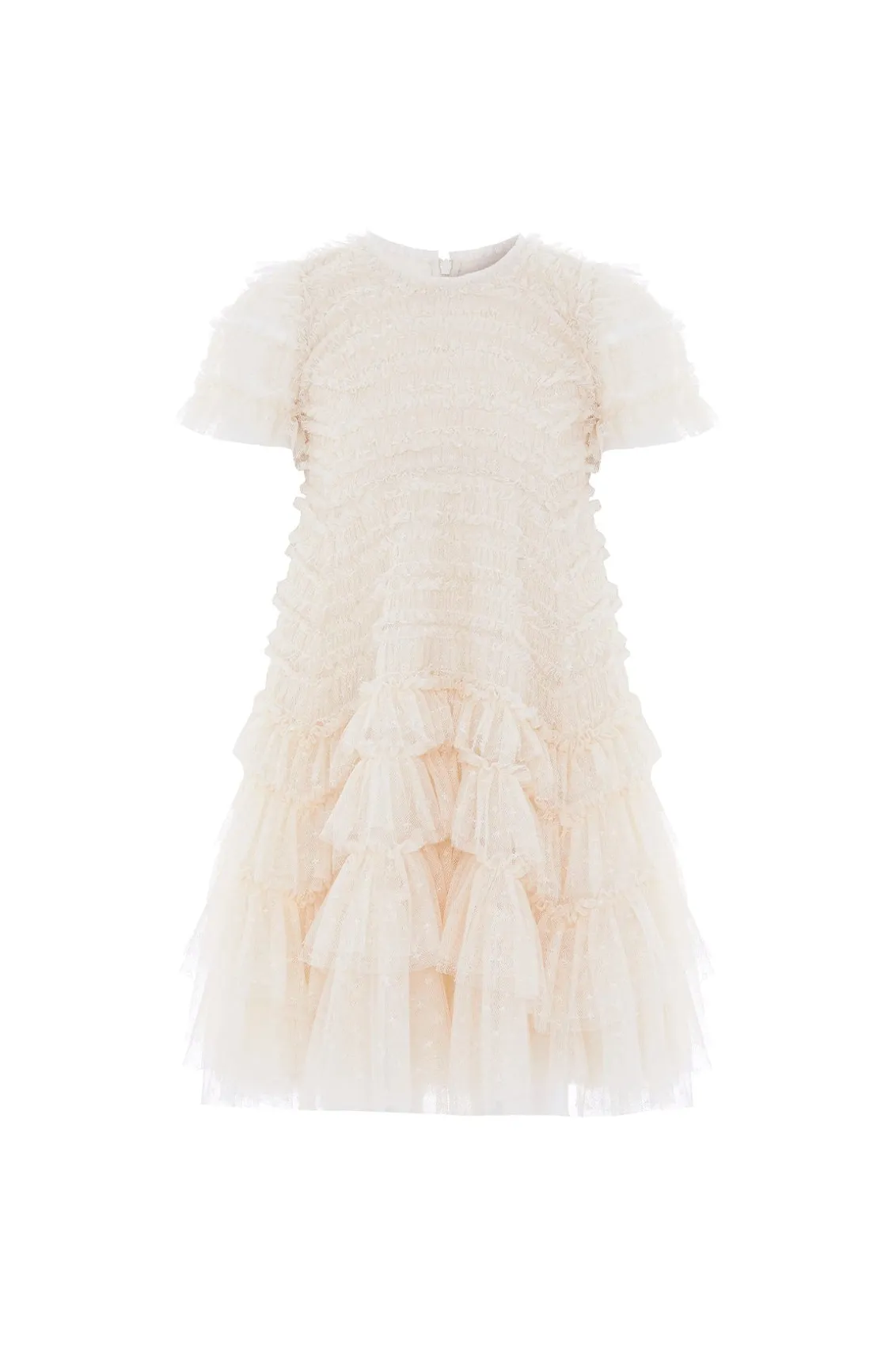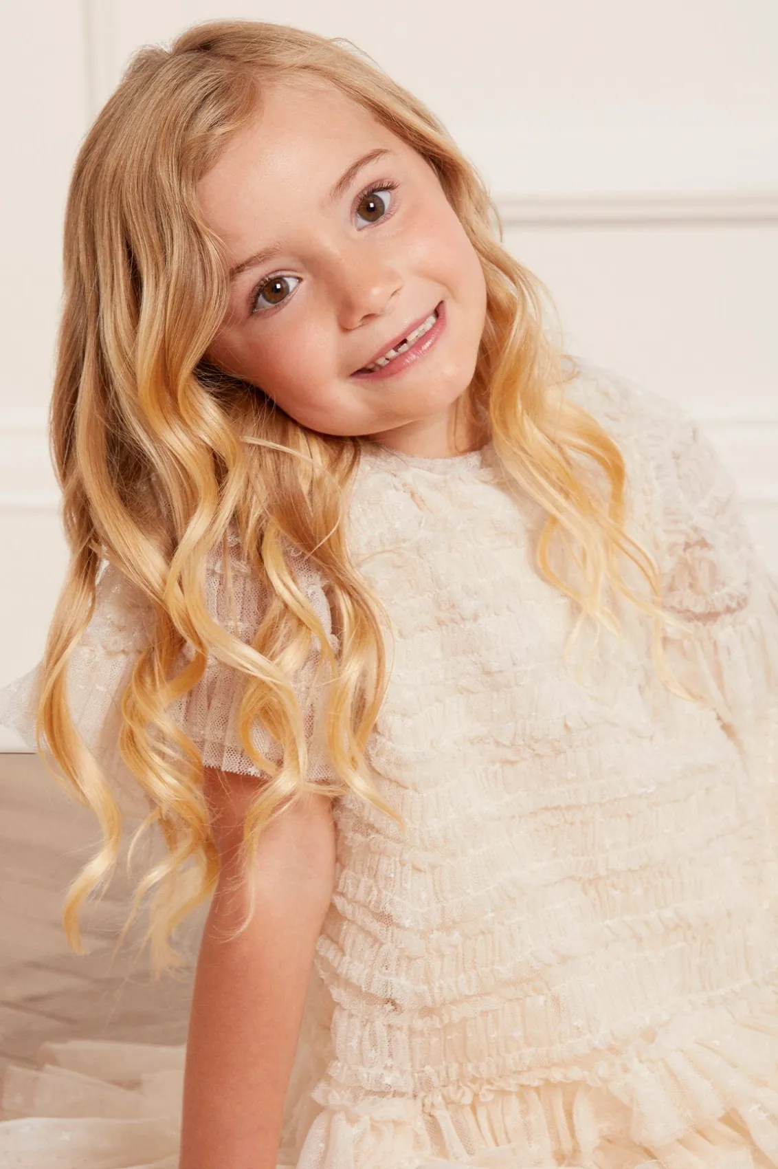 The Valentine Ruffle KIDS Dress in Champagne. This dress features a pretty floral bouquet print, taken from a 1900’s hand painted artwork. This signature Needle & Thread style is developed with ‘x’ kisses tulle and ruffles throughout. The ruffles are smaller around the neckline and bodice, increasing in size towards the hem to create playful volume. Let your little one make a statement in the Valentine.