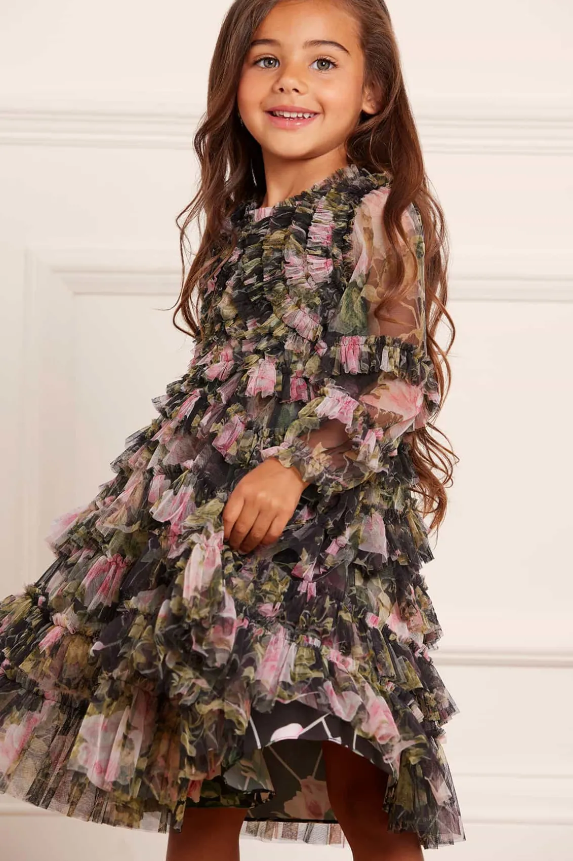 NEW SEASON. The English Rose Ruffle KIDS Dress in Graphite. This dress features a traditional rose print, inspired by a 1900’s hand-painted artwork. Engineered with delicate frills and developed in soft pink hues for a pretty, feminine look. Make the English Rose a new wardrobe favourite.