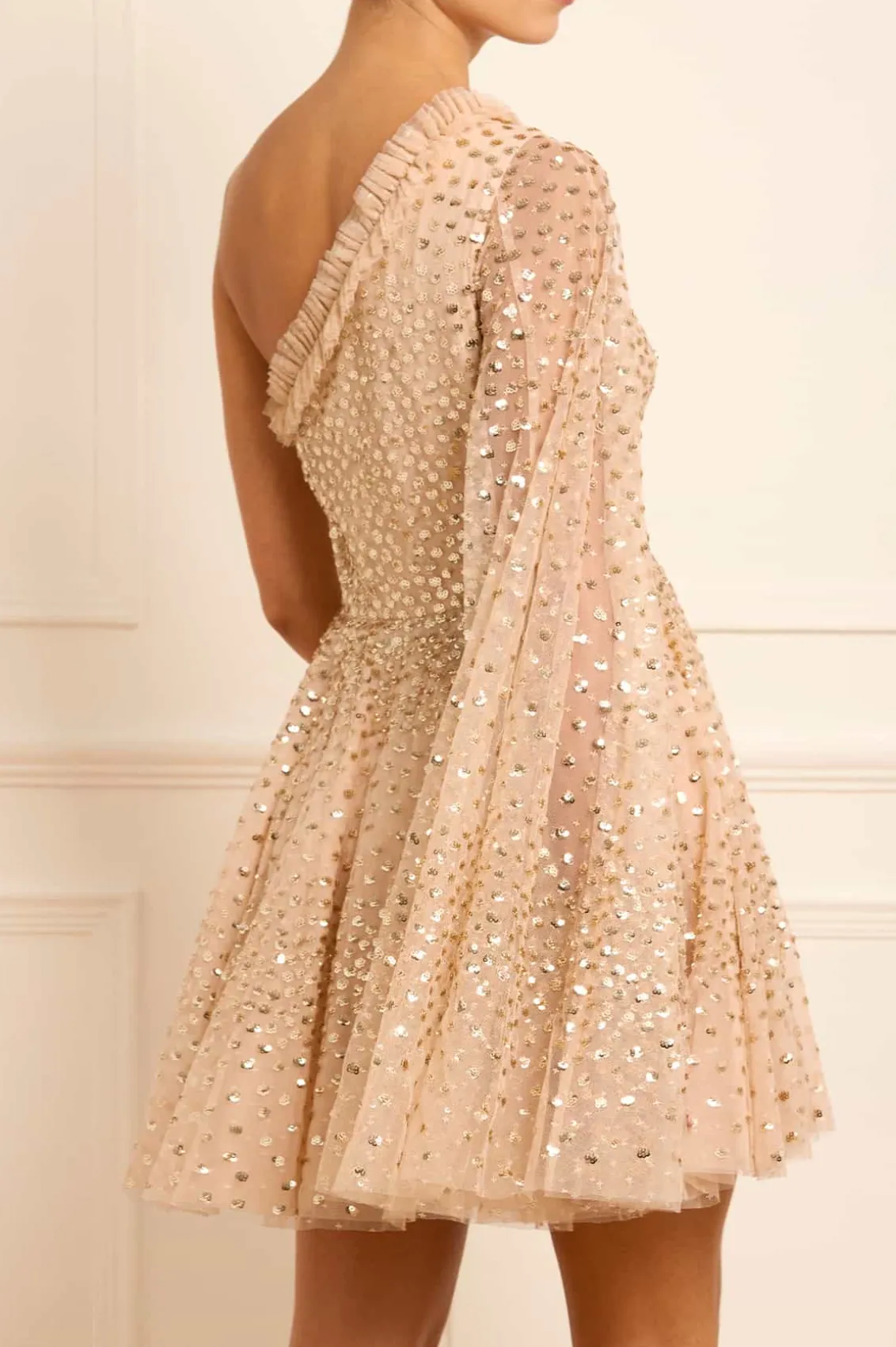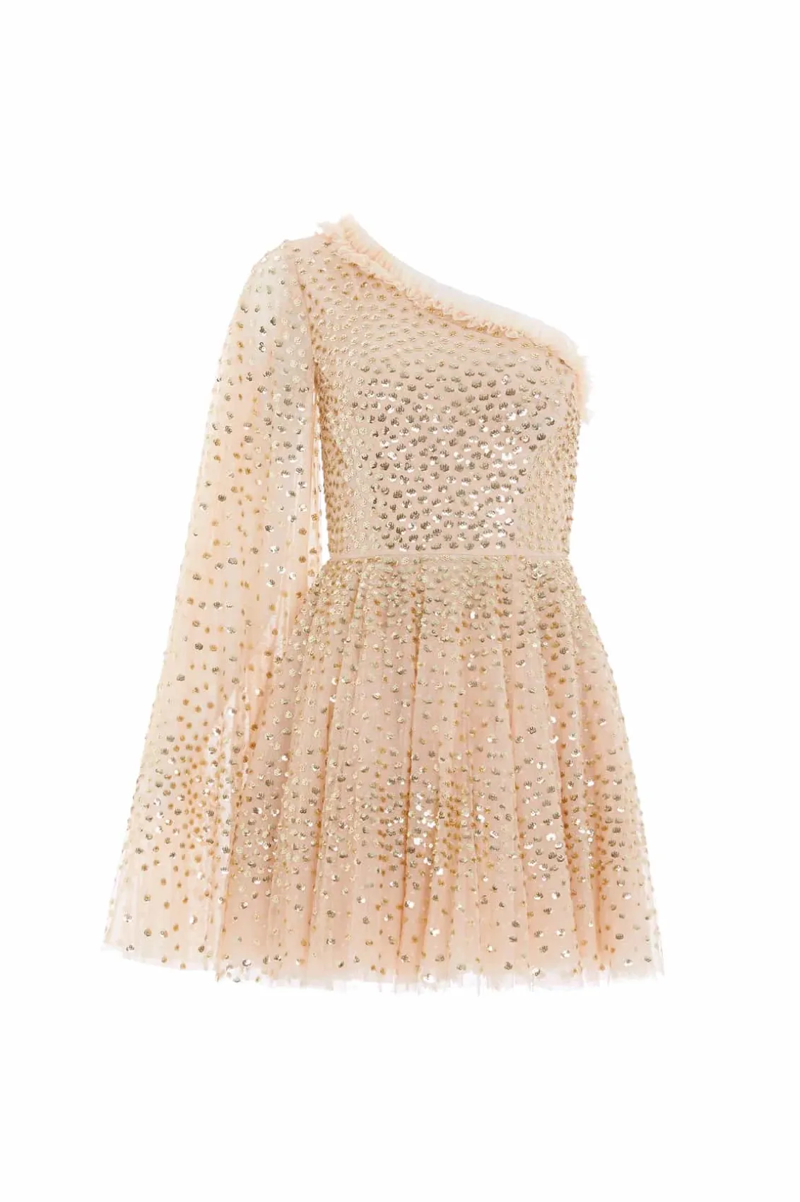 NEW SEASON. The Scatter Dot One-Shoulder Mini Dress in Antique Gold. This embellished dress is decorated with exquisite shimmering dot motifs, undulating in wave formations for a captivating glittering effect. This dress features a sweeping floor-length cape sleeve for romantic detailing and a statement look. The flattering one shoulder neckline is trimmed with signature Needle & Thread tulle frills. The skirt is made up of generous layers of net and tulle with sweeping hemline. The perfect dress for an upcoming special occasion.