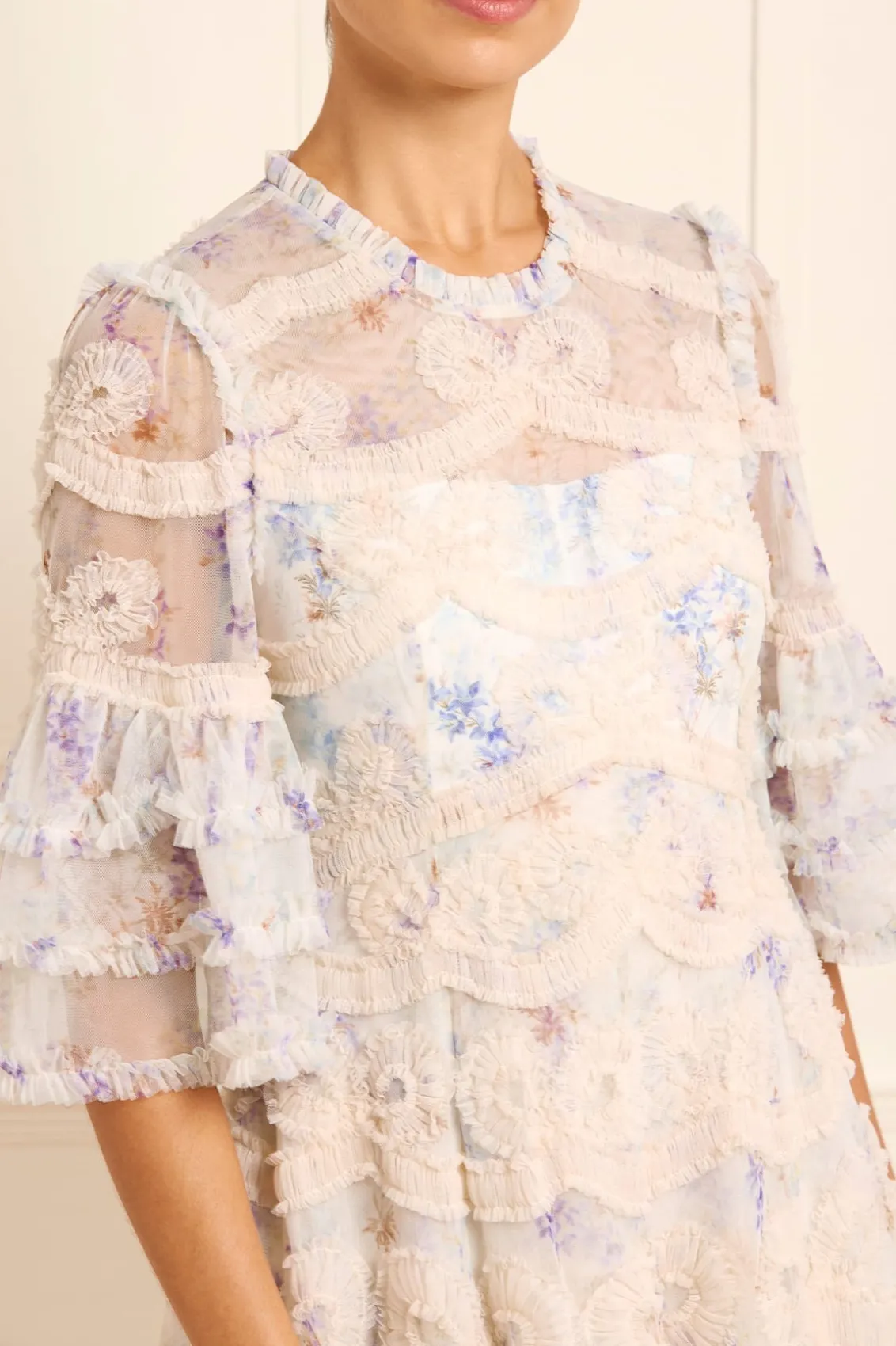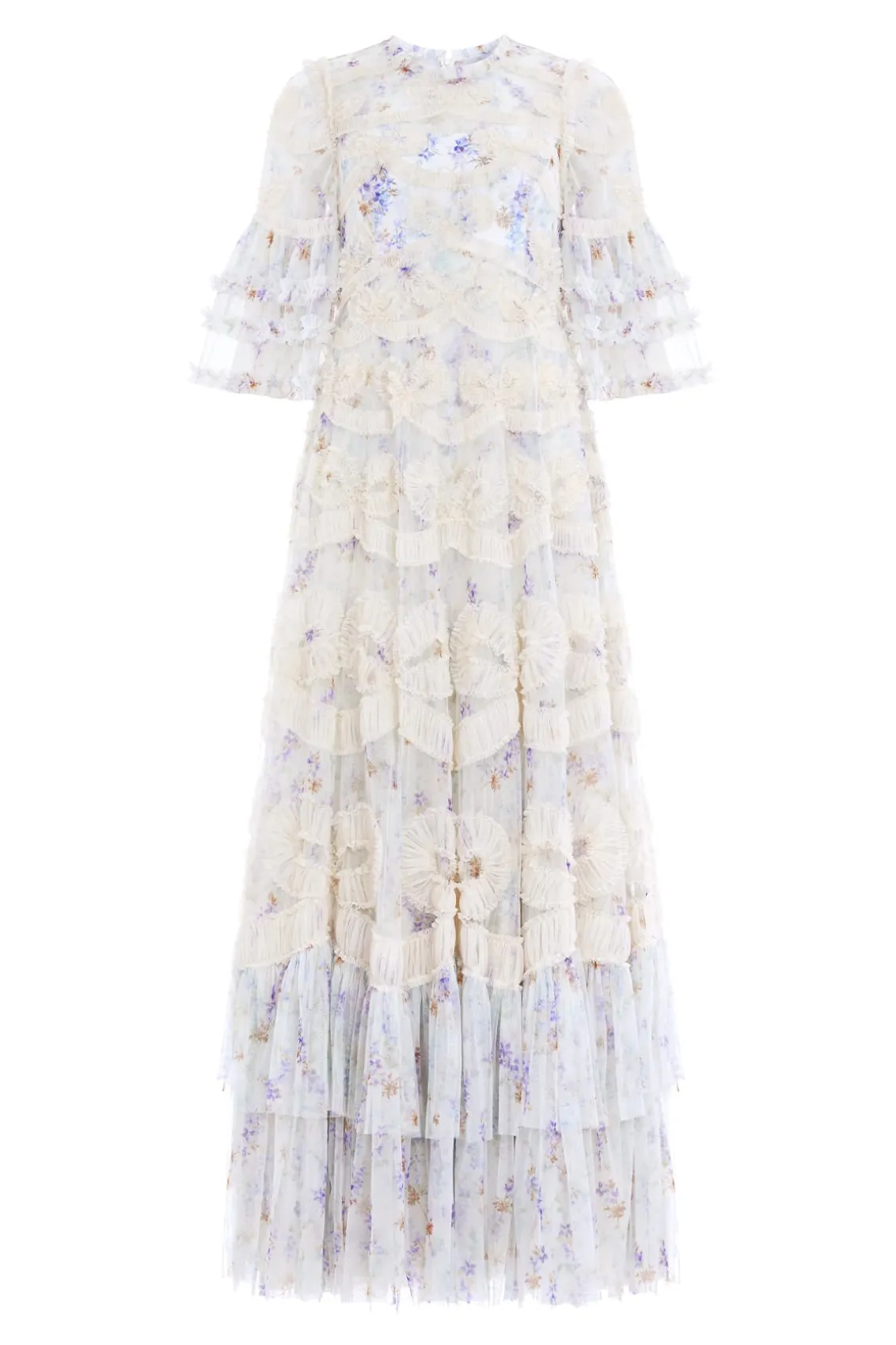 NEW SEASON. The Ophelia Ditsy Ingrid Gown in Moonshine/Blue. This beautiful, romantic trailing print was taken from an archive, and hand-painted artwork from the early 1900’s depicting soft whimsical ditsy, floating florals. This iconic Needle & Thread style is beautifully engineered with delicate tulle and subtle texture to capture this ribbon motif. A gown you’ll forever treasure.