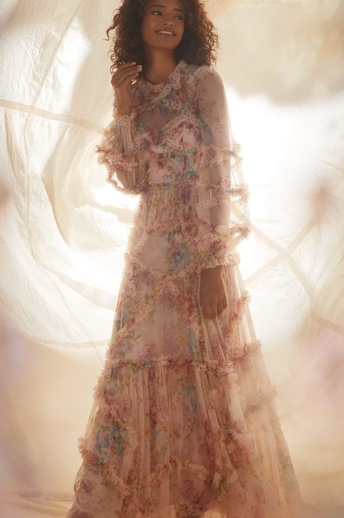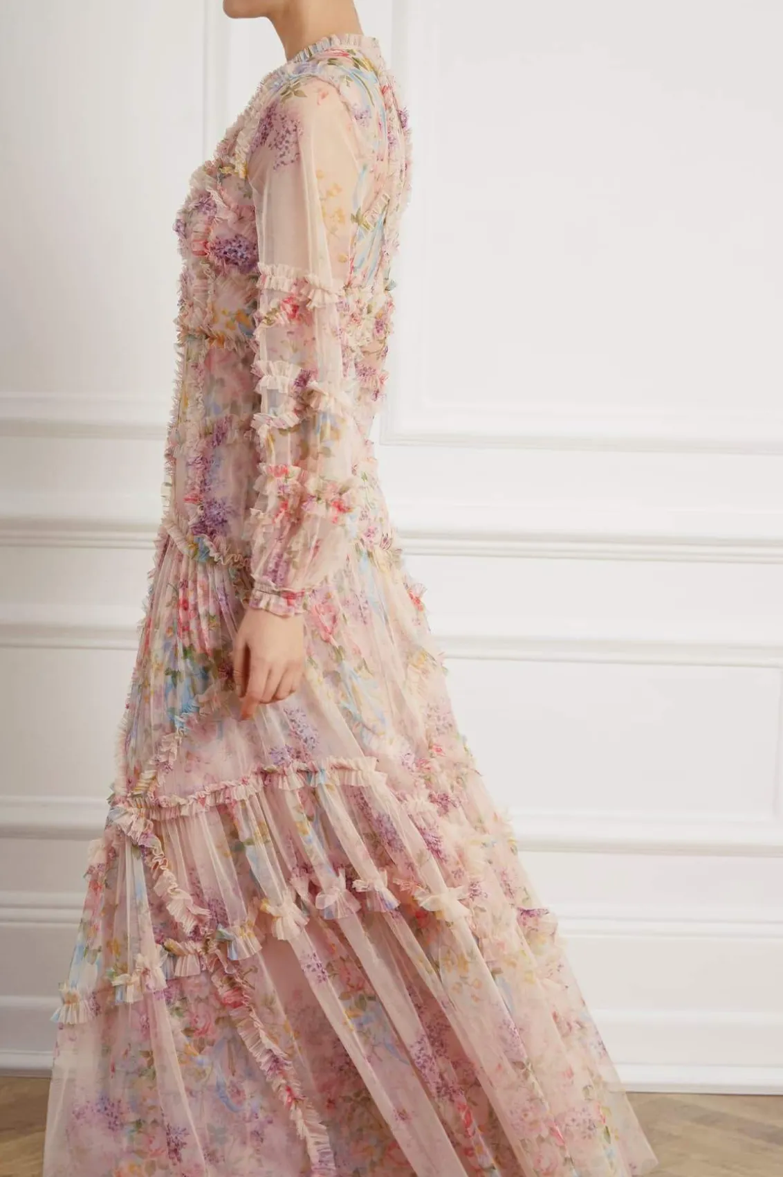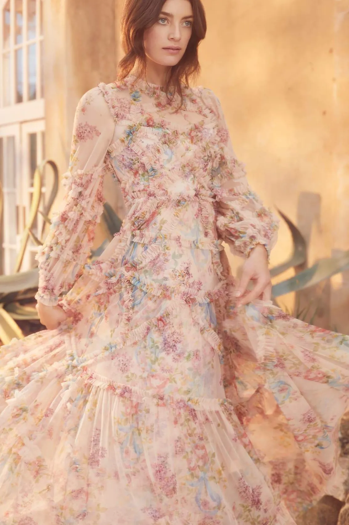 – Form fitted through the bodice with a relaxed fitting sleeve and a multi-tiered full skirt
