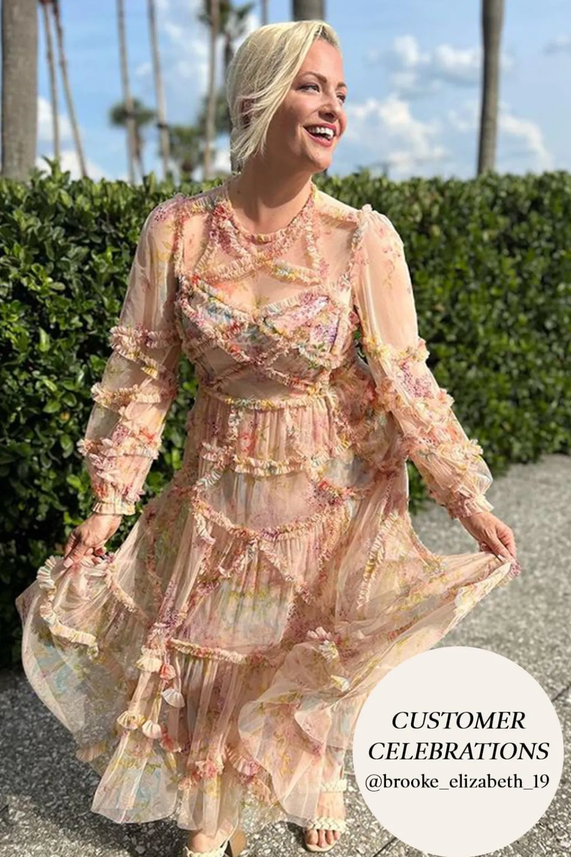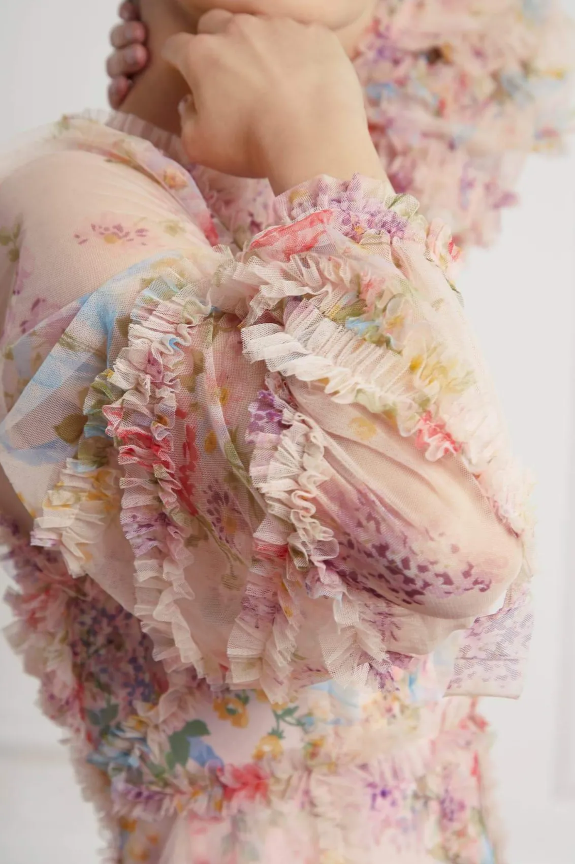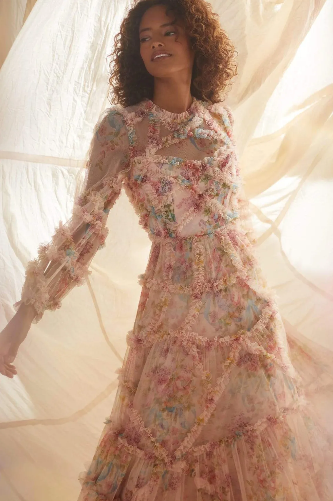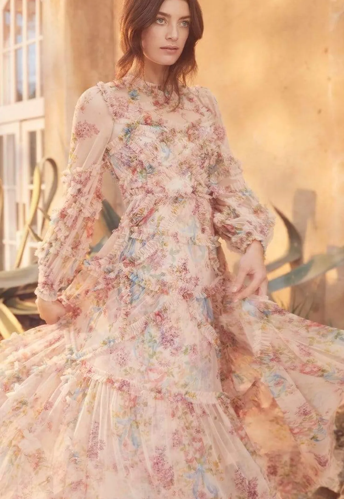 – Form fitted through the bodice with a relaxed fitting sleeve and a multi-tiered full skirt
